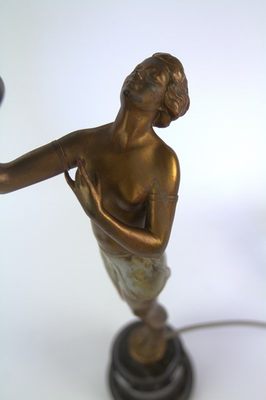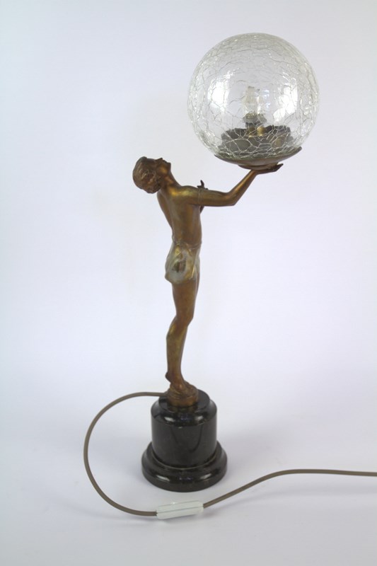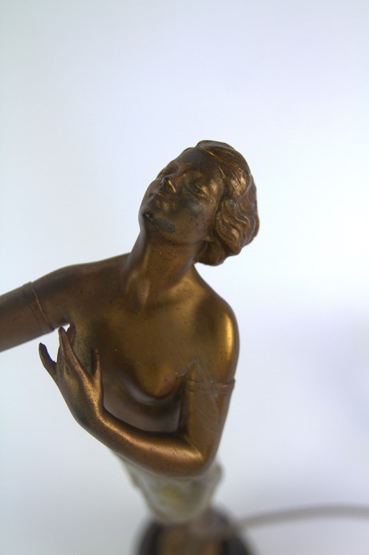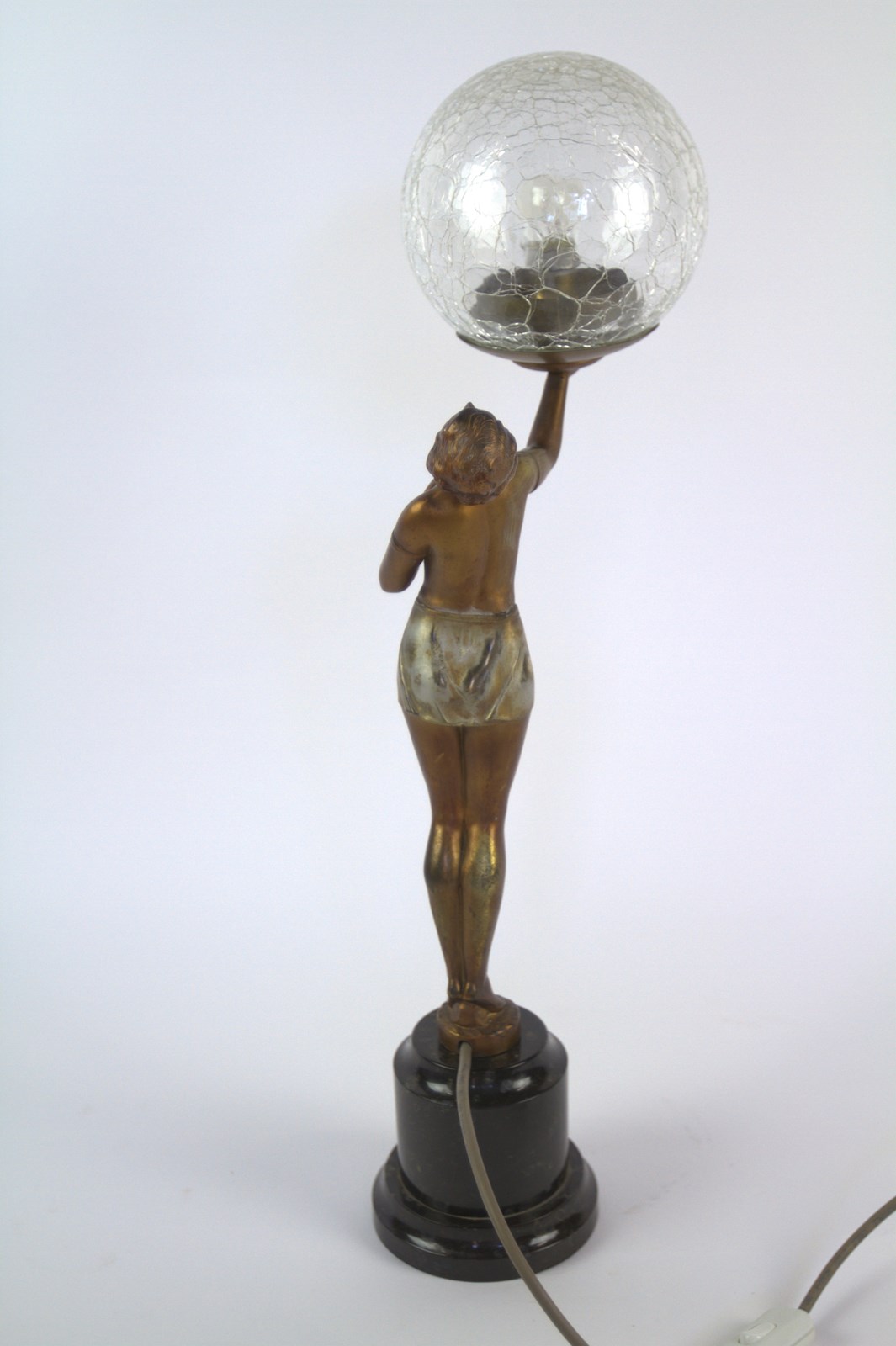 Art Deco Spelter Lady Lamp circa 1930s. Gold Colour with silver Skirt. Standing on Black Marble circular base. Recently Re wired & Pat Tested. Clear Crackle Glazed Shade. Good original condition. Slight wear on skirt.