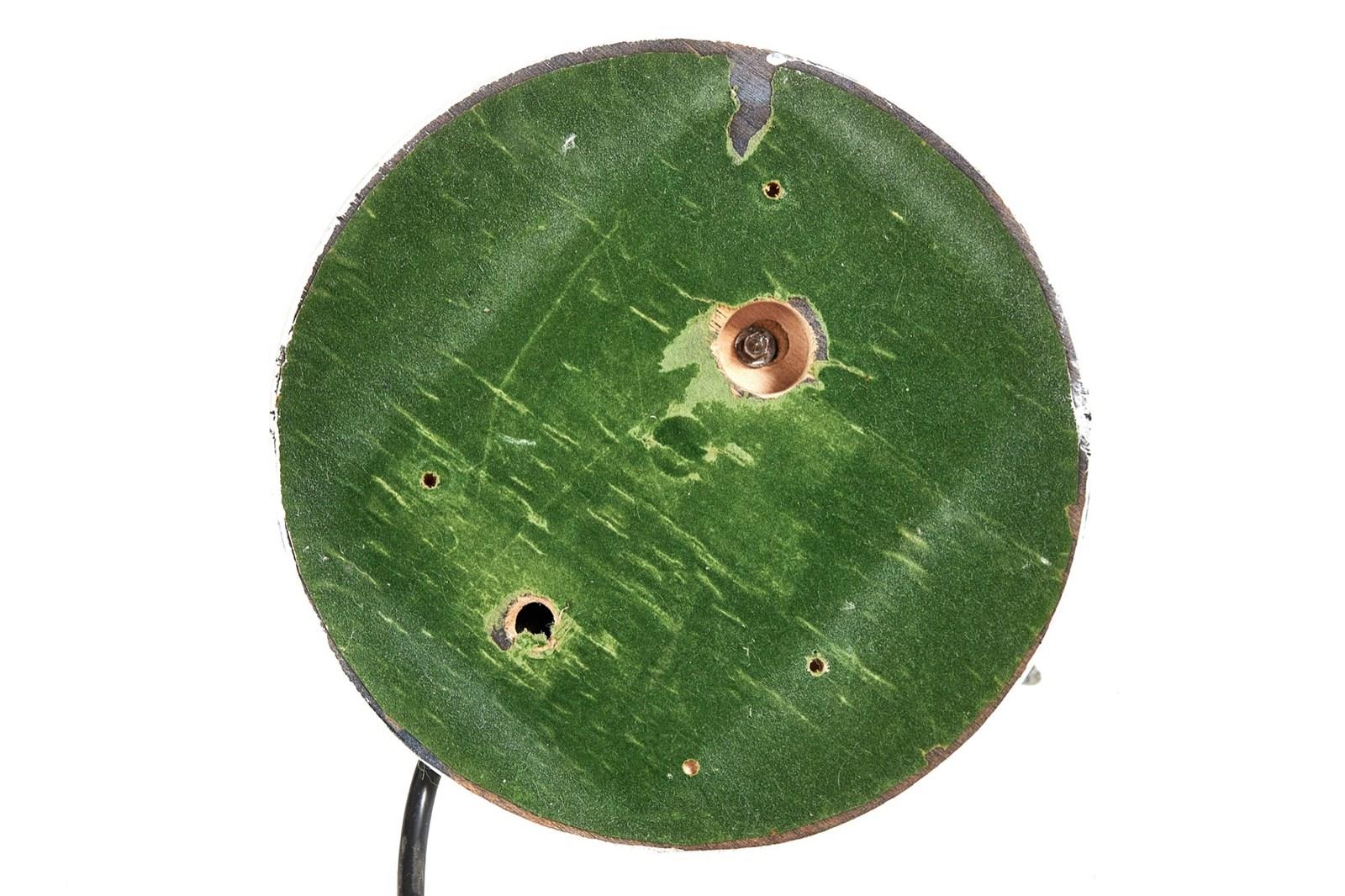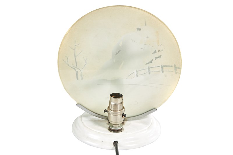 Art Deco spelter lady Skater lamp with snow scene painted shade. Silver painted Spelter lady Skater figure, circular disc painted shade depicting snow scene with road, tree, fence, with church at top of hillside, nickel plated bulb holder, cream painted wooden base, lamp in working order, with electrical pat tested label 3/9/20.