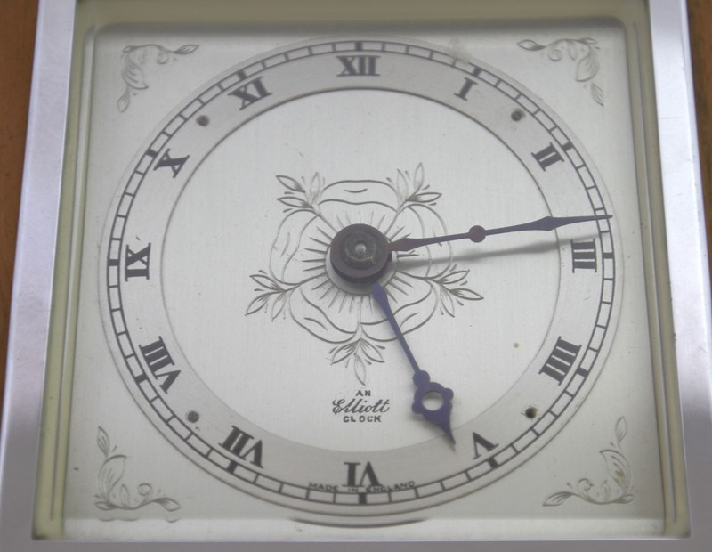 fine art deco walnut mantle clock by Elliott of London, square centre dial, chrome frame around bevelled glass. 8 day lever platform movement, silvered chapter ring, curved sides with burr walnut fronts, sitting on 4 chrome slab feet, good quality clock, keeps good time