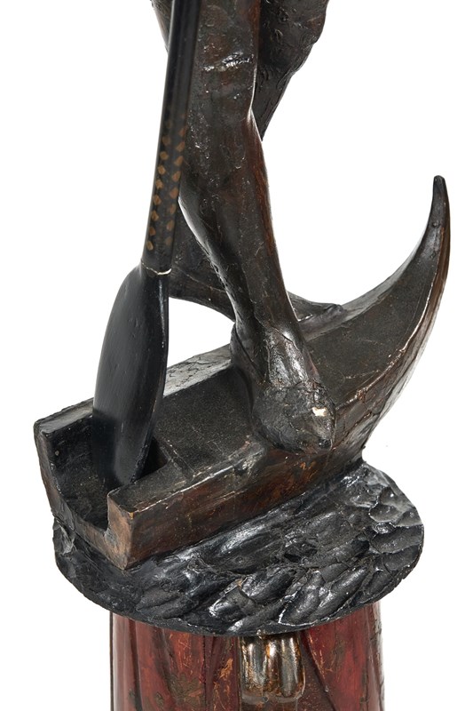 Gondolier, Holding a paddle & Cornucopia shaped holder for Candle. Standing on part gondola, The Separate Tapering Cylinder Column on 3 Bun Feet.