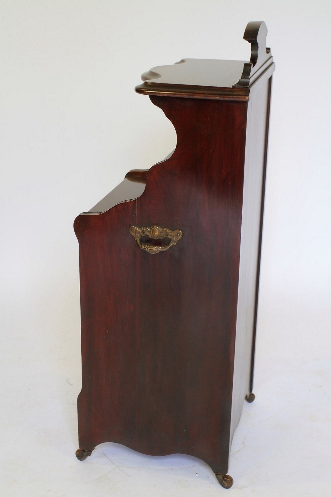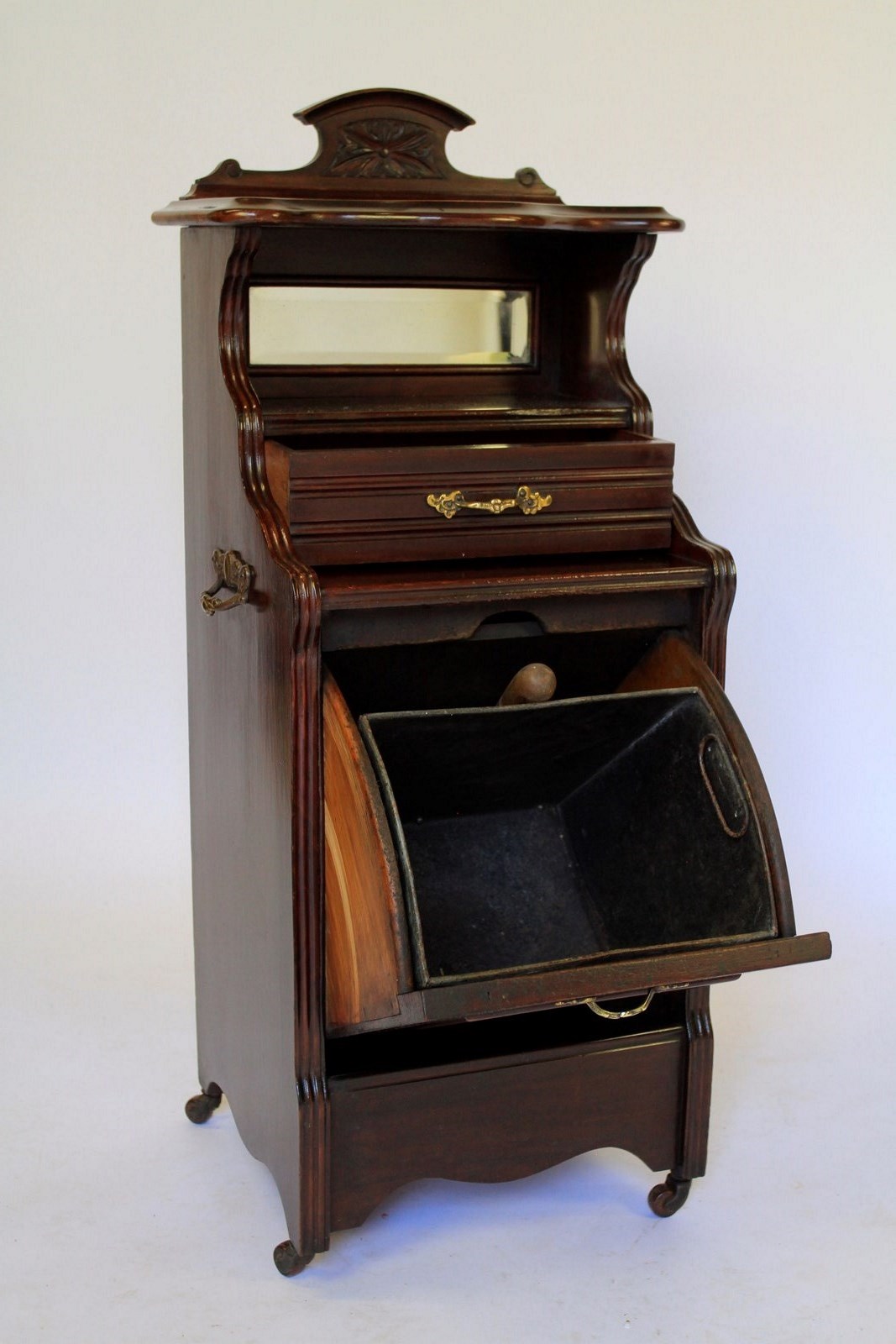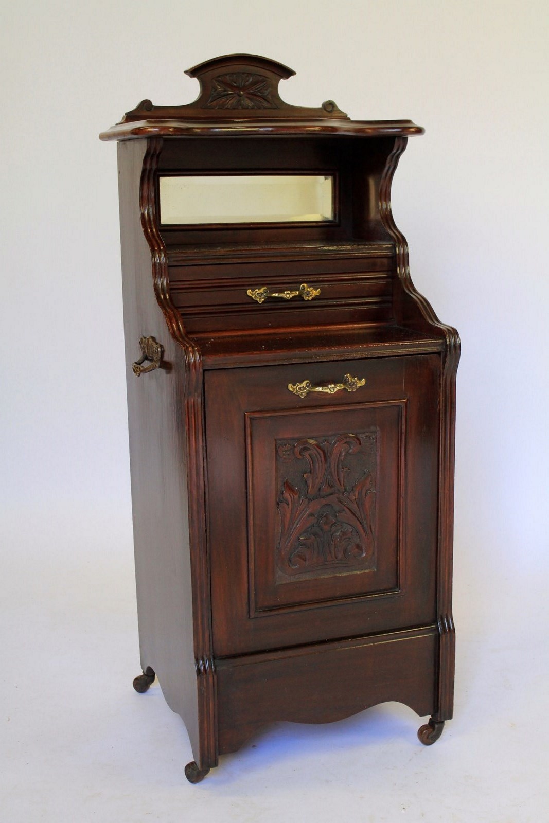 Edwardian Mahogany & carved Coal Purdonium. Mahogany shaped top shelf with carved back panel. Inset mirror back, single drawer with gilt brass handle. Fall down front beneath with carved panel & gilt brass handle. Holding coal bucket & brass shovel with turned wooden handle. Shaped plinth with brass castors, brown china wheels. Pair gilt brass carry handles on each side, good quality cabinet.