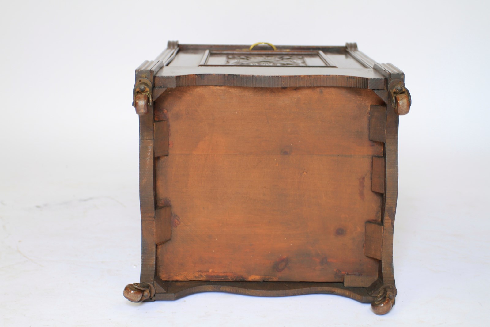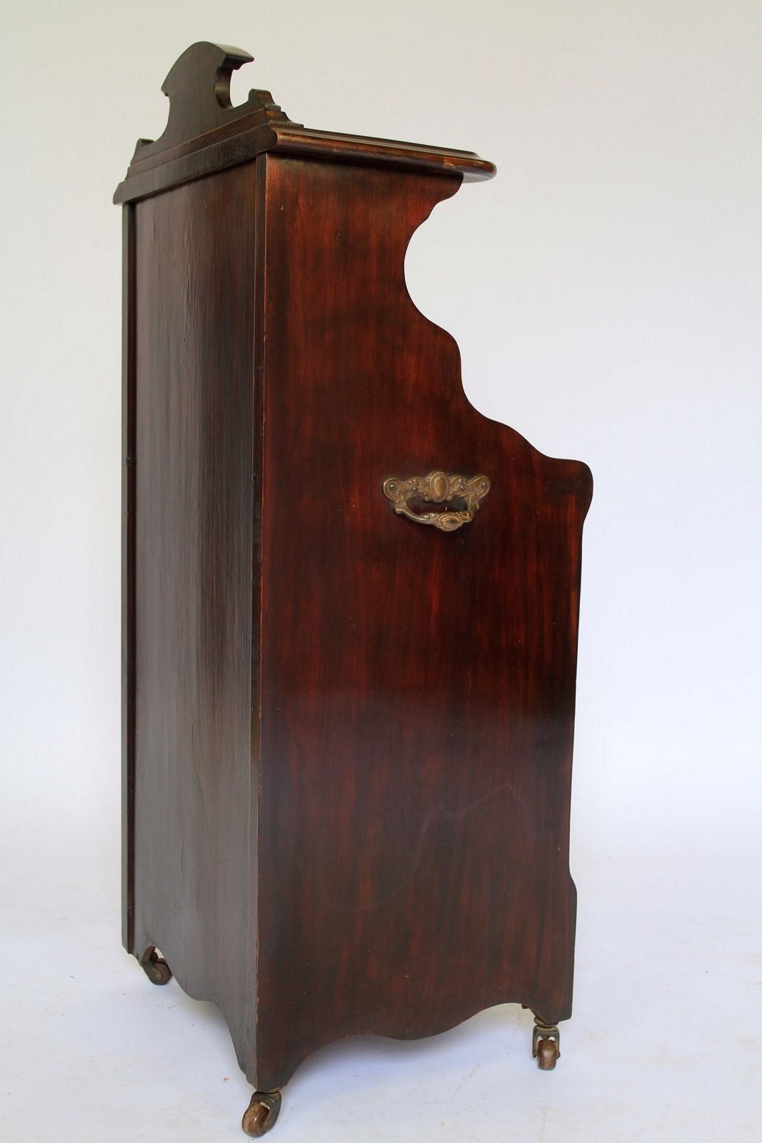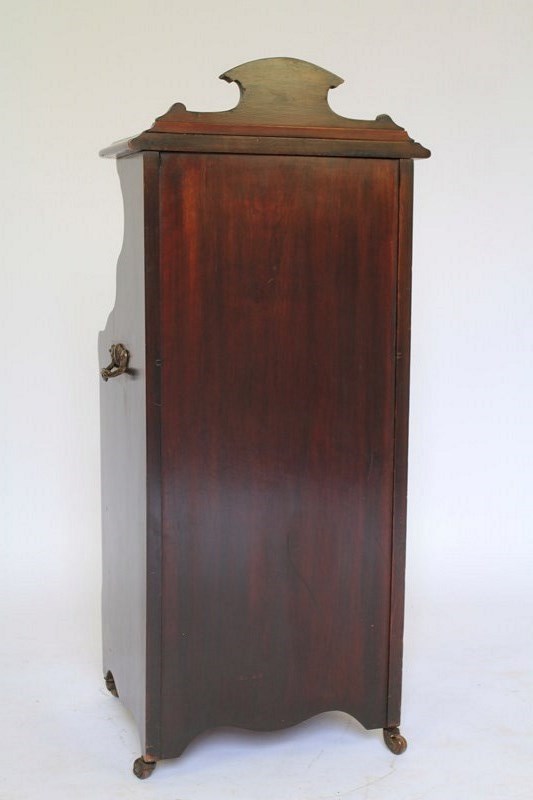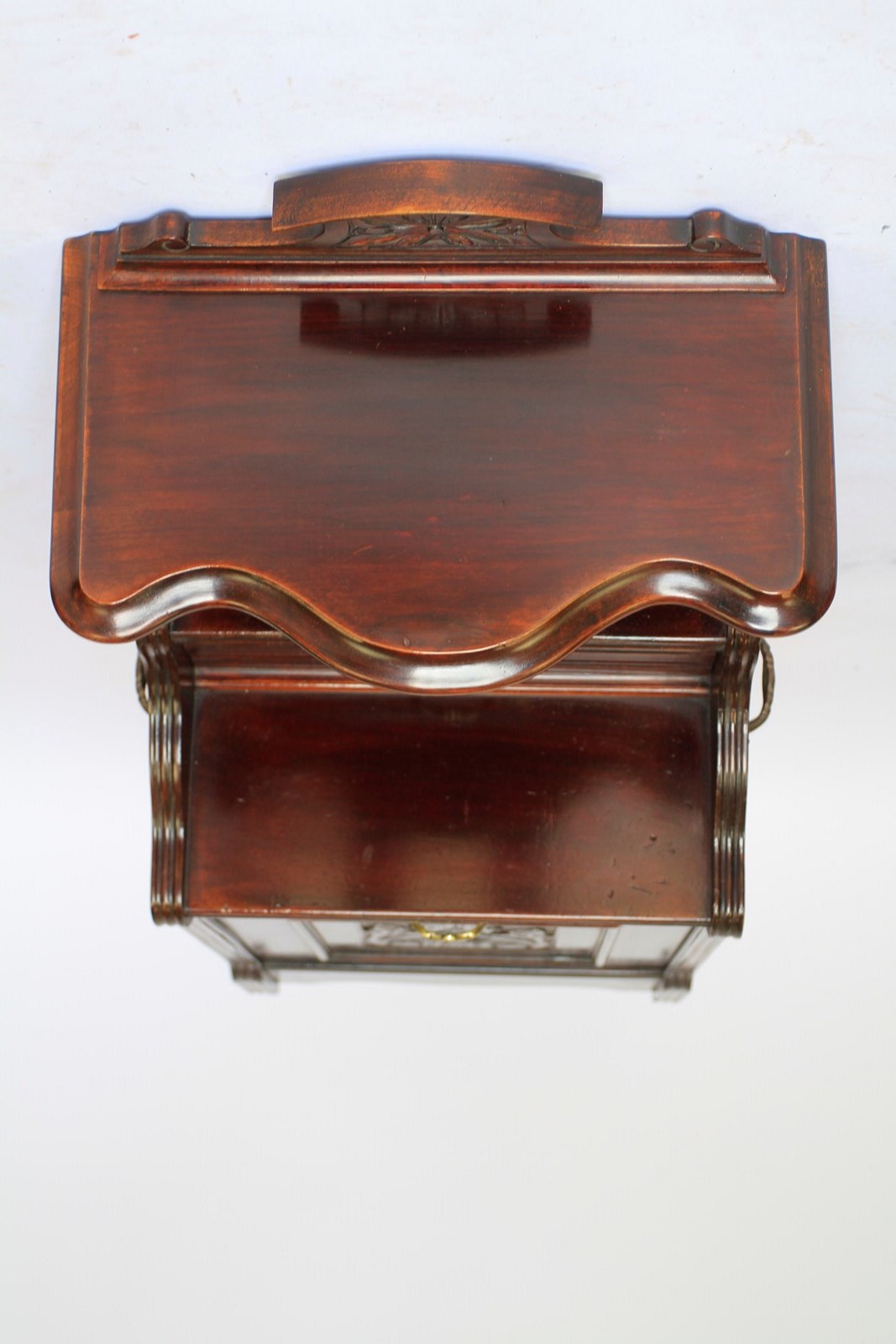 Edwardian Mahogany & carved Coal Purdonium. Mahogany shaped top shelf with carved back panel. Inset mirror back, single drawer with gilt brass handle. Fall down front beneath with carved panel & gilt brass handle. Holding coal bucket & brass shovel with turned wooden handle. Shaped plinth with brass castors, brown china wheels. Pair gilt brass carry handles on each side, good quality cabinet.