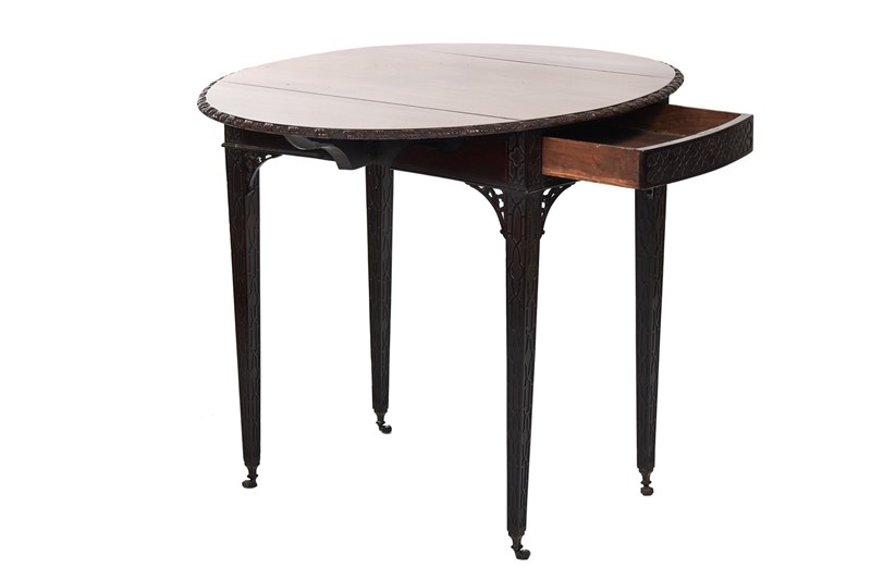 Fine Chippendale Revival Carved Mahogany Pembroke Table circa 1900. Mahogany top with drop leaves, Floral carved detail around edge, Bowfront shaped ends, with single drawer, Blind fret carved detail, 4 tapering shaped legs, with Blind Fret Carved detail. Supported by 8 open pierced carved corner Brackets. Period style brass castors. Very Good quality table. Top, recently polished,