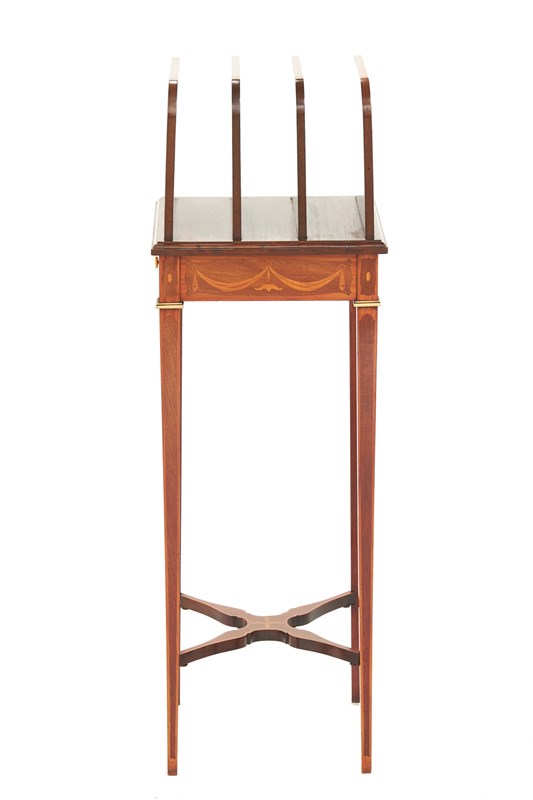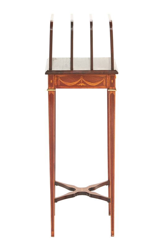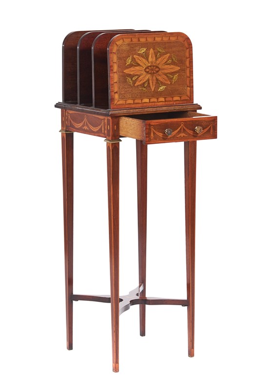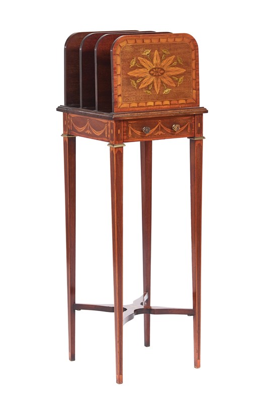 Fine Sheraton Revival Inlaid Mahogany Canterbury on stand circa 1890s with 3 Division top,