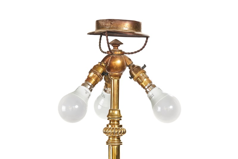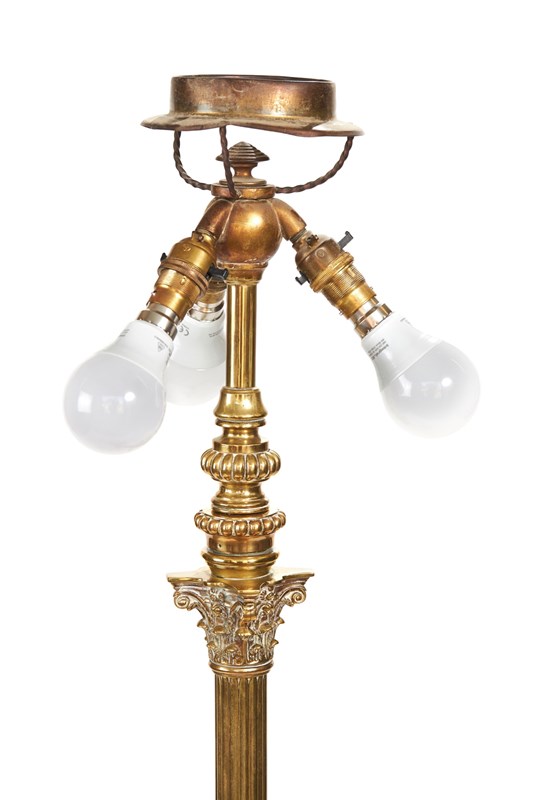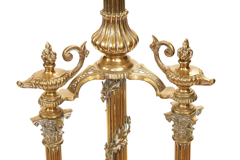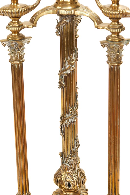 Supporting 3 smaller Corinthian columns, with 3 Aladdin lamps sitting on top. Very fine Brass castings.