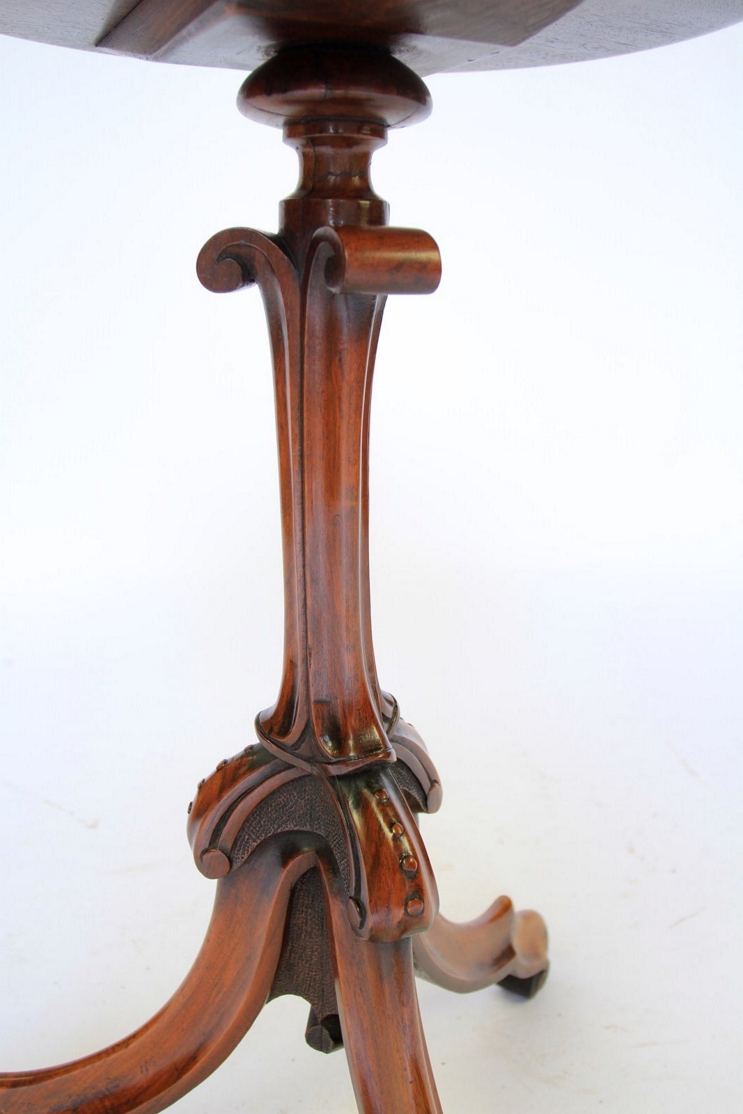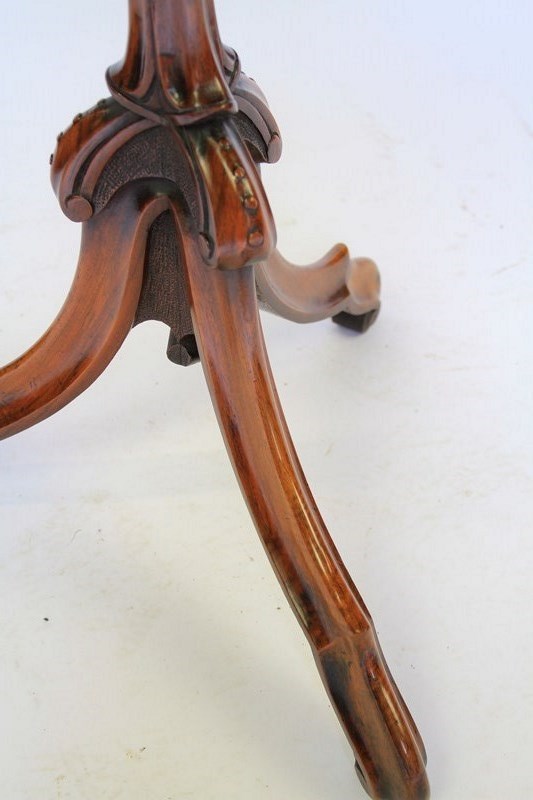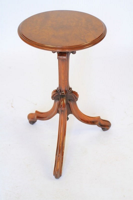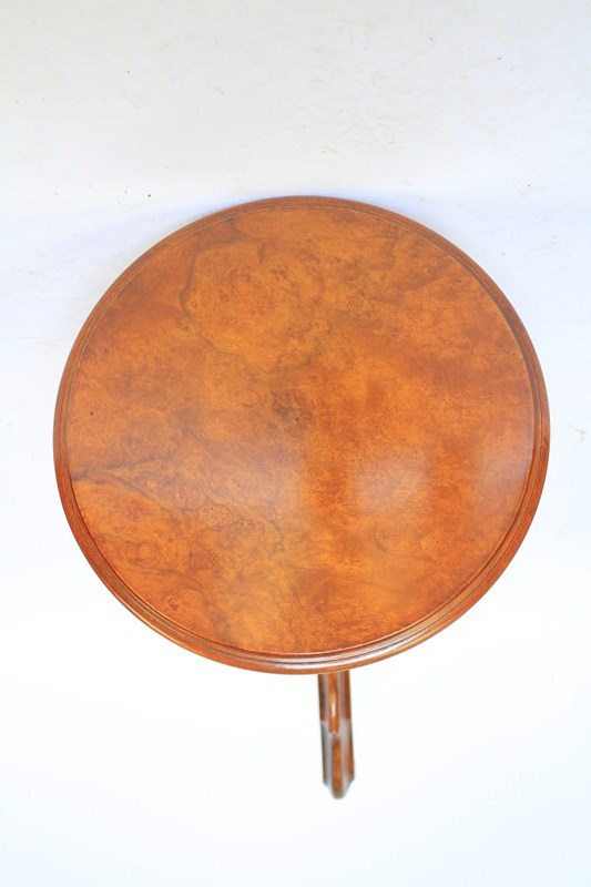 Victorian Burr Walnut Lamp table. Circular Burr Walnut top Diameter 34cm. Turned pedestal with 4 carved Scrolls. Arch Shaped Tripod Base with Poker work detail. Splayed legs with carved scroll feet. Recently Polished.