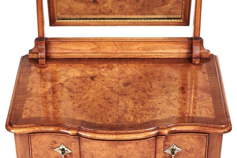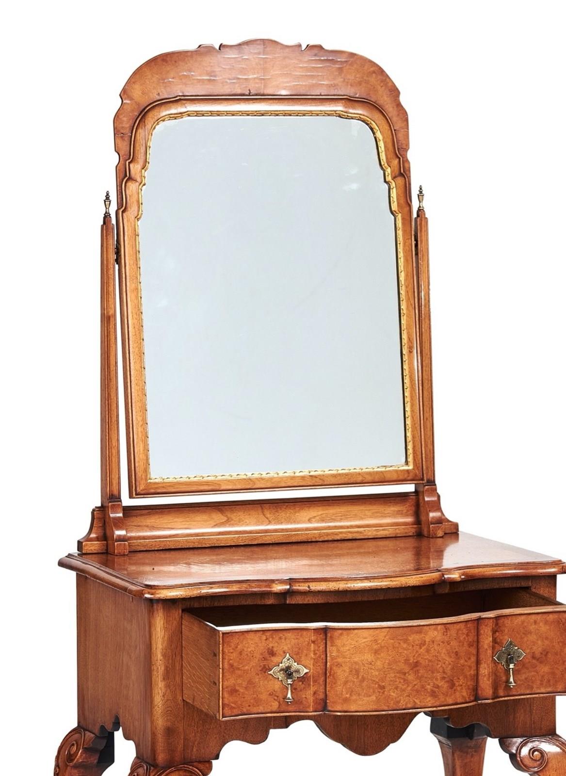 Fine Walnut & Burr Walnut Lowboy Dressing table,Queen Anne Revival circa 1920s. Arch Shaped Swing mirror, Swivels on ball with pinch screws. Tapering Supports each side with urn shaped Brass Finials, Mirror with Gilt carved moulding around mirror glass, Burr Walnut veneer on top with cross banding, Single Serpentine shaped drawer with oak linings, Brass Etched brass drop Handles, Cabriole Shaped legs, with Scroll carving on knees & bell flower detail.