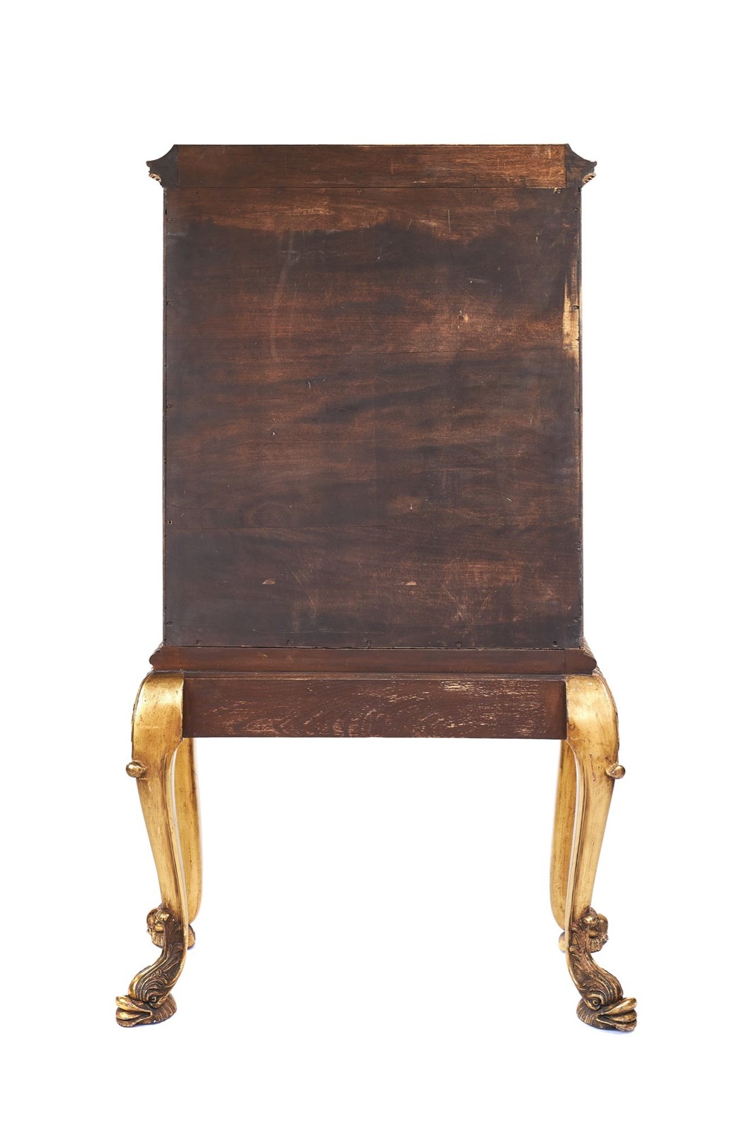 Fine walnut and gilt 2 door cabinet on stand circa 1920s. Parcel gilt & carved decorated cornice. Walnut 2 door cupboard top. with kingwood cross banding, fine cast brass locking plate & hinges, open to reveal: 2 loose shelves with parcel gilt decoration on front.