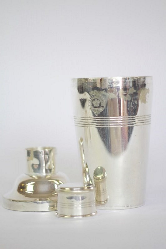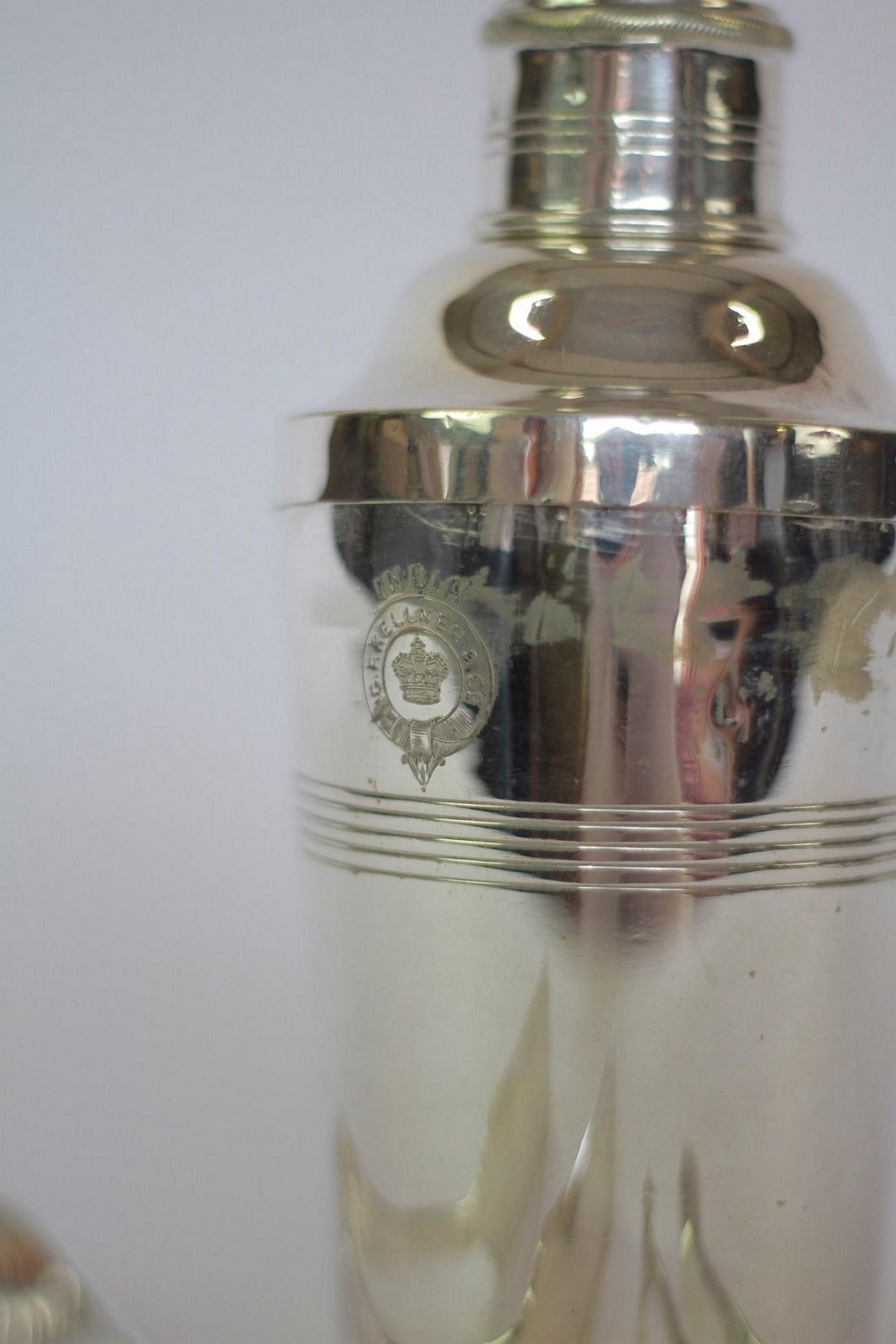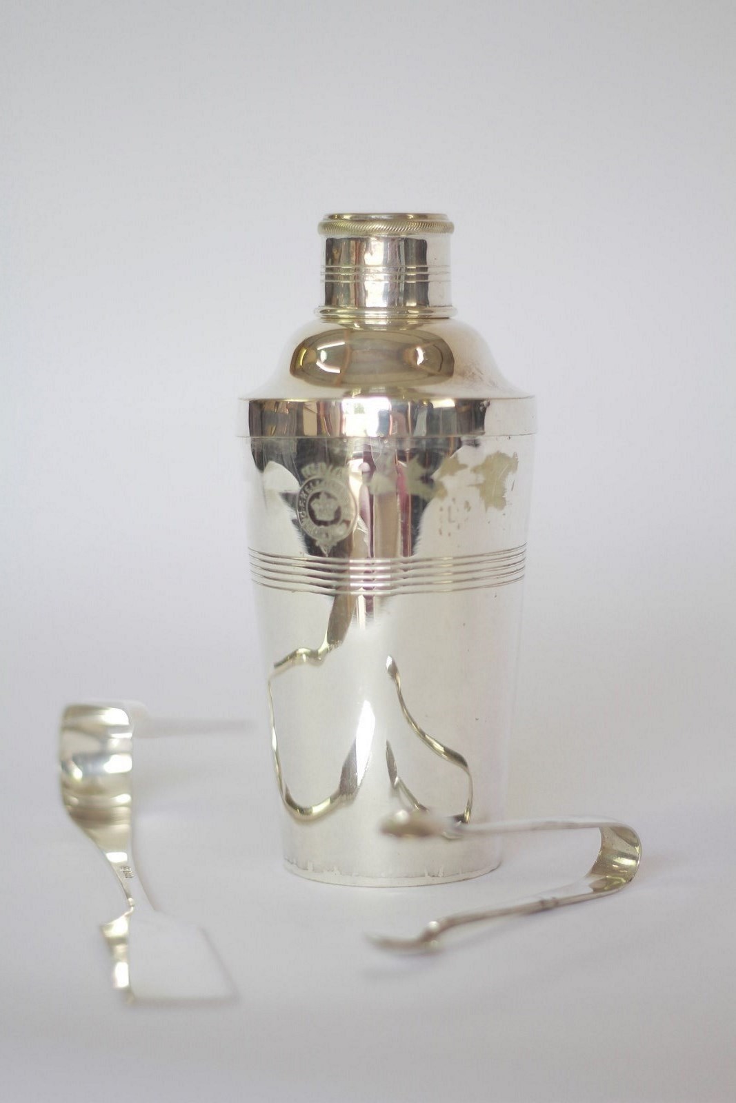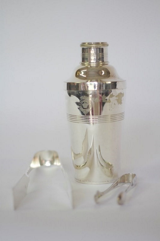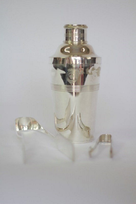 Silver plated Cocktail shaker, with : large silver plated ice tongs, and small silver plated fruit tongs, [3 items]