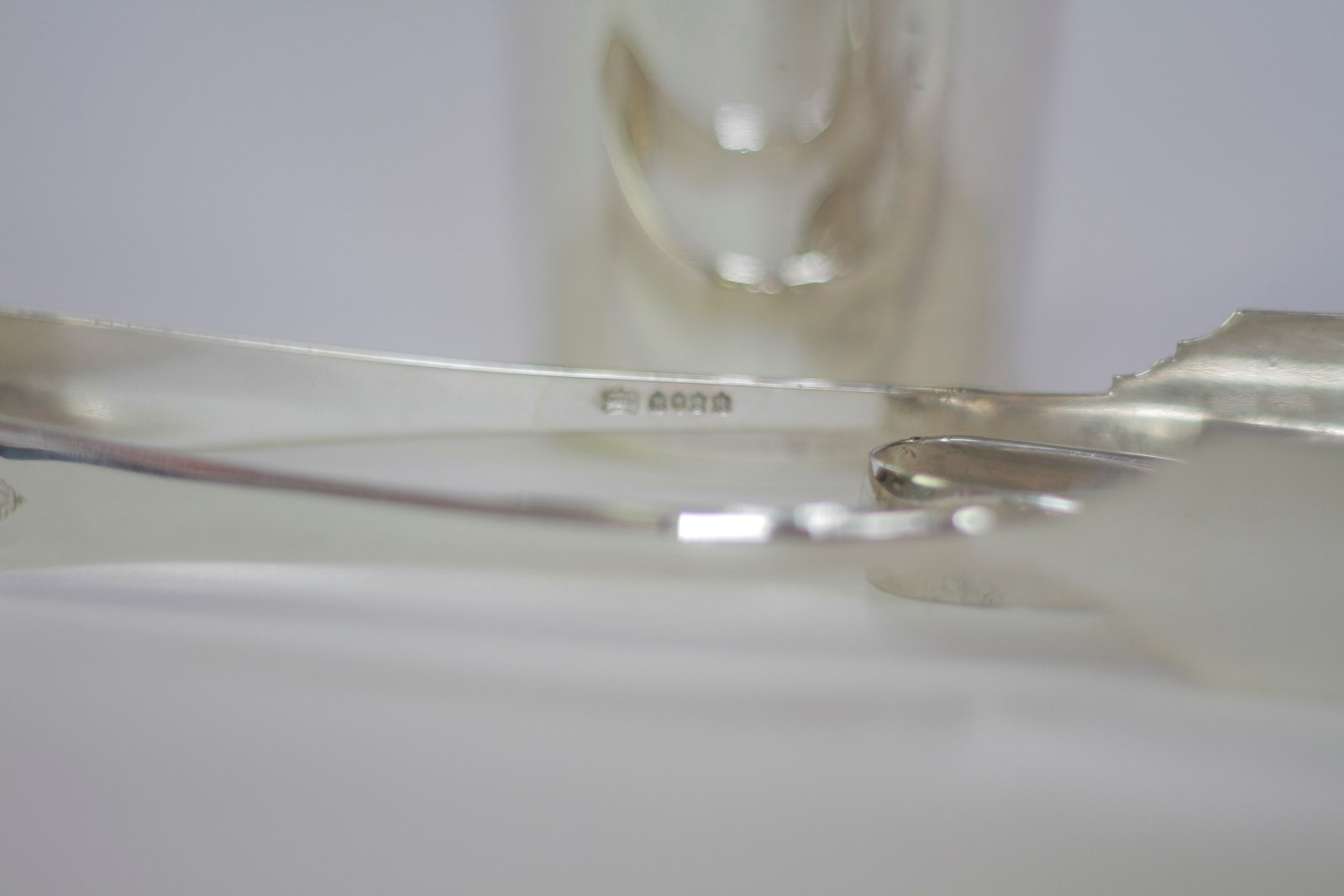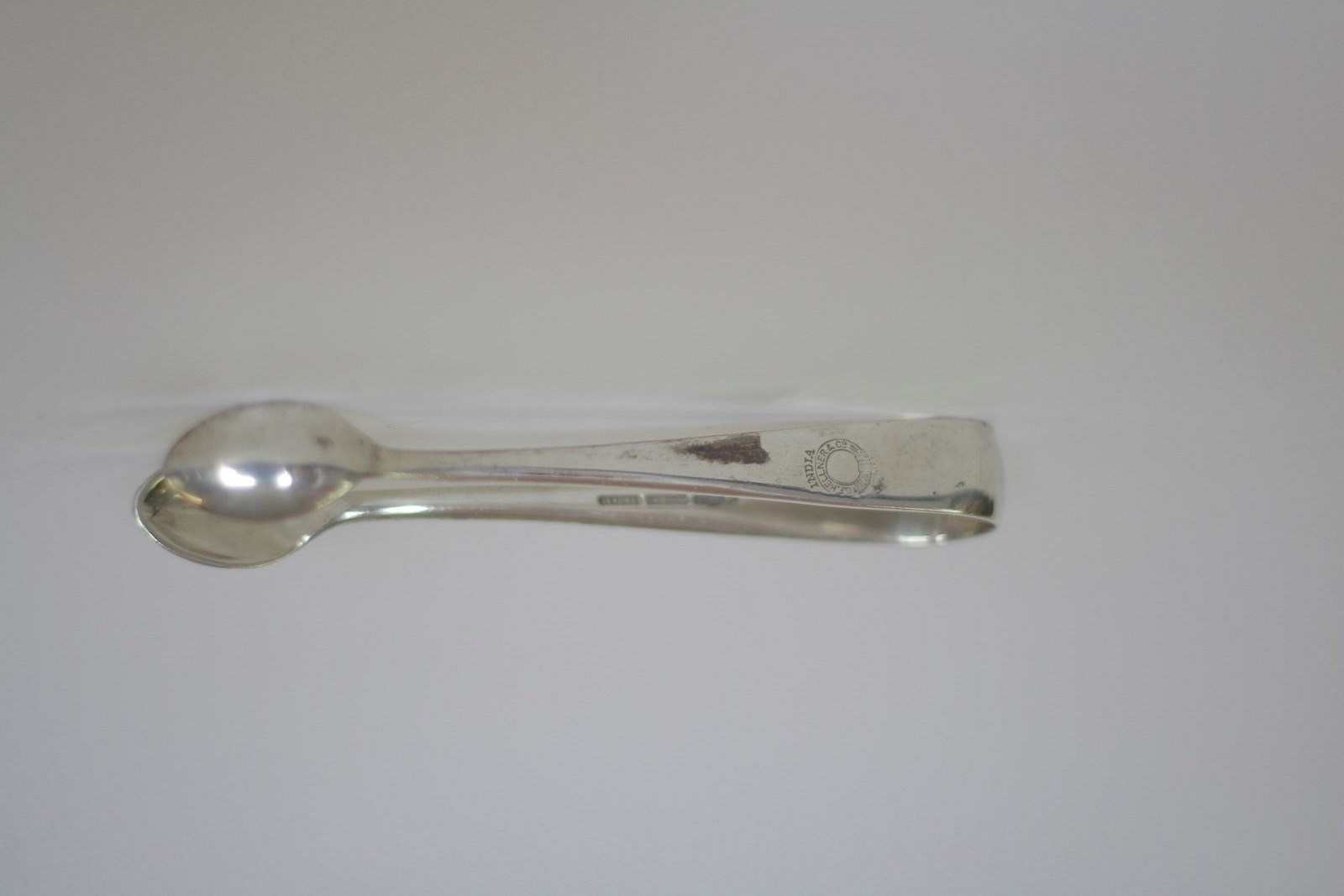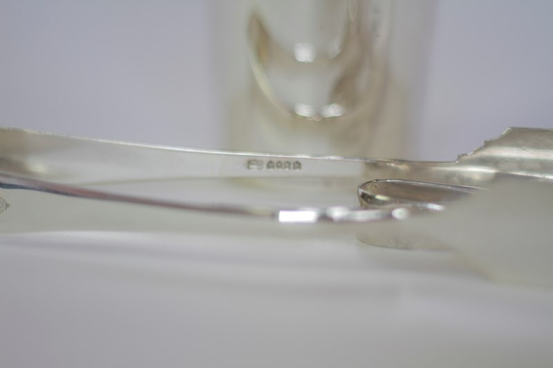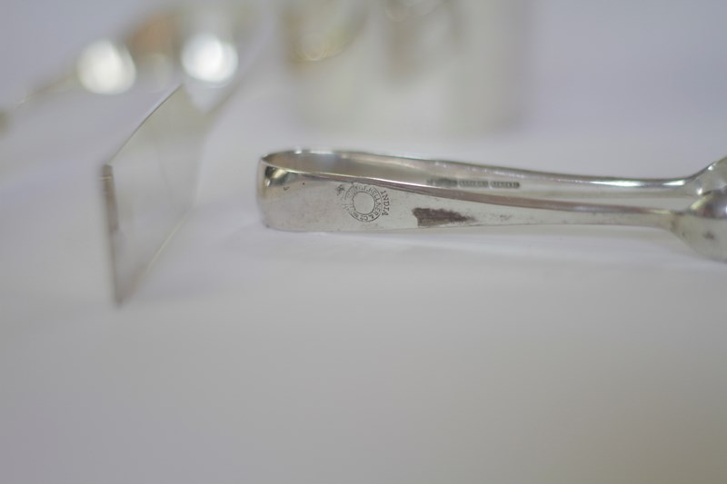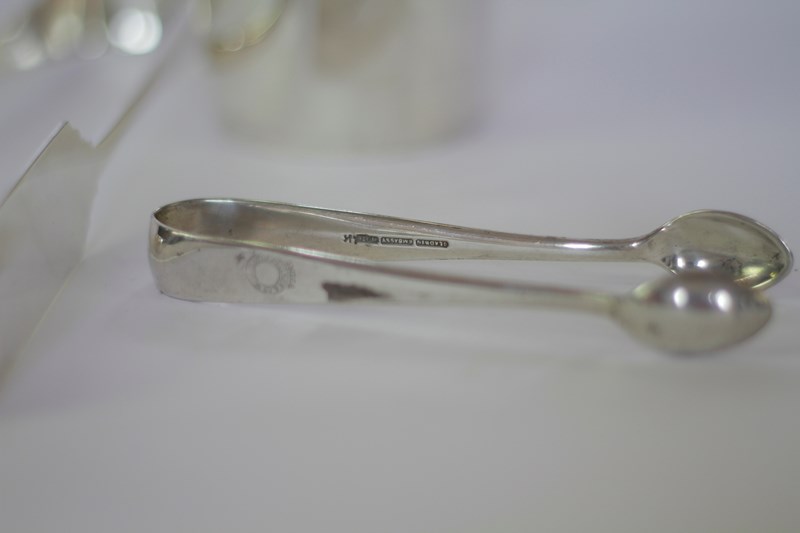 Silver plated Cocktail shaker, with : large silver plated ice tongs, and small silver plated fruit tongs, [3 items]