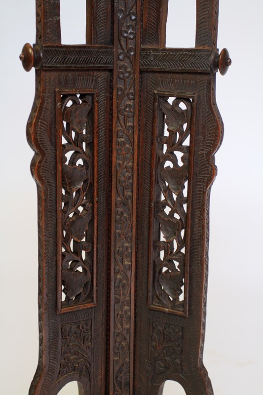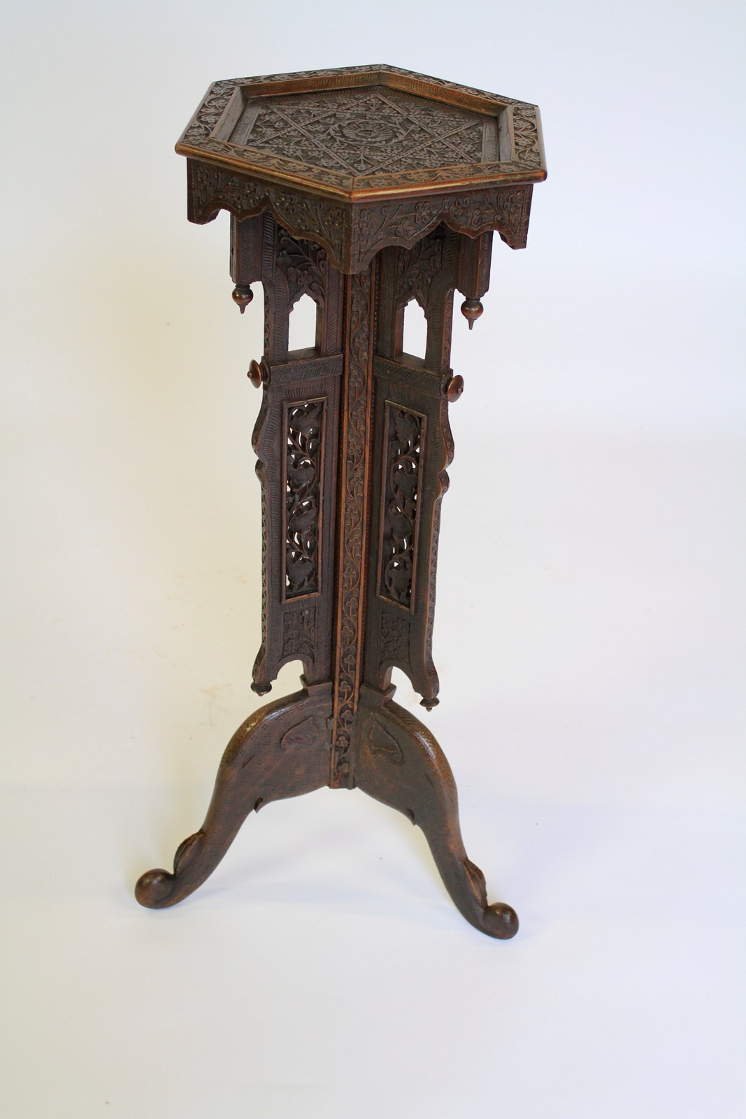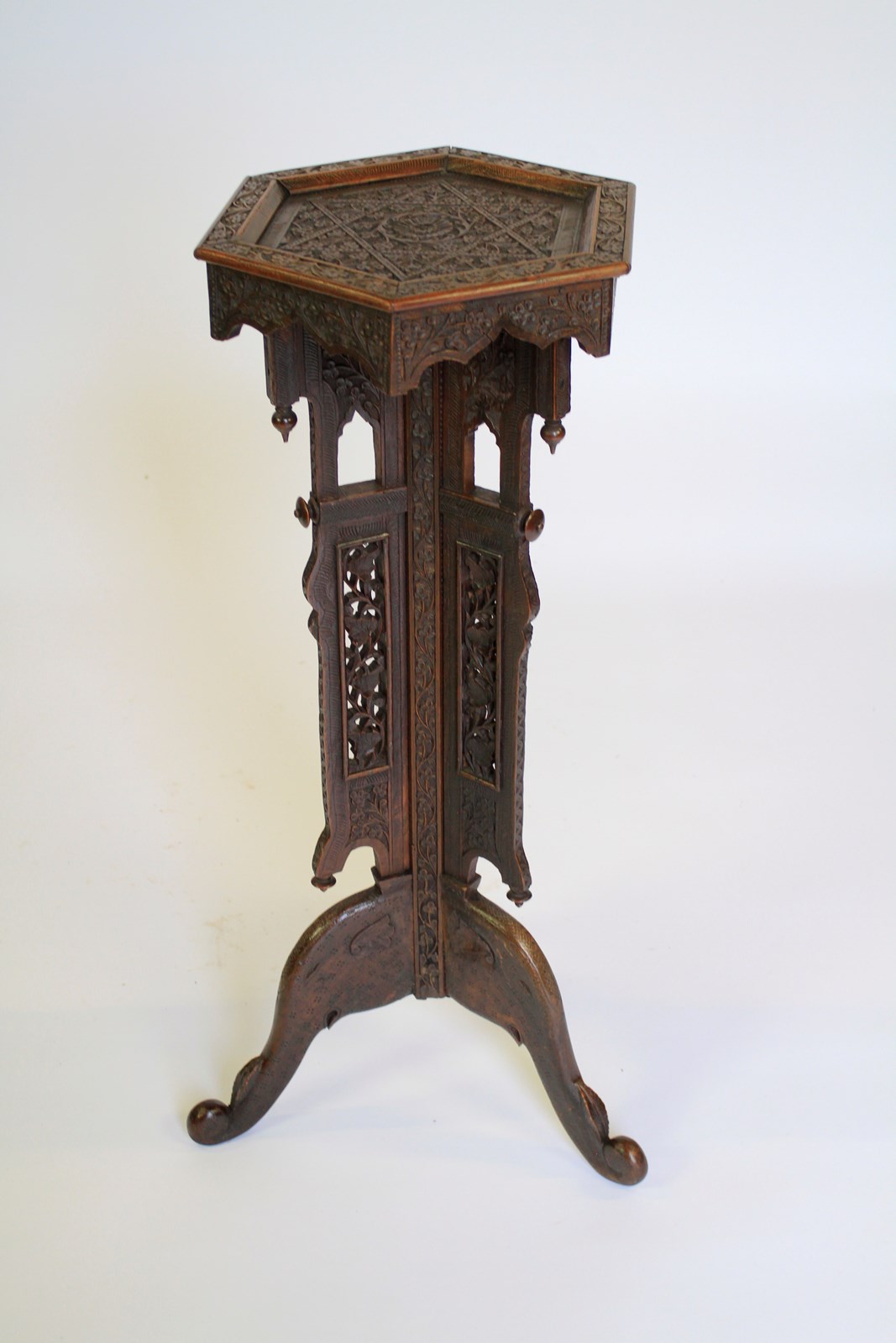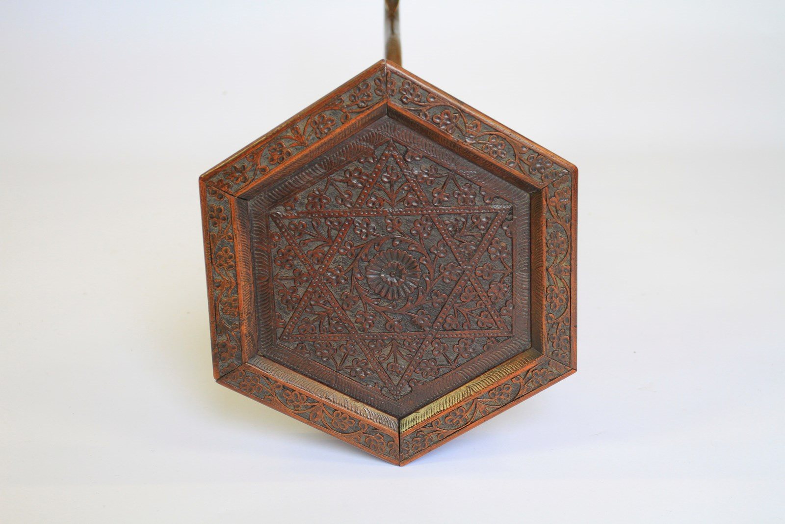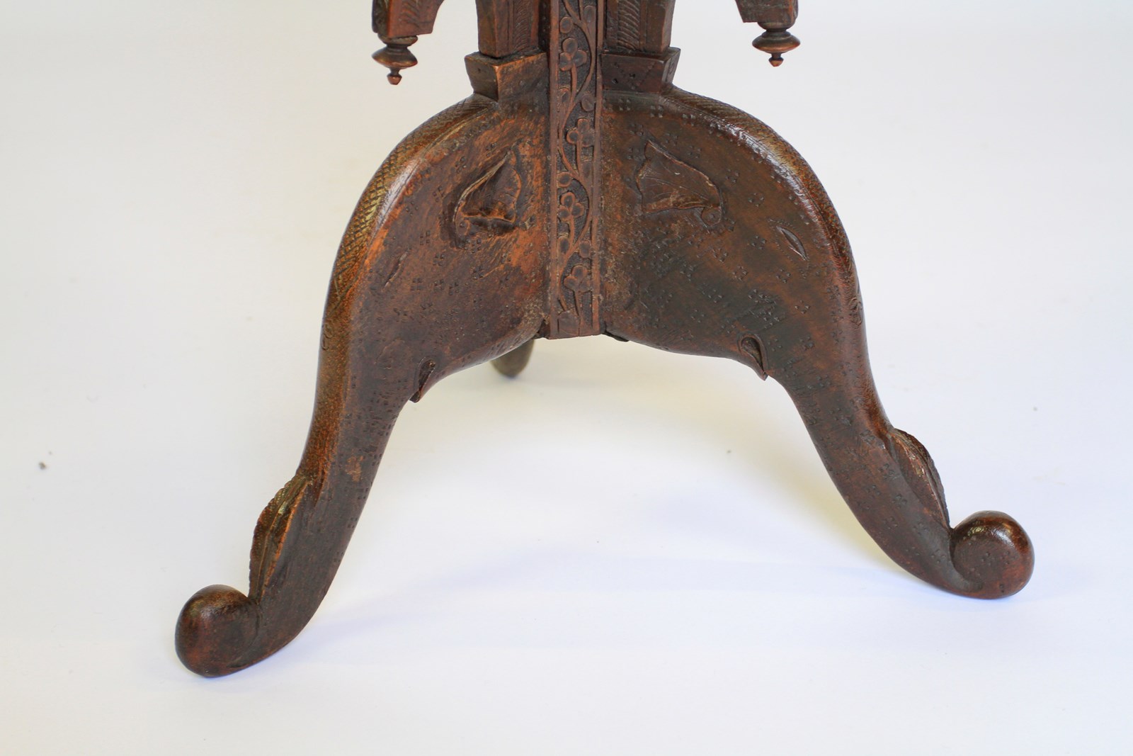 Indian Carved Lamp Table circa 1930s. Hexagonal carved top, Centre pedestal with 3 open pierced carved Panels Sitting on Tripod Elephant HeaLegsd shaped.