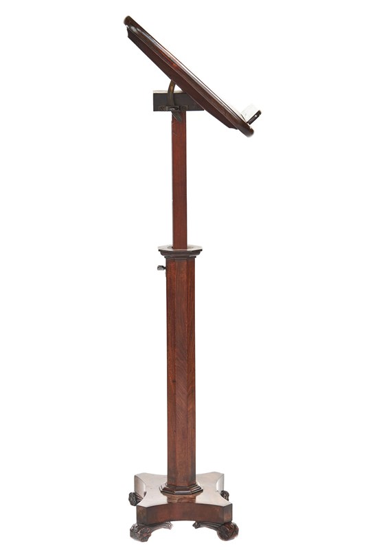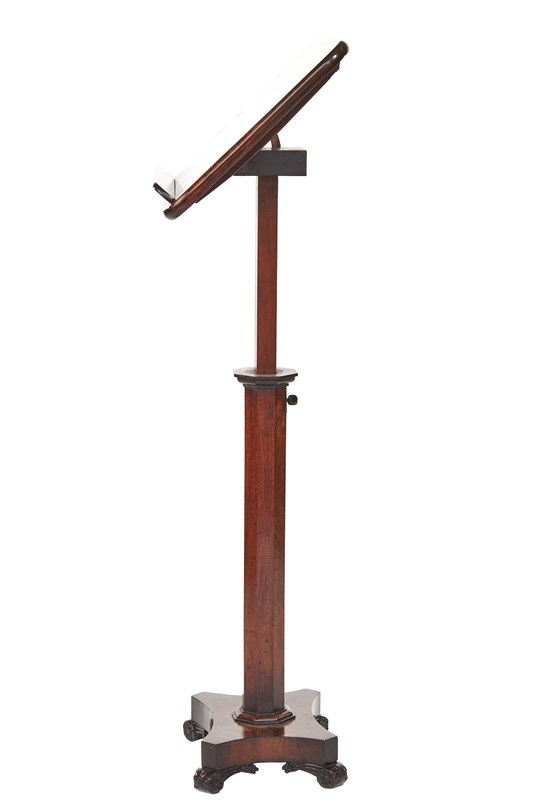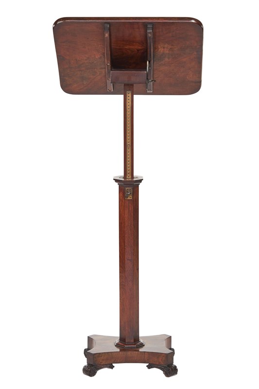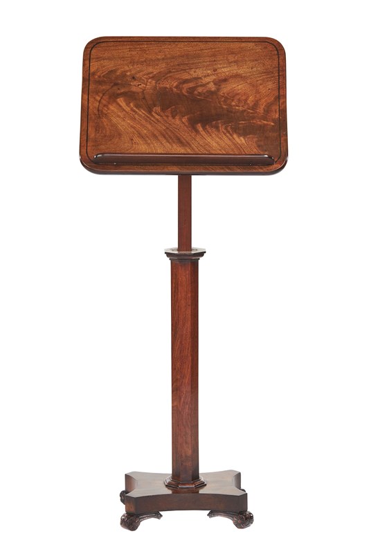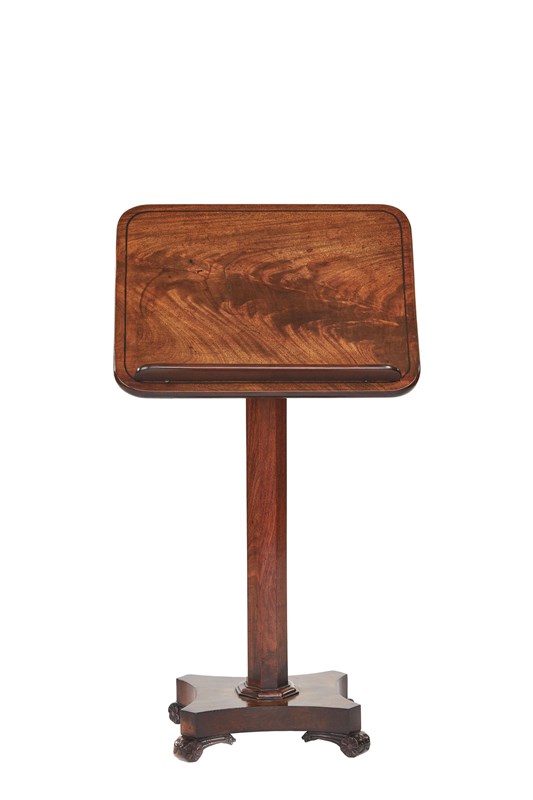 Figured Mahogany Adjustable top, with removable mahogany book rest,
