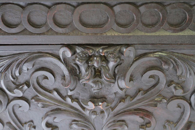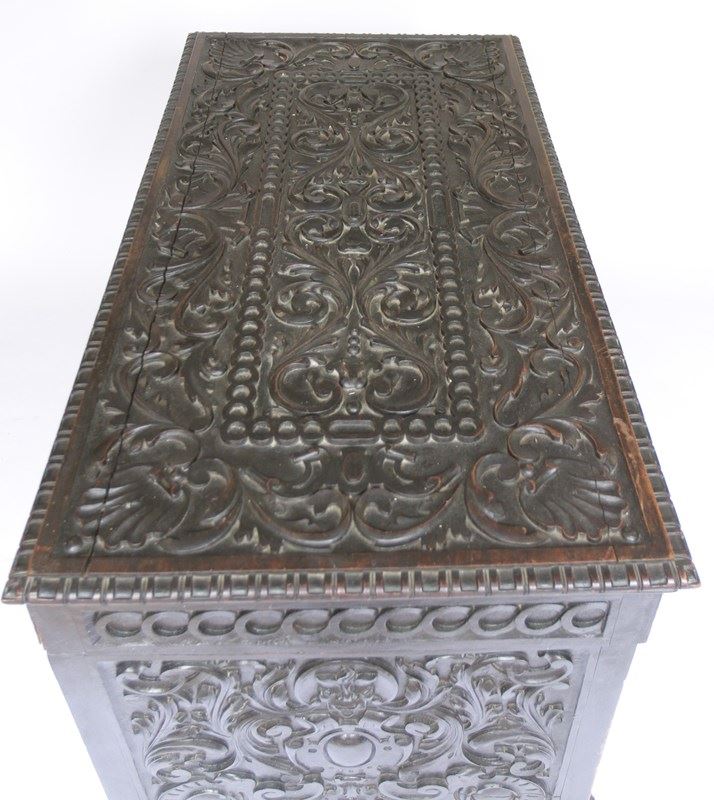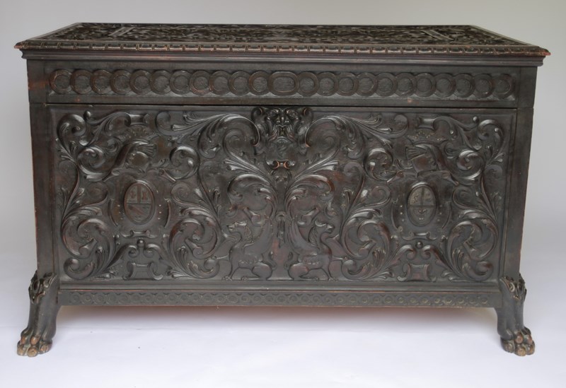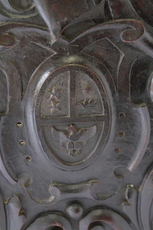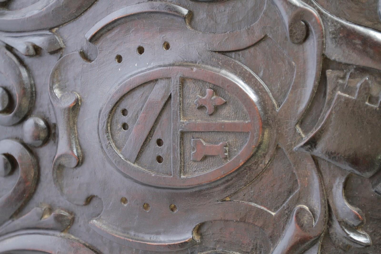 Front of coffer carving showing pair of the family crests,