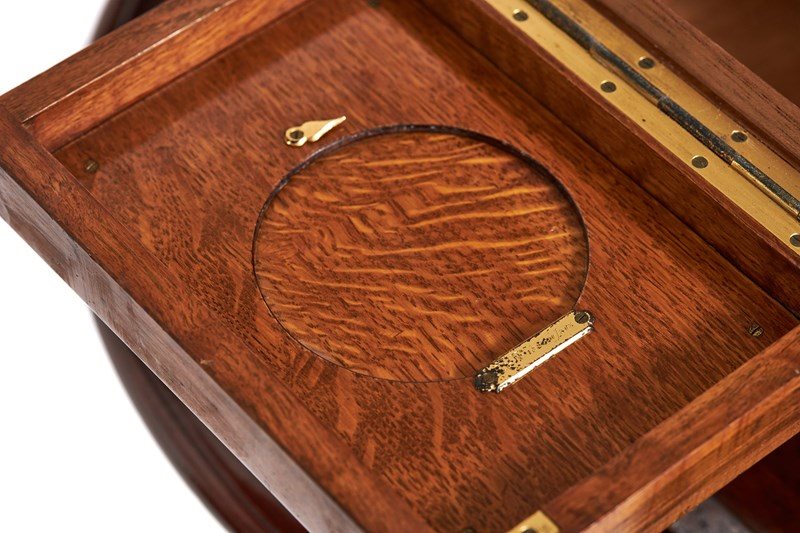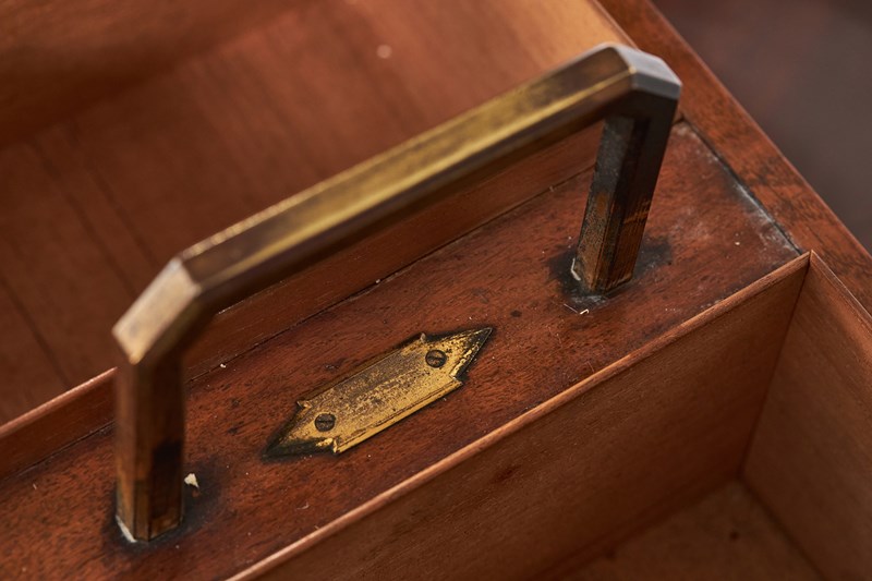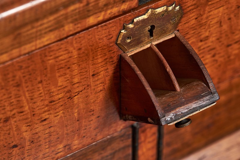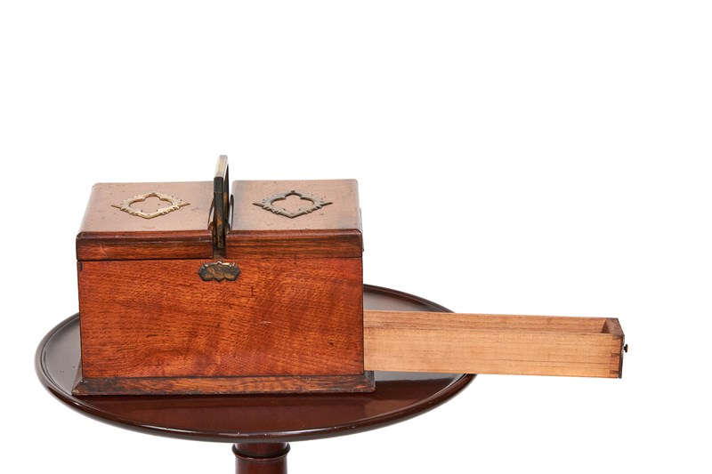 Fall front holder at front for matches, brass rails beneath to hold striker, two hinged compartments at front base.