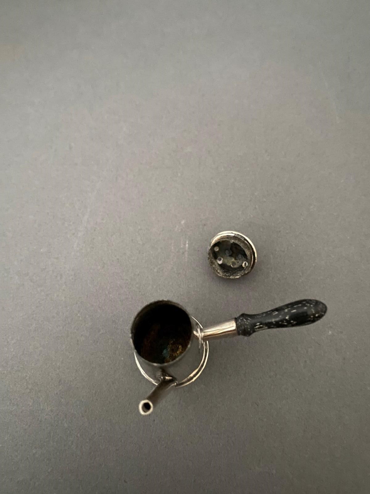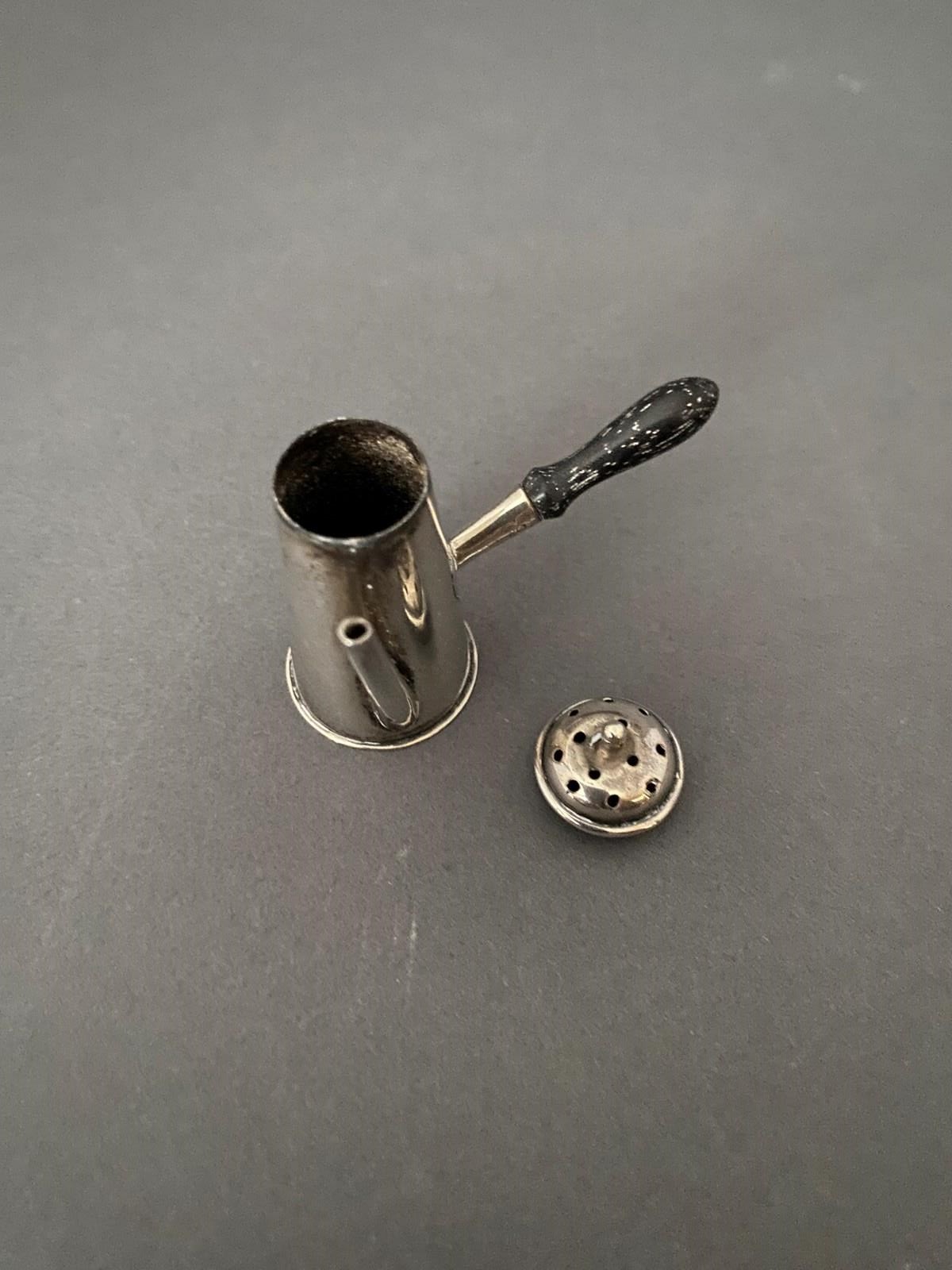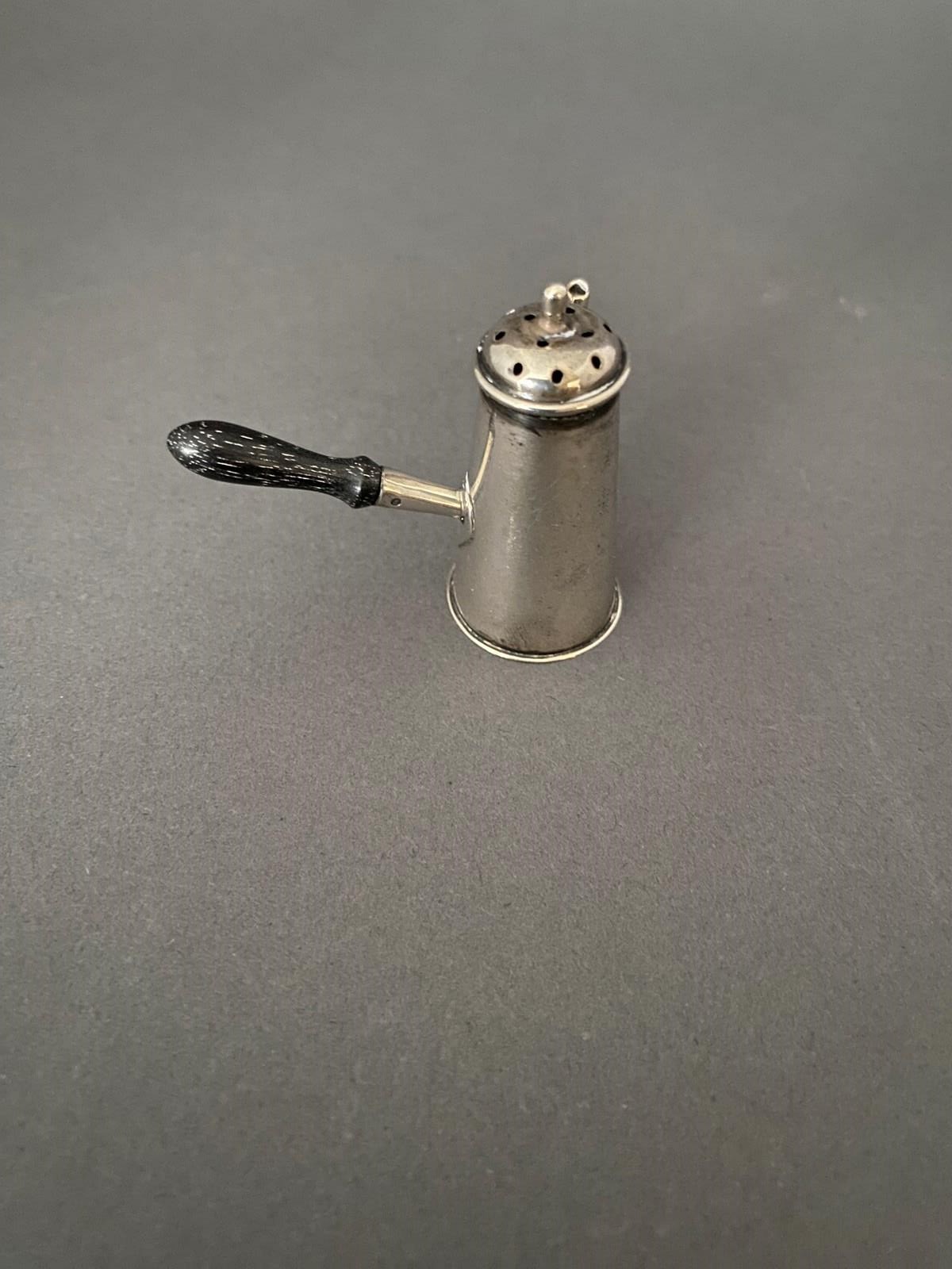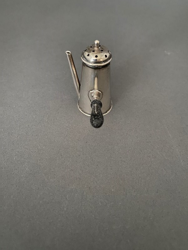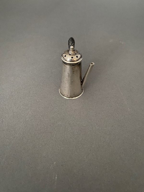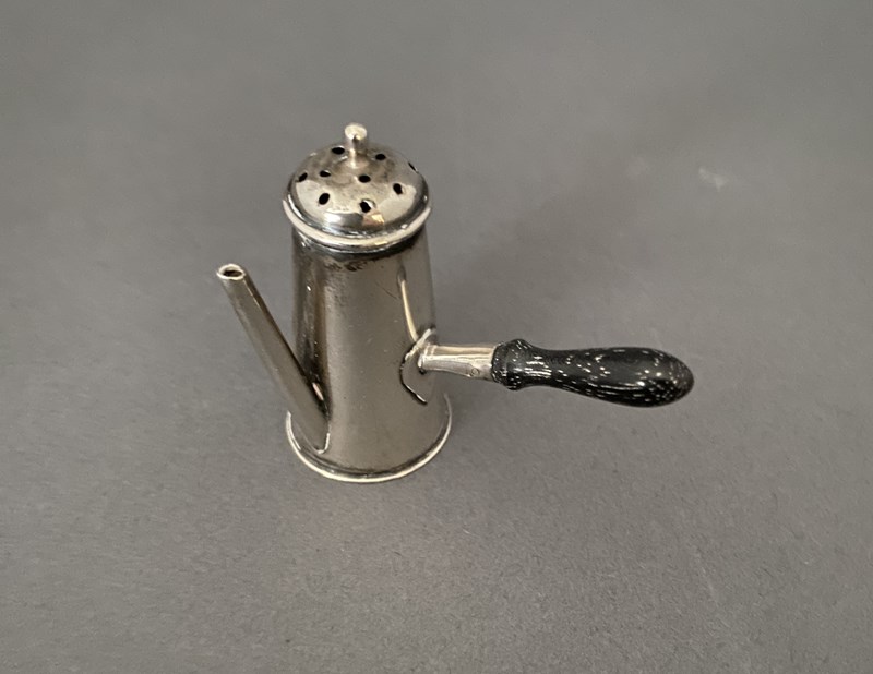 Novelty Silver Miniature Pepper pot, Chester 1900, in the form of a coffee pot. Lift off lid, turned wooden Handle. Maker CS & FS Hallmarks Chester.
