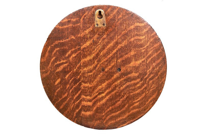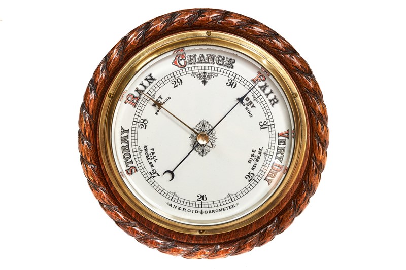 Oak circular Aneroid Wall Barometer with carved rope decoration. Cream face, Beveled glass, brass rim, oak case, with rope twist carving.