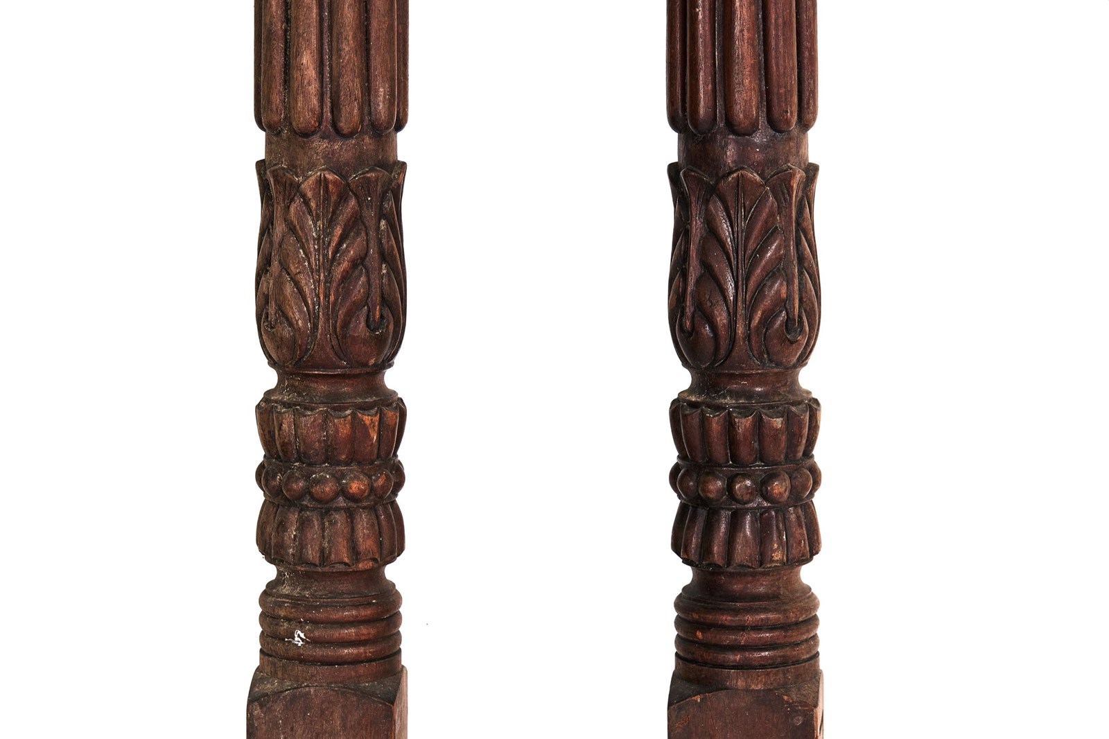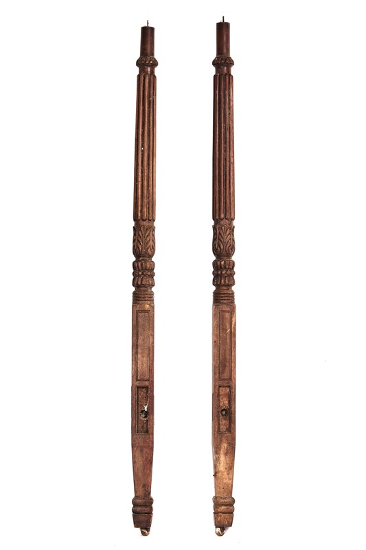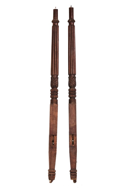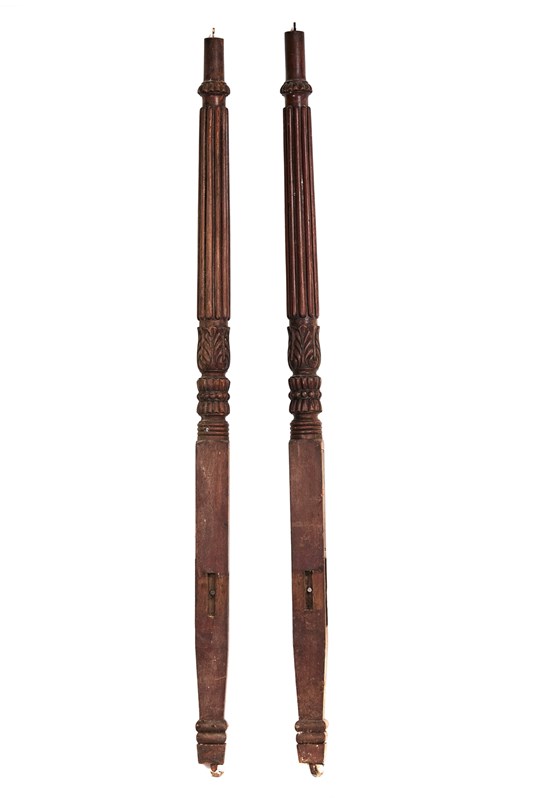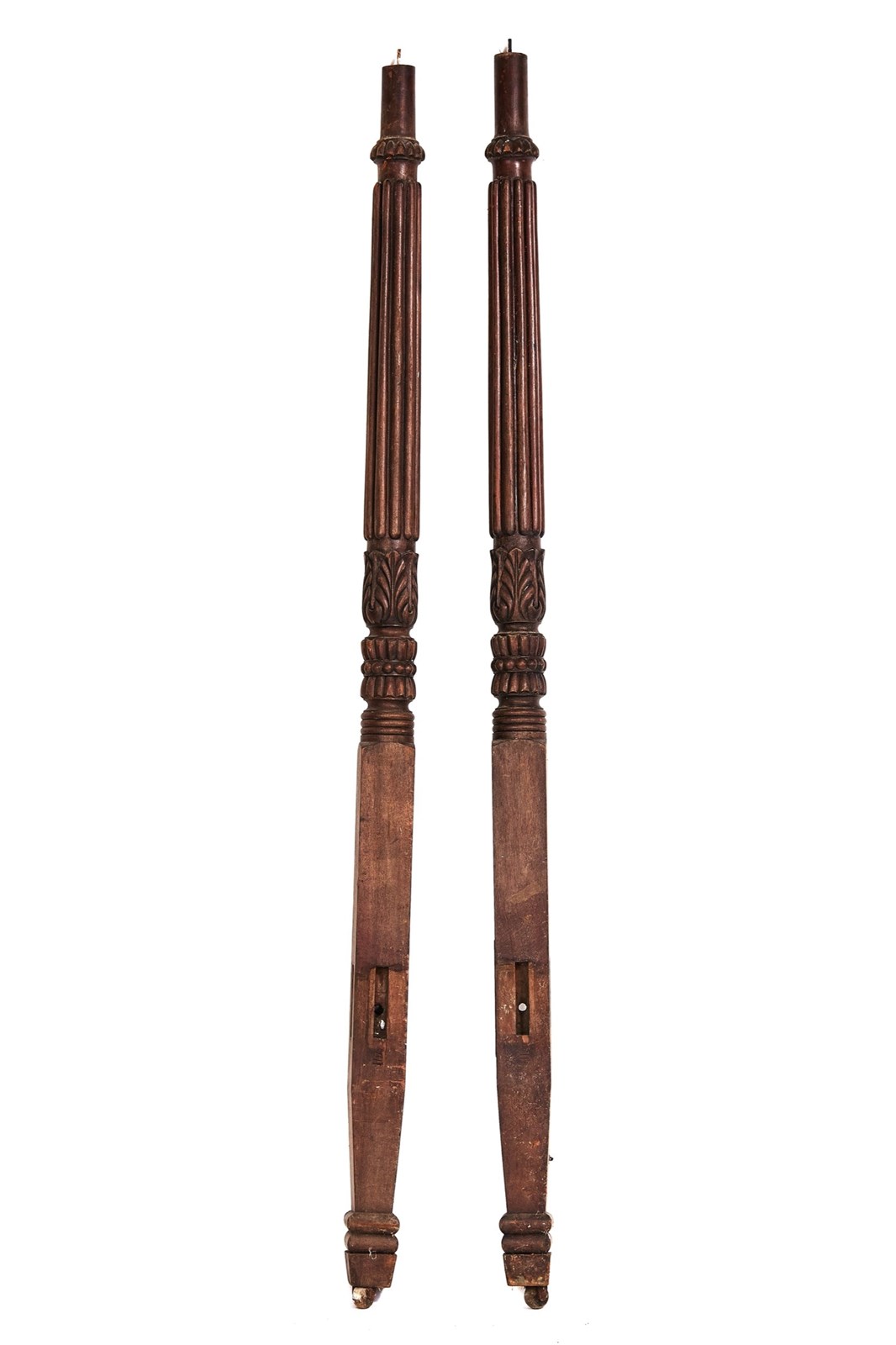 Pair Regency Mahogany Bed posts, Reeded & Carved Detail, Square Base with Brass Castors, Slot in each post to hold bed rails.