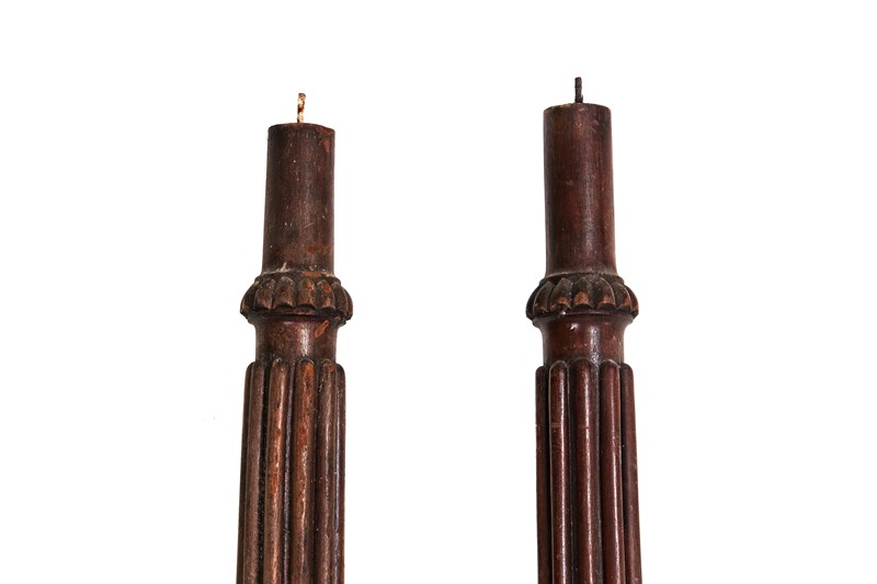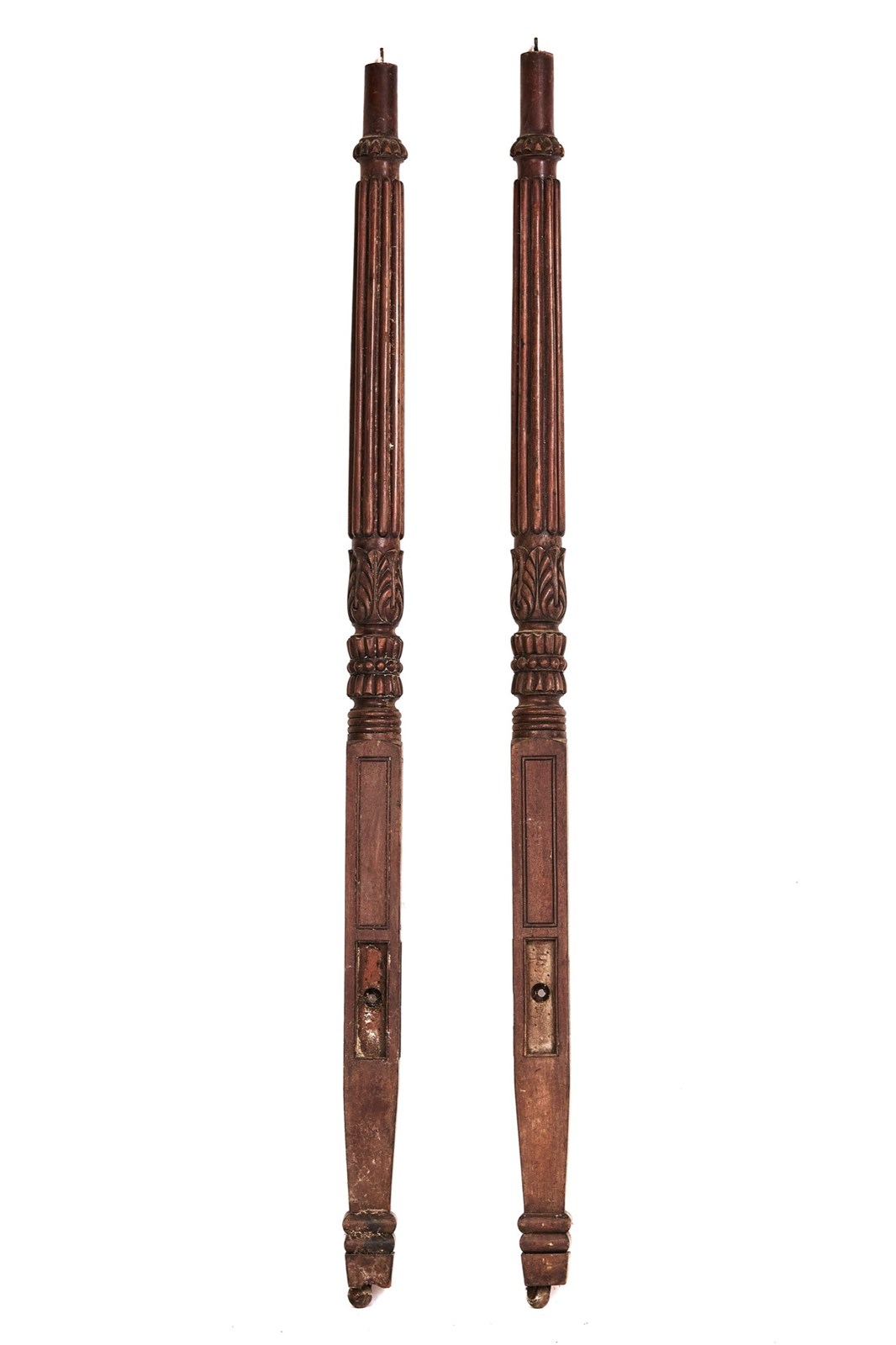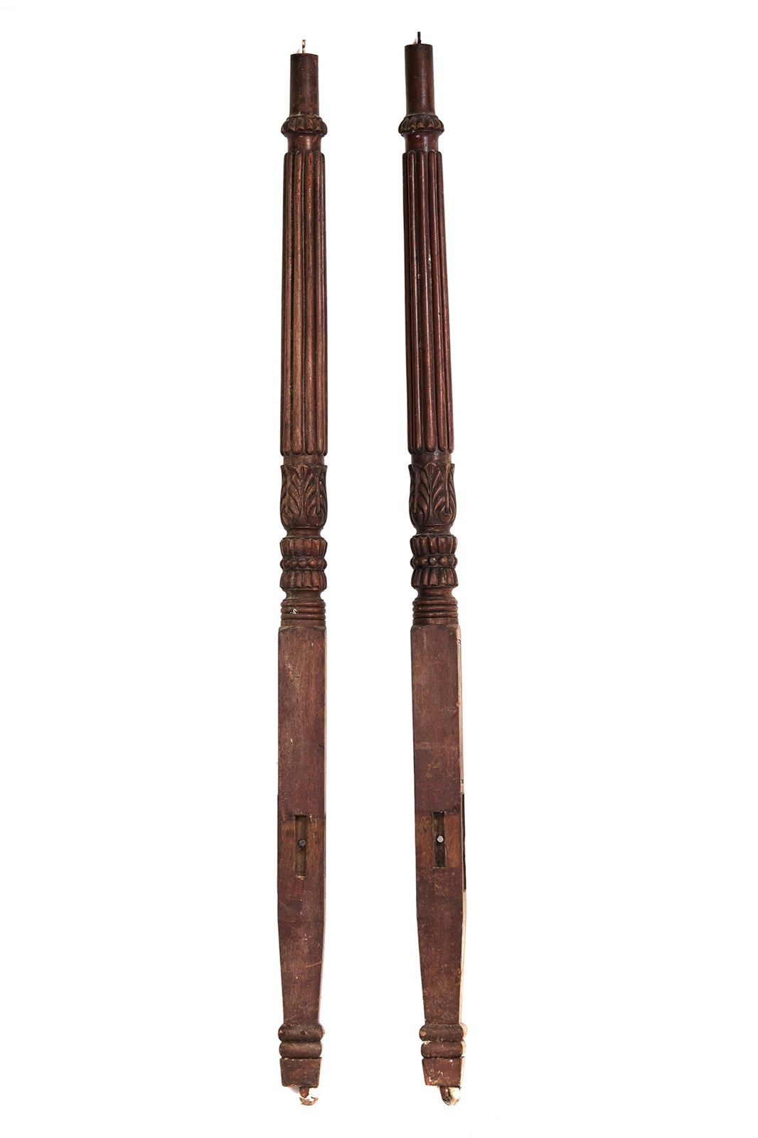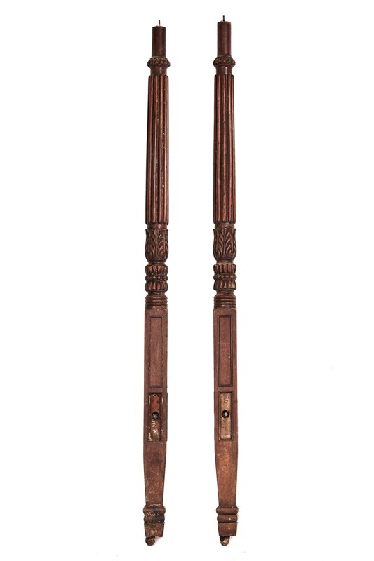 Pair Regency Mahogany Bed posts, Reeded & Carved Detail, Square Base with Brass Castors, Slot in each post to hold bed rails.