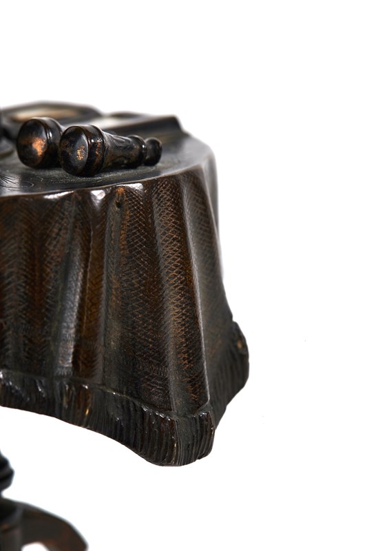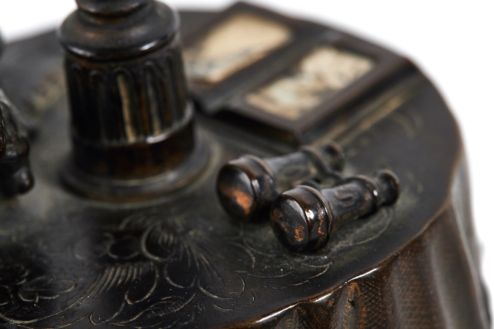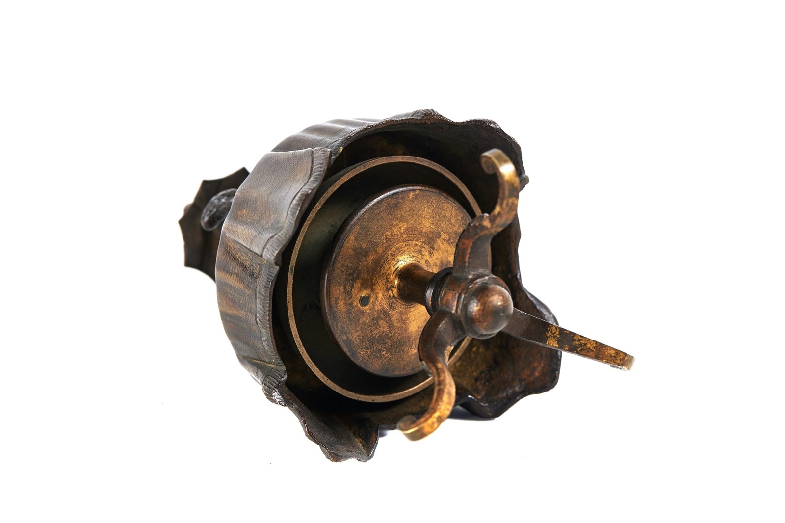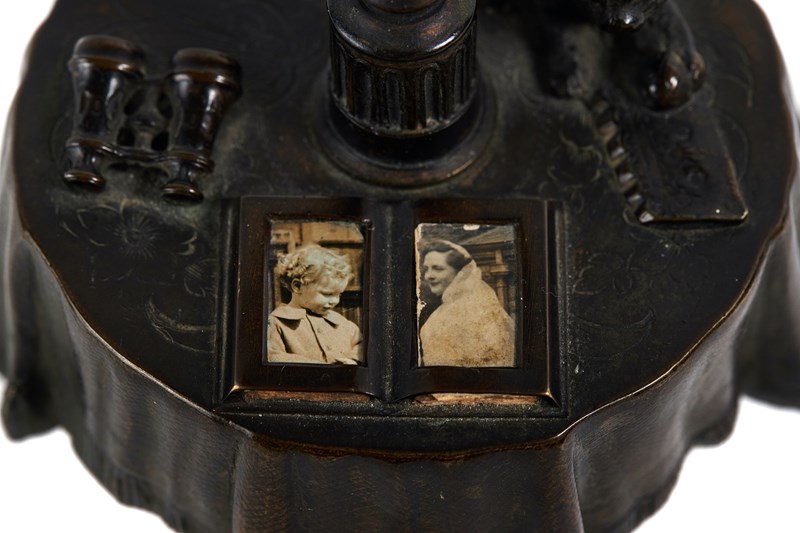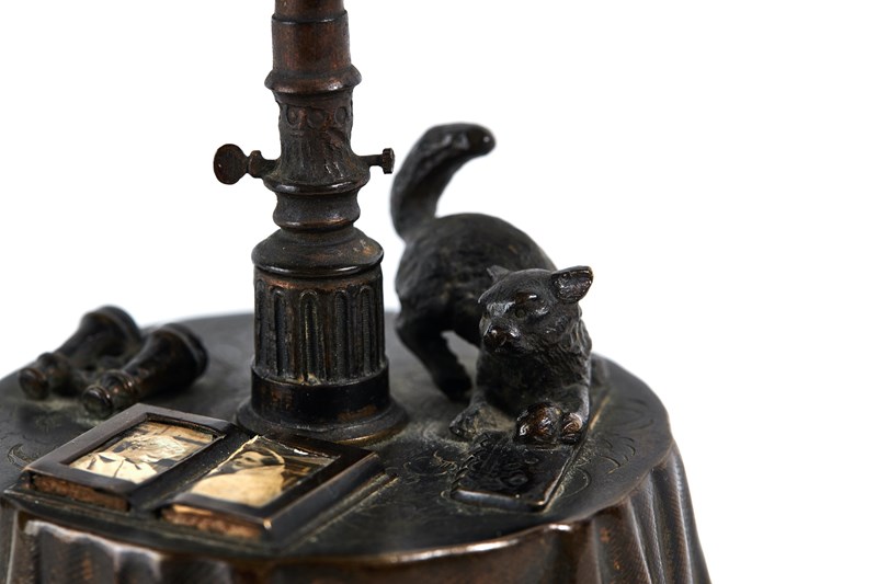 Rare Victorian Gilt Bronze Table Bell. In the Form of a Circular dining table. The Etched Table cloth decorated with flowers, and frill detail at the bottom of the table cloth. Applied on top with a cat, Photo frames and Binoculars. The Centre with a Gas table lamp with a pagoda shaped shade, press down the top of the lamp shade for the ringing of the bell. Tripod shaped table base, fine quality casting & detail down to the gas lamp with etched detail and cast knobs.