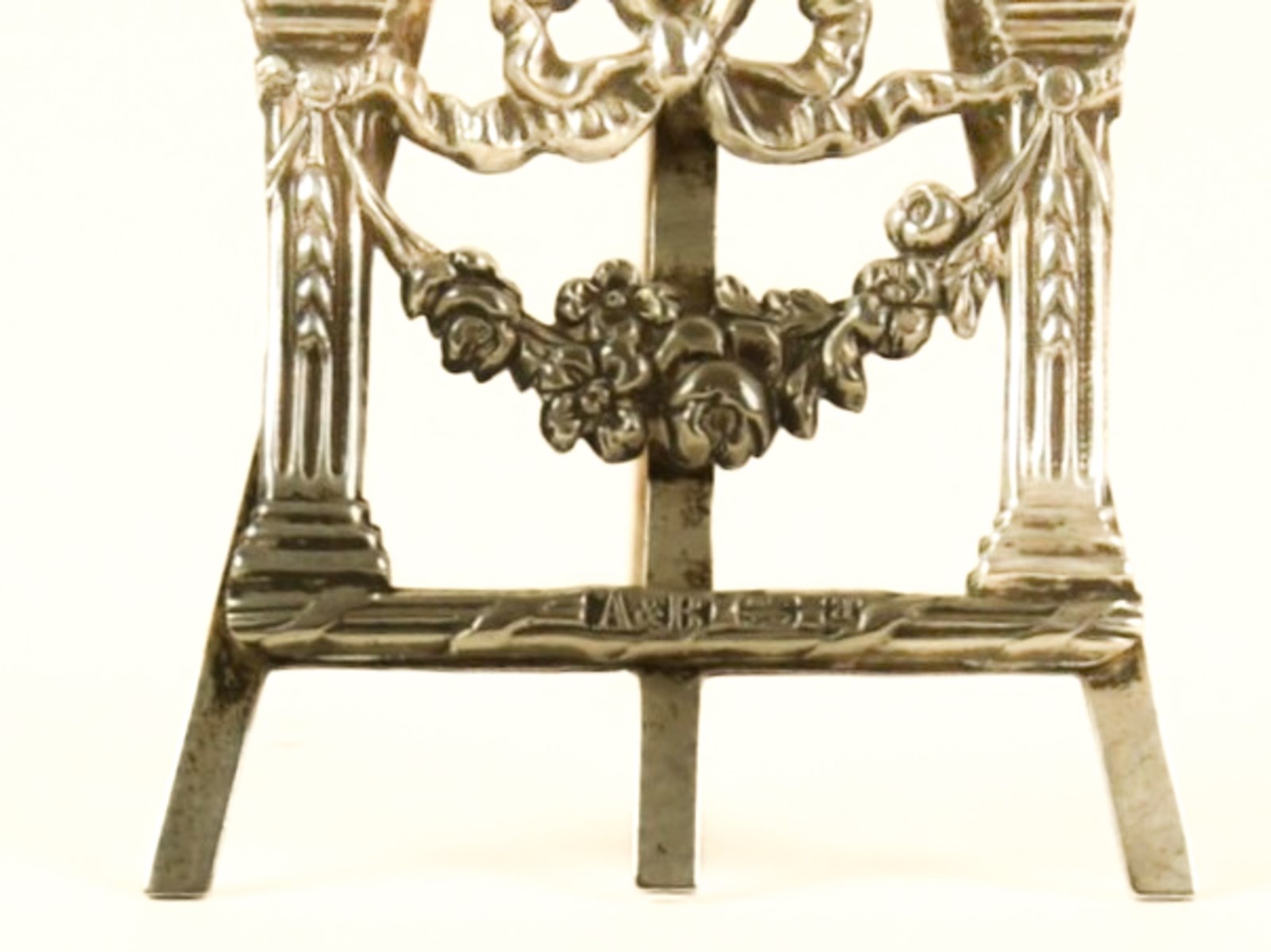 Silver Menu holder in the form of a Artists Easel. Detail with Pair Columns Floral Swag & Bow in centre. Hallmarked A &B Birmingham 1900. No Dents or Damage