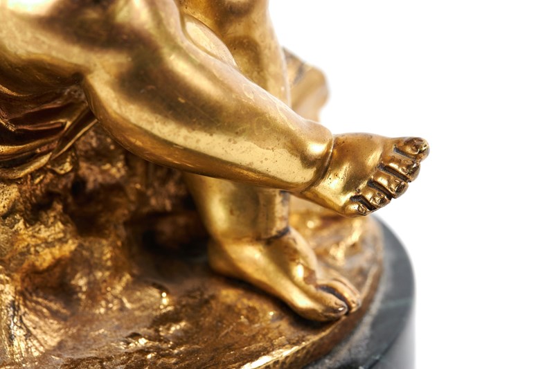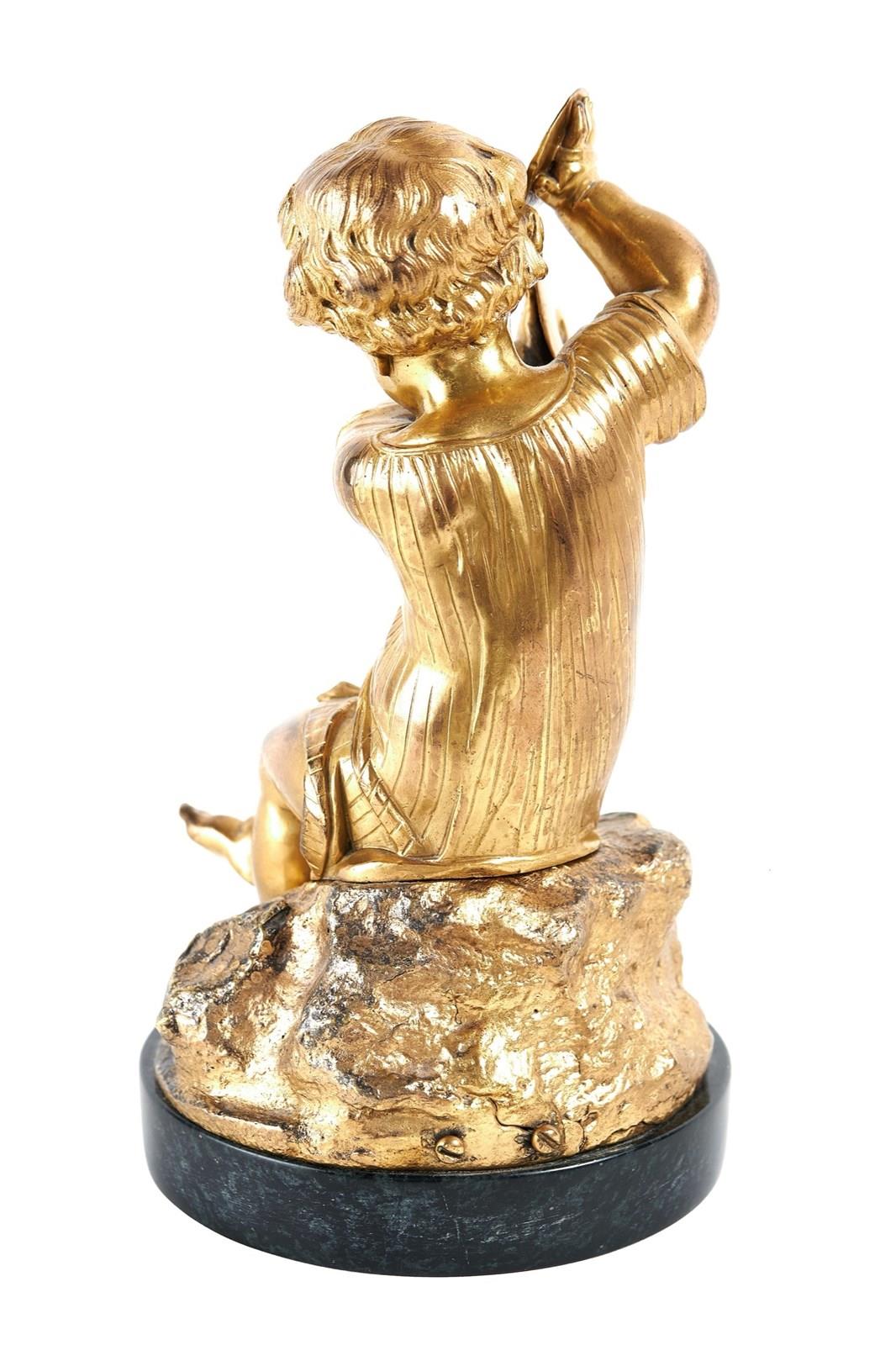 Victorian Gilt Bronze figure of a Child playing the Cymbals, Sitting Cross leg on a rock, fine detailed casting, on the face, Hands with the cymbal band wrapped around, Stripes on clothing. Muscle detail on arms & legs, Fine toes & toe nails, detailed rock base. All sitting on a black marble circular base.
