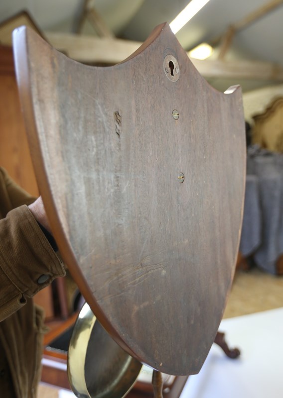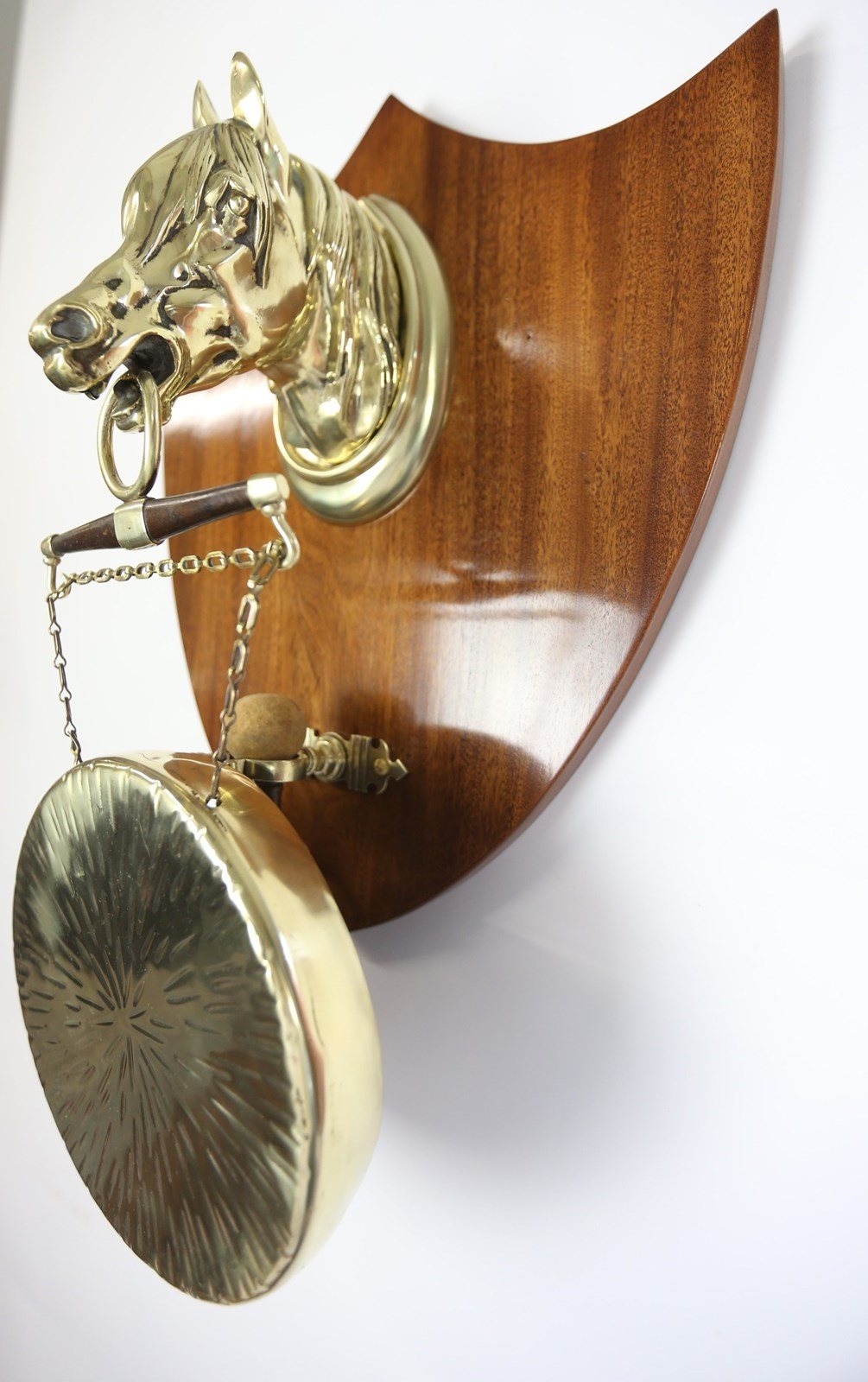 Late Victorian Mahogany & Brass Horse head Wall Mounted Gong. Mahogany Shield shaped Back, With Mount hook, Embossed Hollow Brass Horses Head & Brass Collar, Supporting Circular Brass Gong