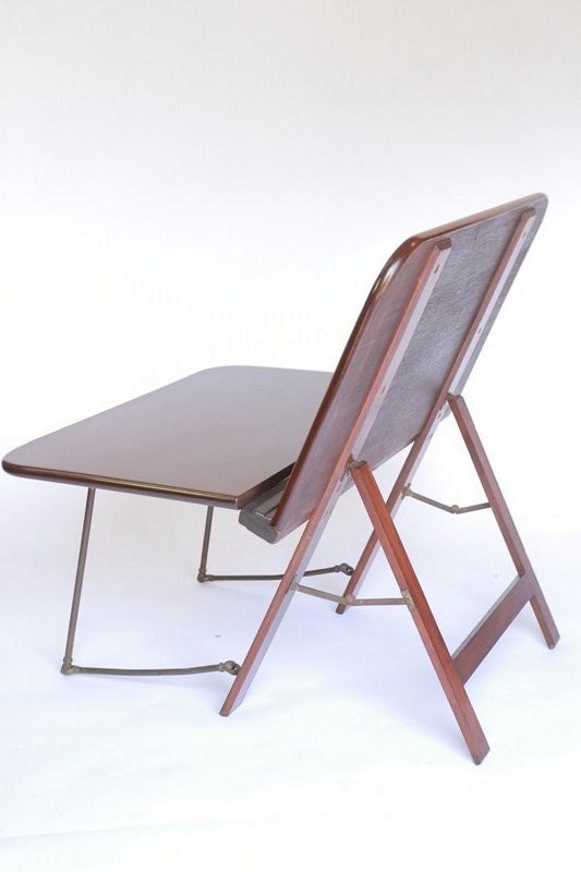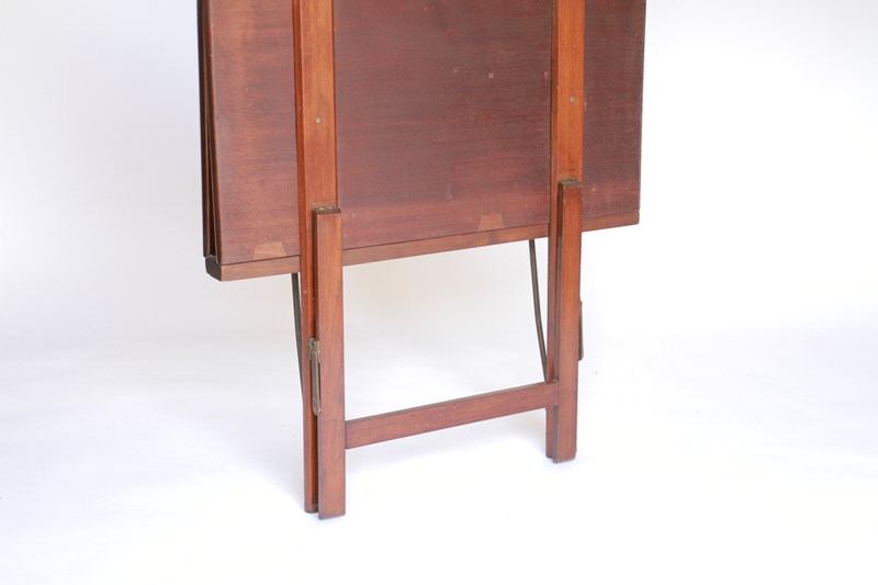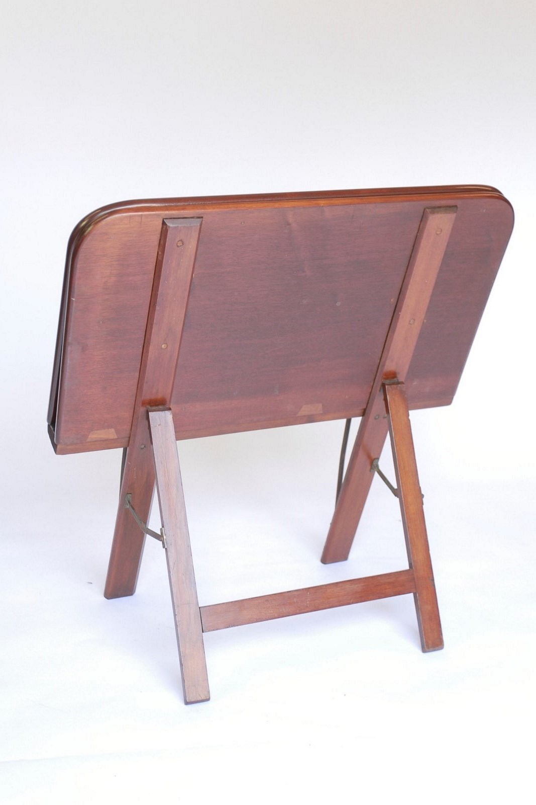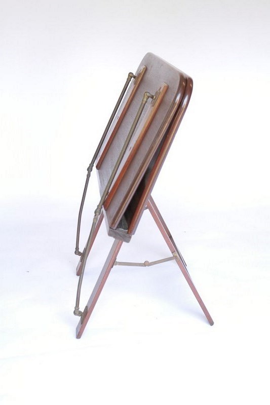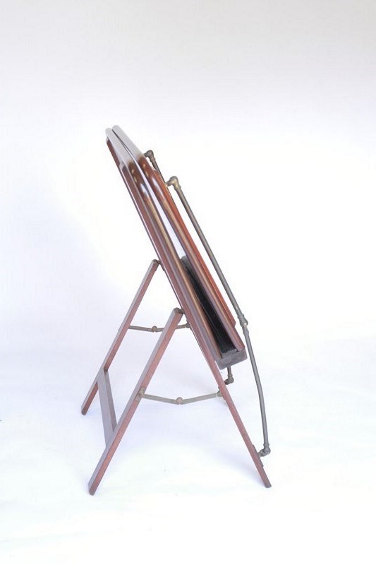 Victorian Mahogany & Brass Port Folio Stand. Mahogany Sides, with Brass pole hinges & supports on one side. Other side folding leg support with brass catches. Black leather inside on the base. Mahogany Recently Polished