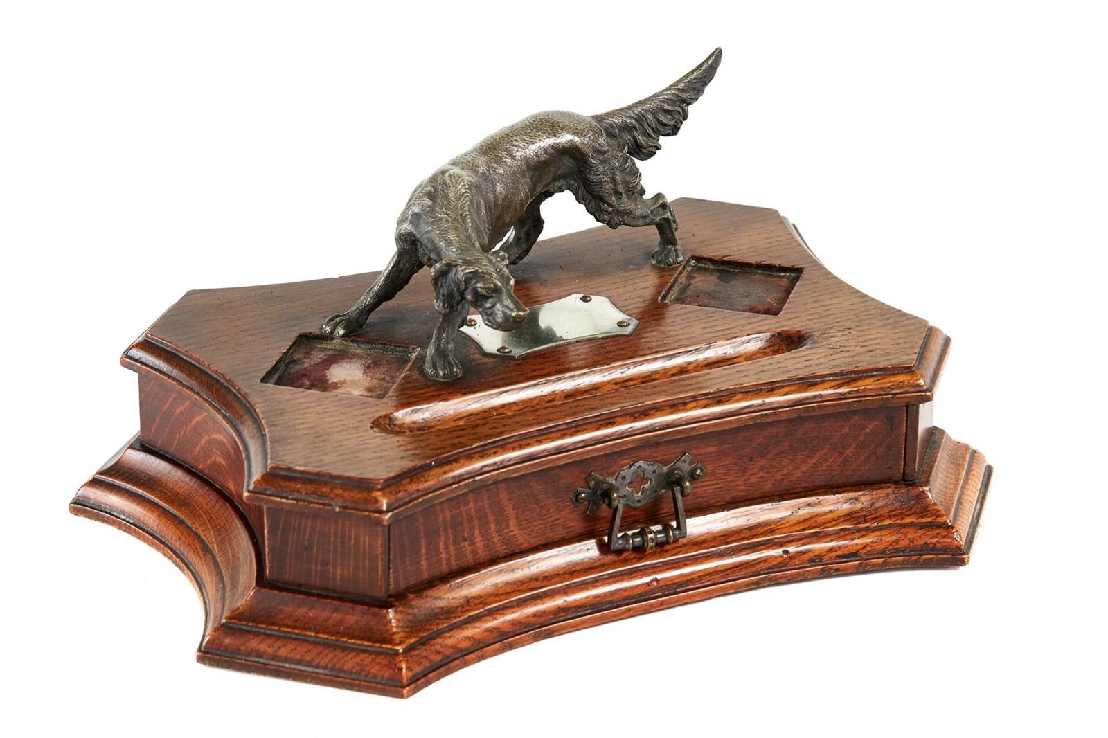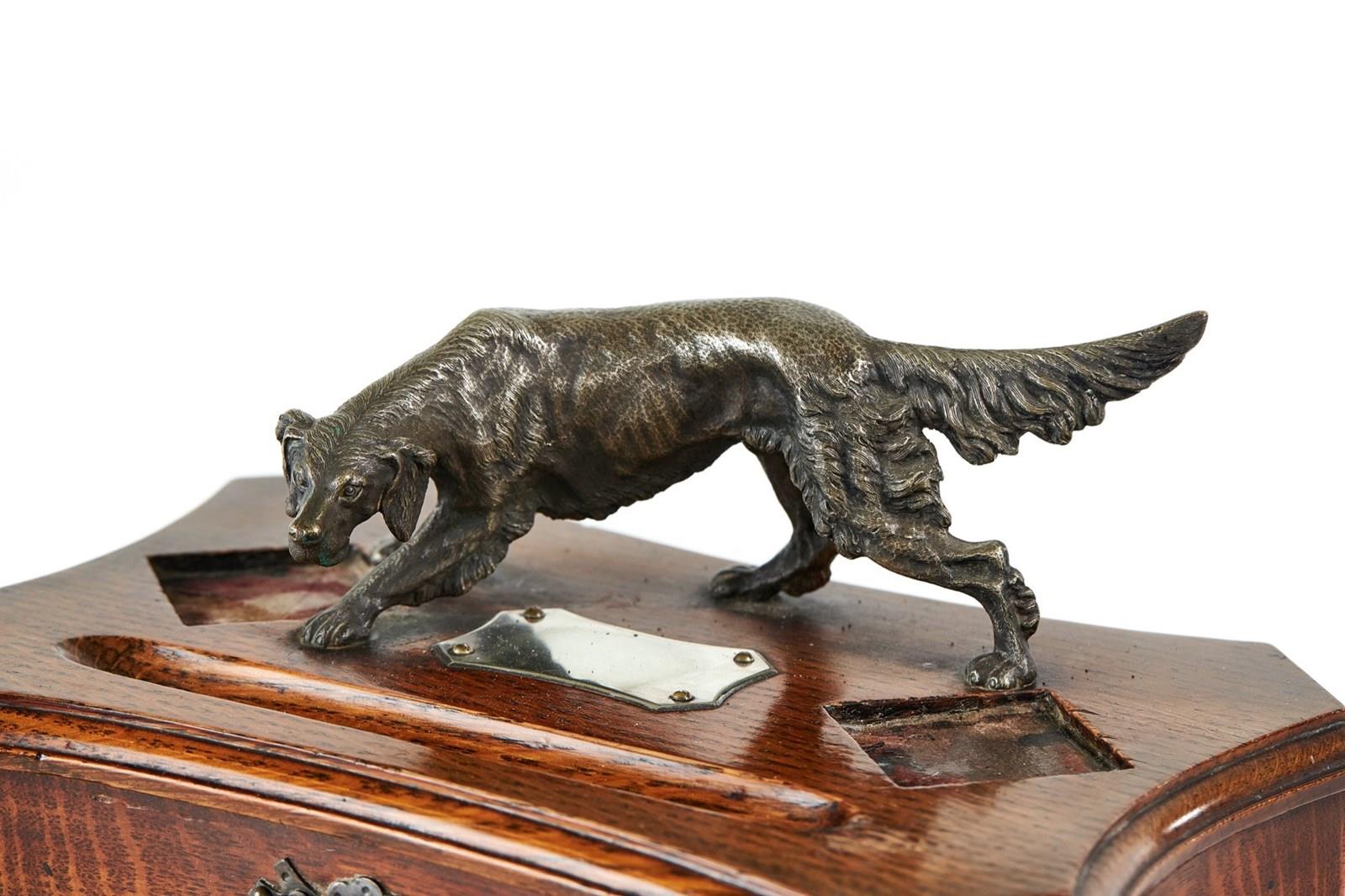 Oak Cased Desk Stand, Mounted Silver plated on brass red Setter dog, good detailed casting,