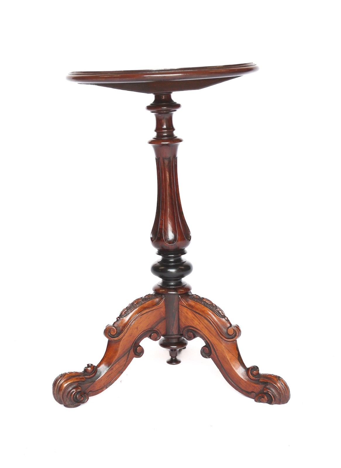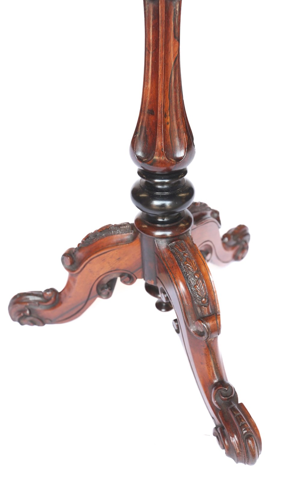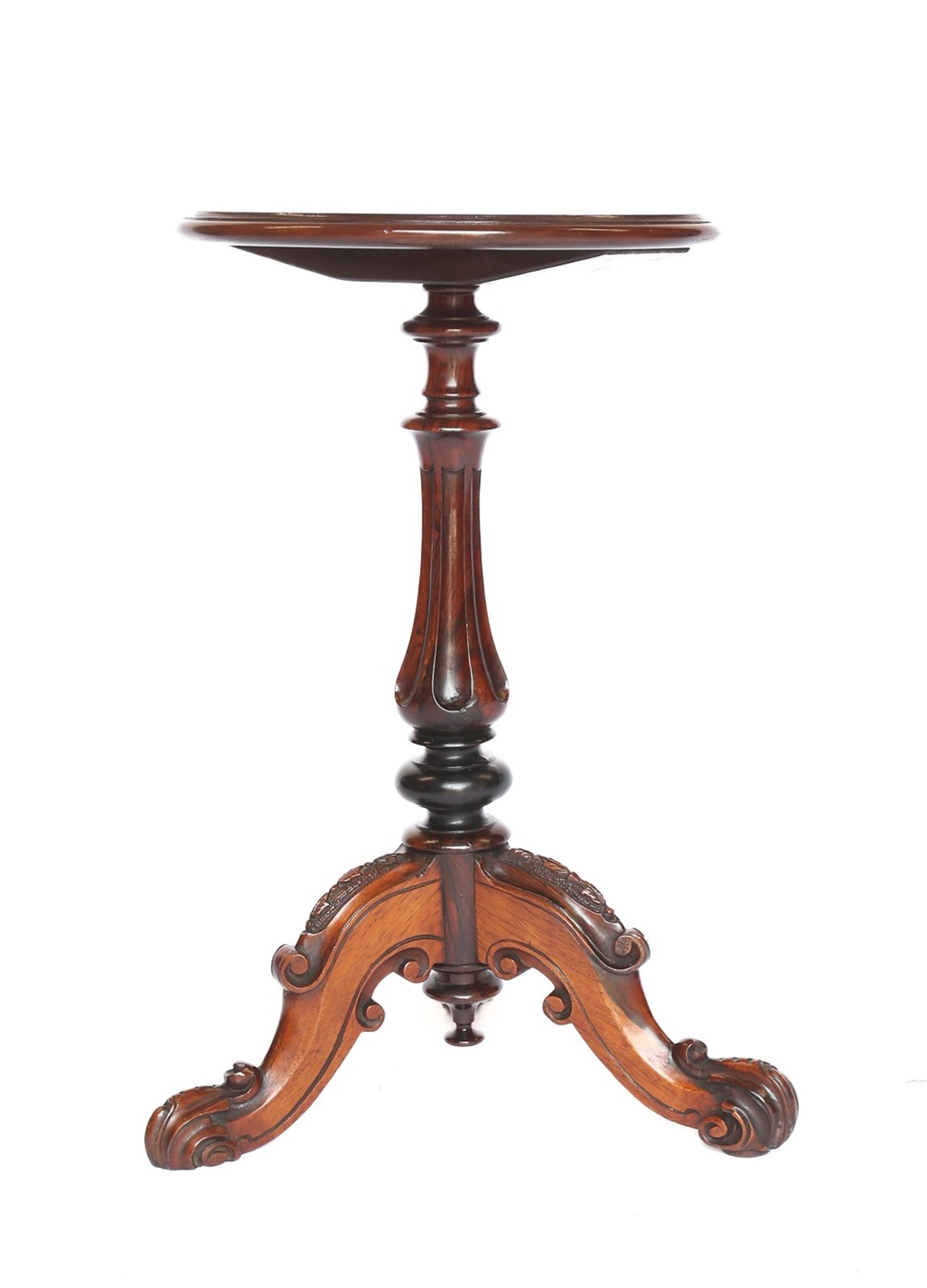 Victorian Rosewood & Carved Lamp Table. Circular top with thumb mould edge 33cm diameter. Turned & Carved Shaped Column. Rosewood & Ebonised detail. Tripod Cabriole shaped legs With Carved Detail & Scroll carved feet. Recently Polished