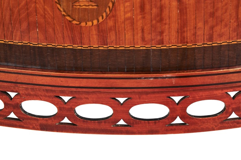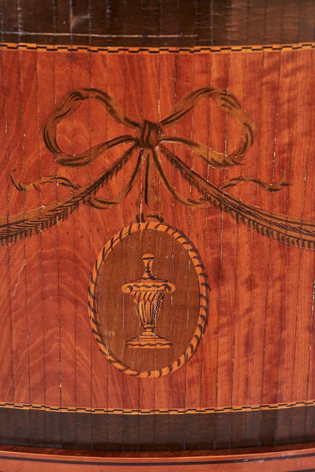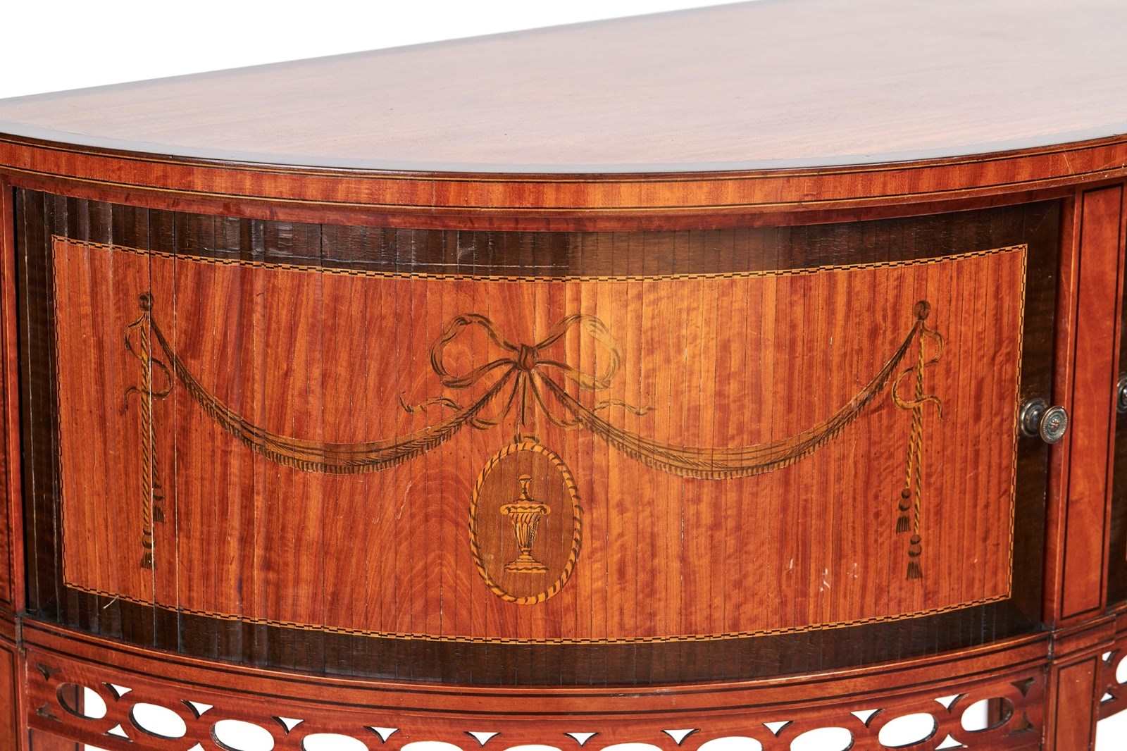 Front with Pair Satinwood Tambour sliding doors,Painted Decoration with Swags, Ribbon, & Urn Cameos, with Painted Cross Banding & Chequer Inlay