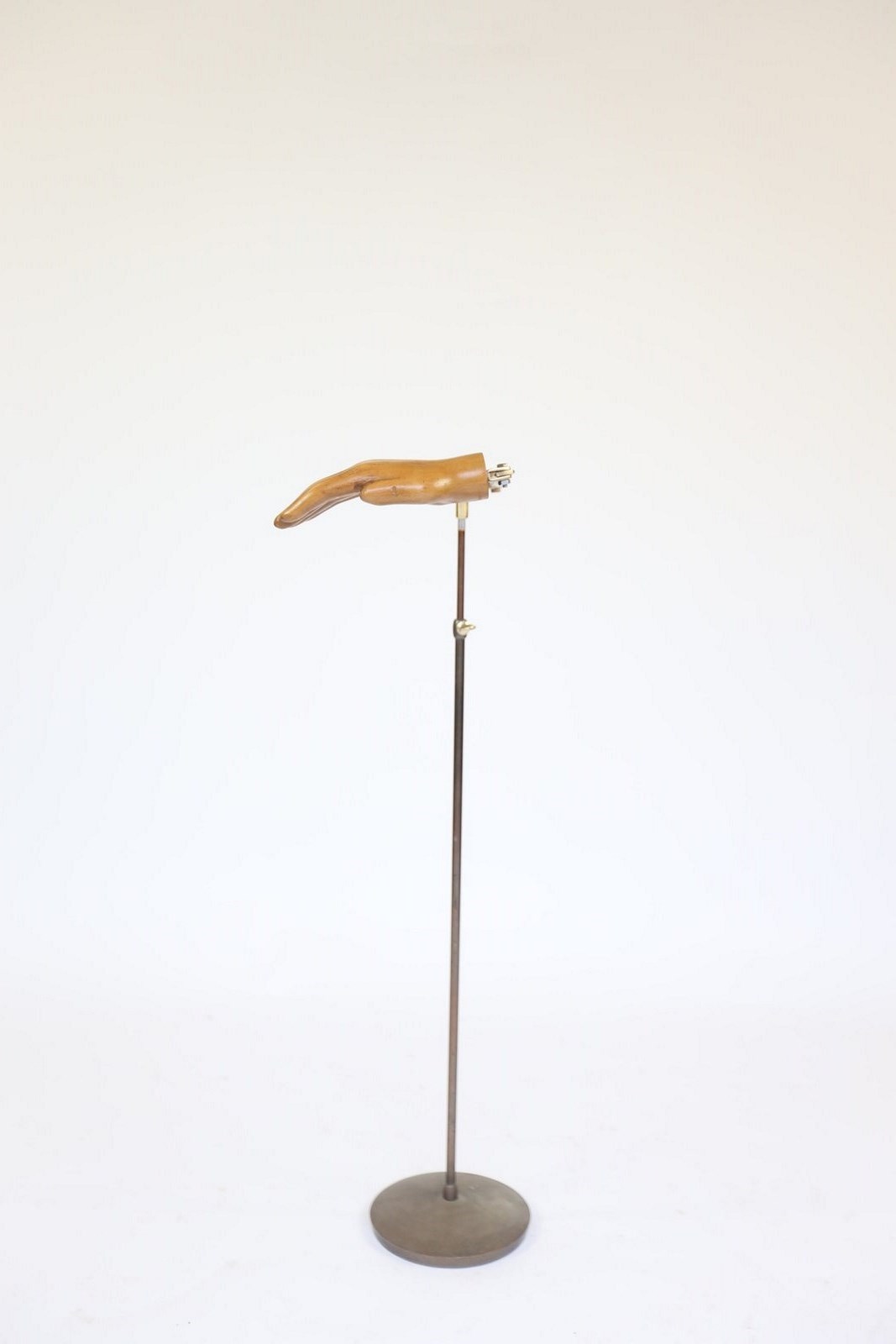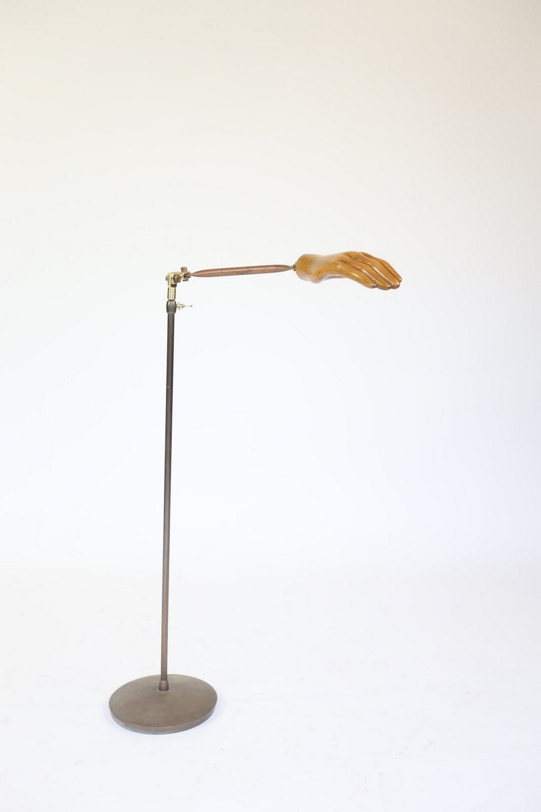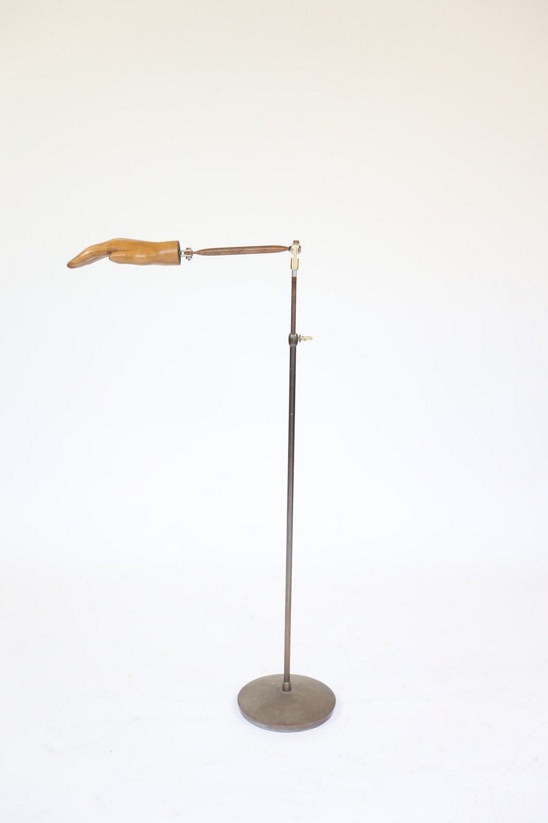 Vintage Beech Shop Display Glove Stand circa 1930s, Maker is Harris & Sheldoon Ltd B, Ham. Mounted on Brass & Copper Telescopic stand. Beech Carved Hand for glove Display. Brass & Copper Columns & Fittings. Base with Copper Plated Cap On Cast Iron Stand.