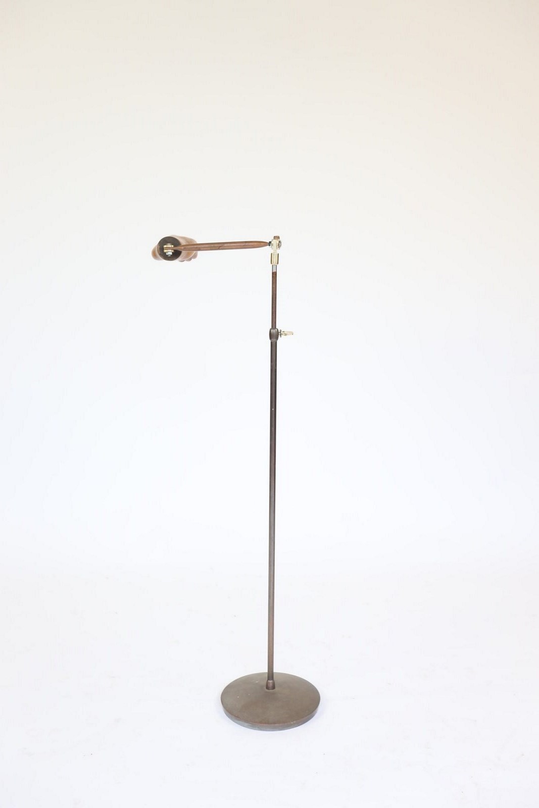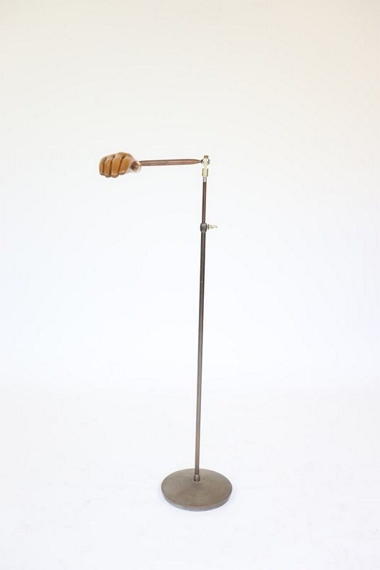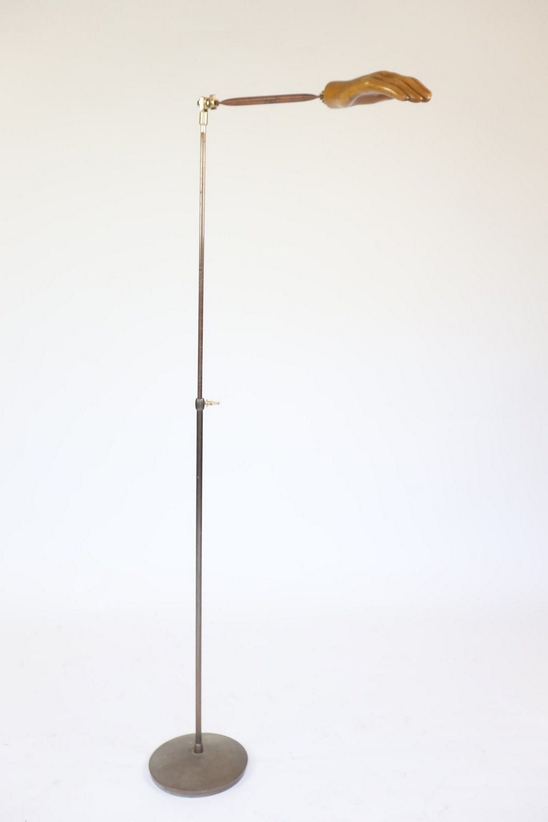 Vintage Beech Shop Display Glove Stand circa 1930s, Maker is Harris & Sheldoon Ltd B, Ham. Mounted on Brass & Copper Telescopic stand. Beech Carved Hand for glove Display. Brass & Copper Columns & Fittings. Base with Copper Plated Cap On Cast Iron Stand.