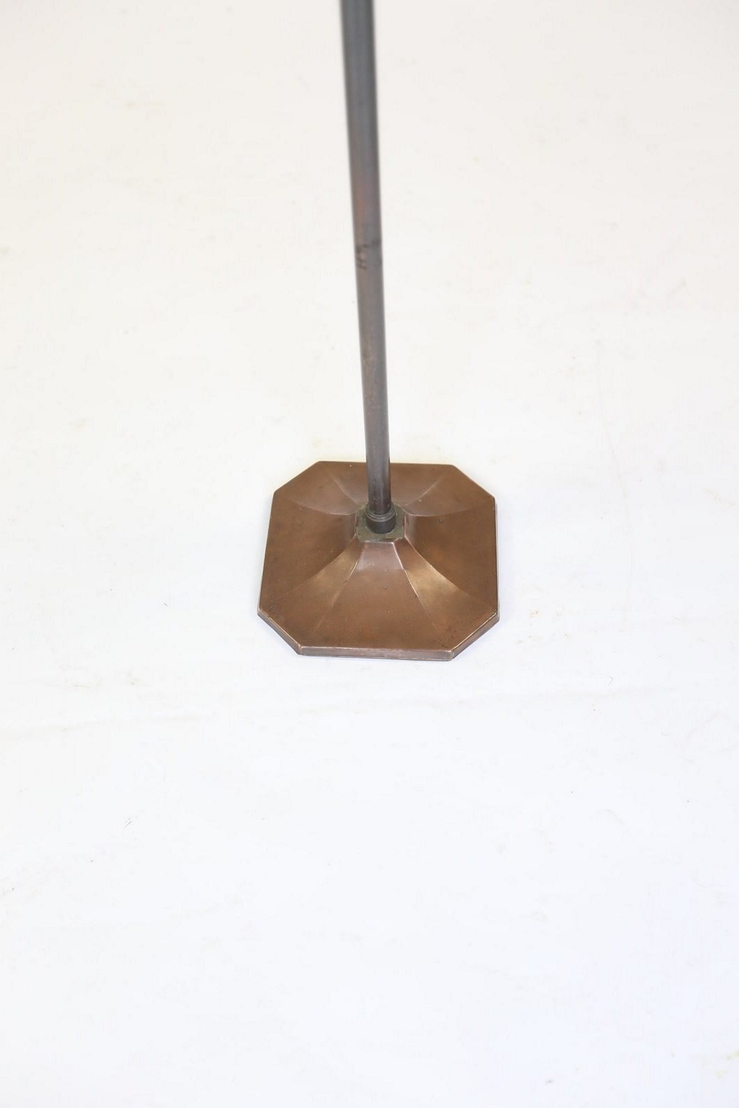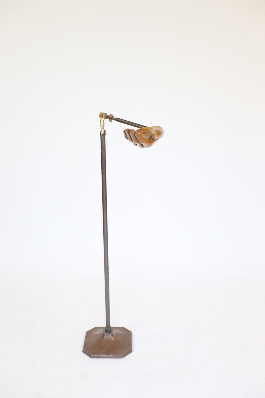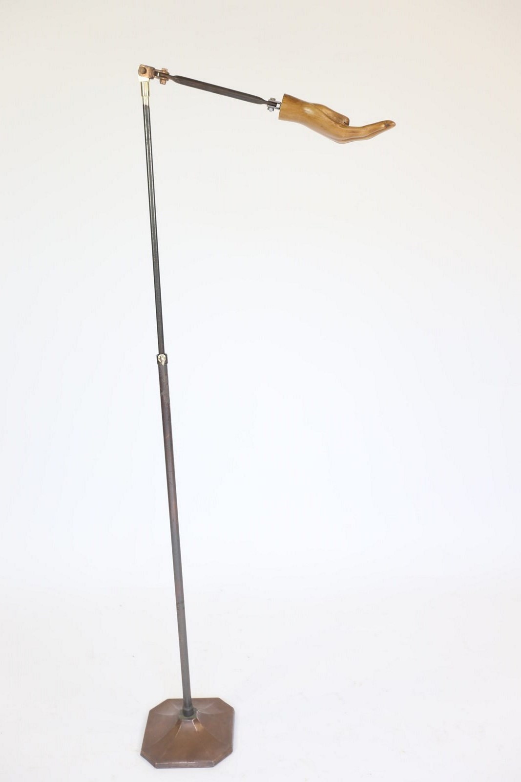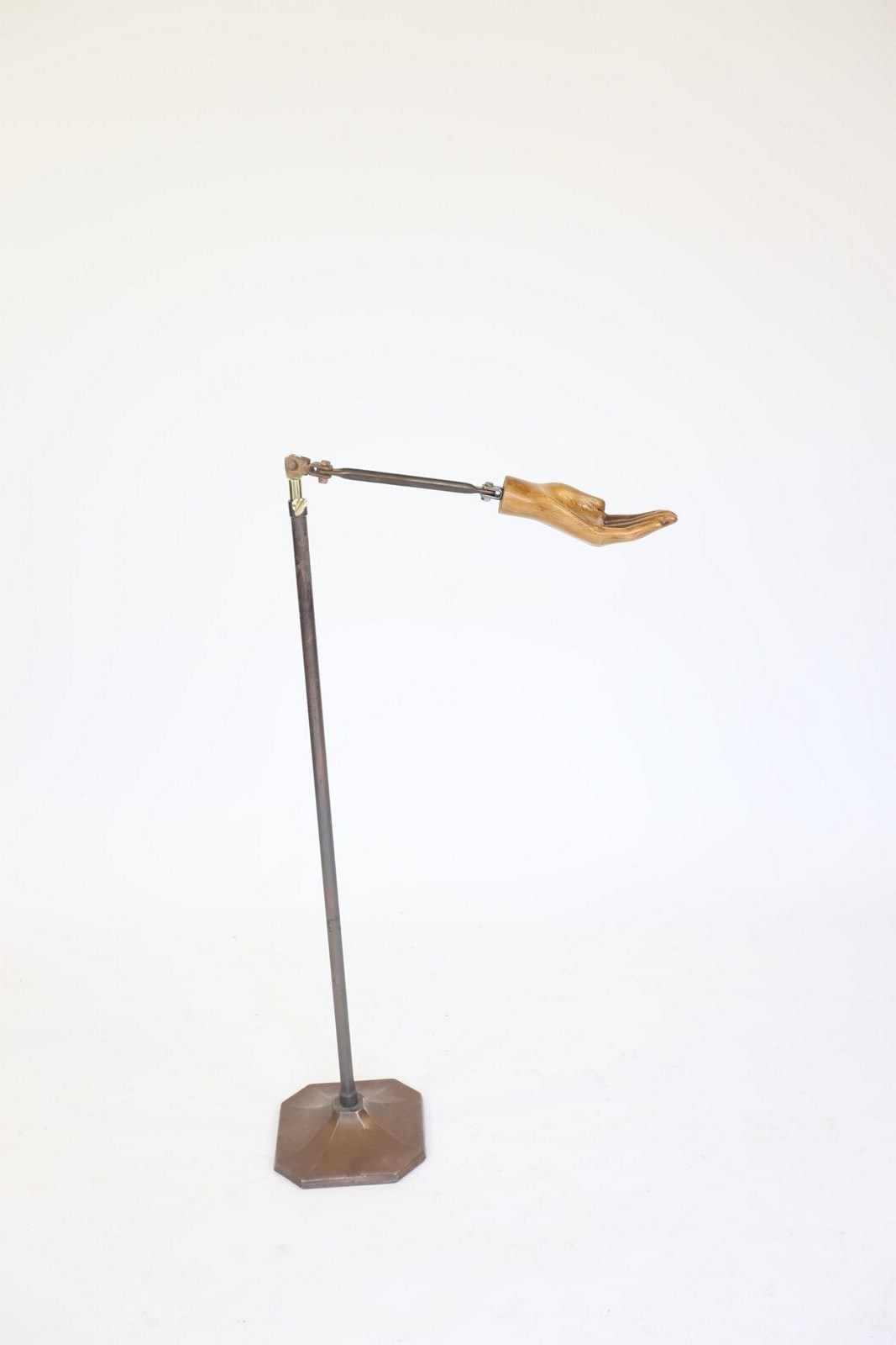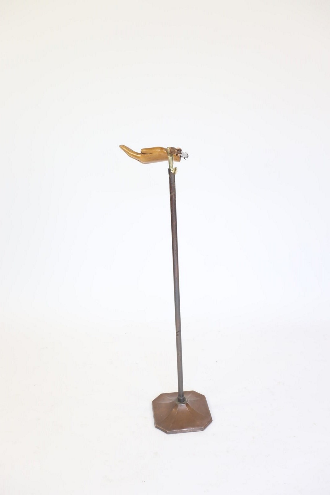 Vintage Beech Shop Display Glove Stand circa 1930s, Mounted on Brass & Copper Telescopic stand, Beech Carved Hand for glove Display. Brass & Copper Columns & Fittings, base with Copper Plated Cap On Cast Iron Stand.