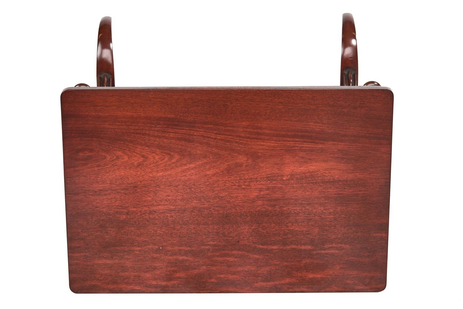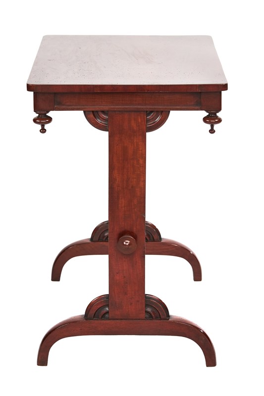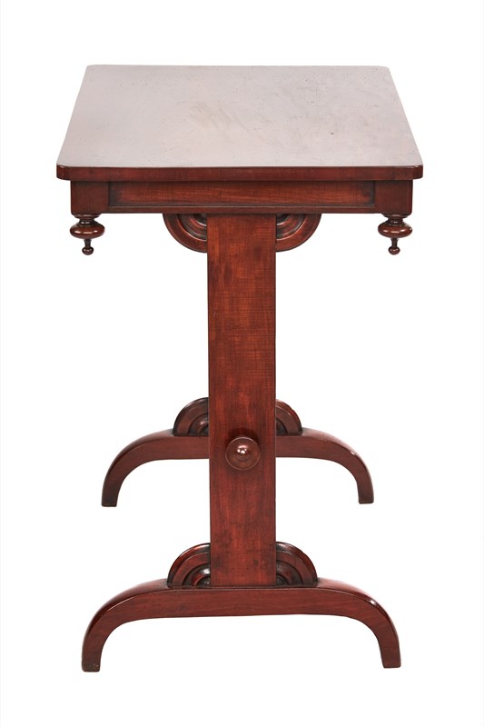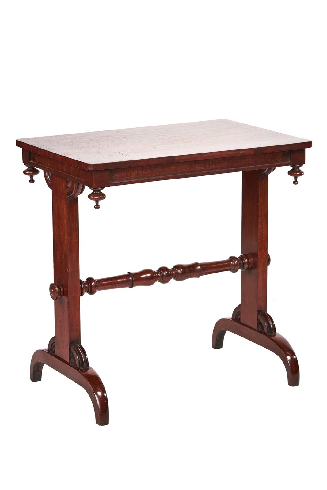 W1V Period Mahogany End Support Table. Plain Mahogany top, Inset Frieze with 4 turned finials, End Supports with carved mounts, Turned Mahogany Cross Stretcher, Sitting on Arch Shaped Legs. Recently Polished. Good Quality Timber