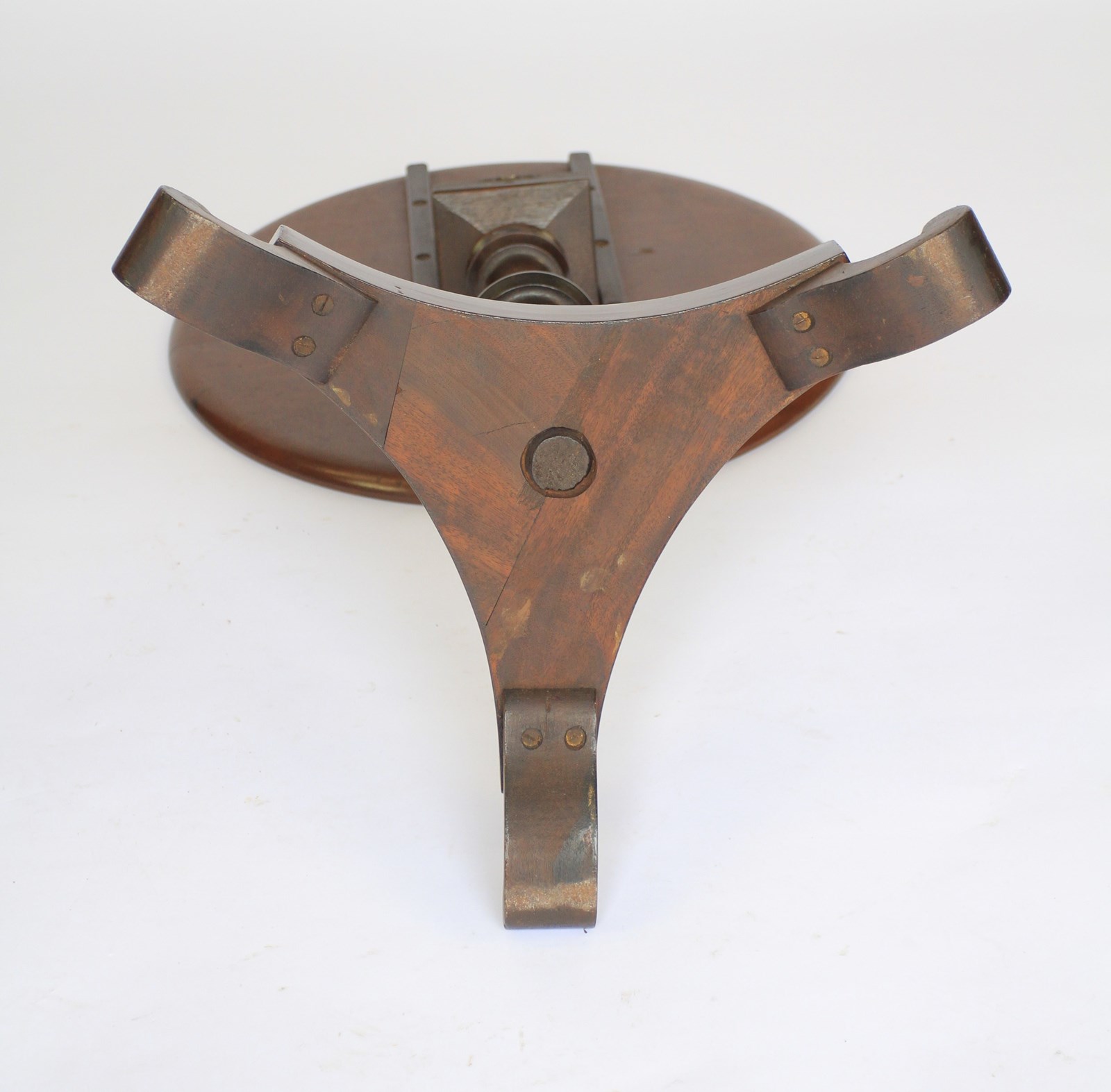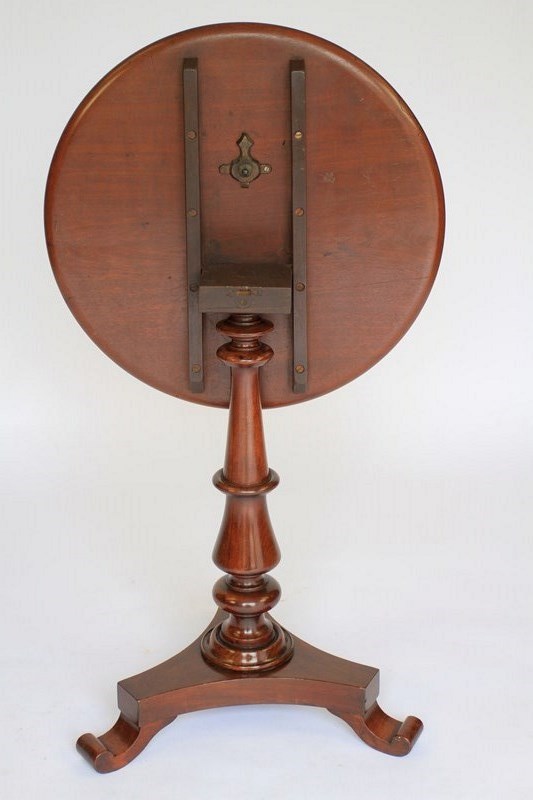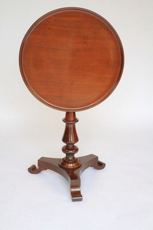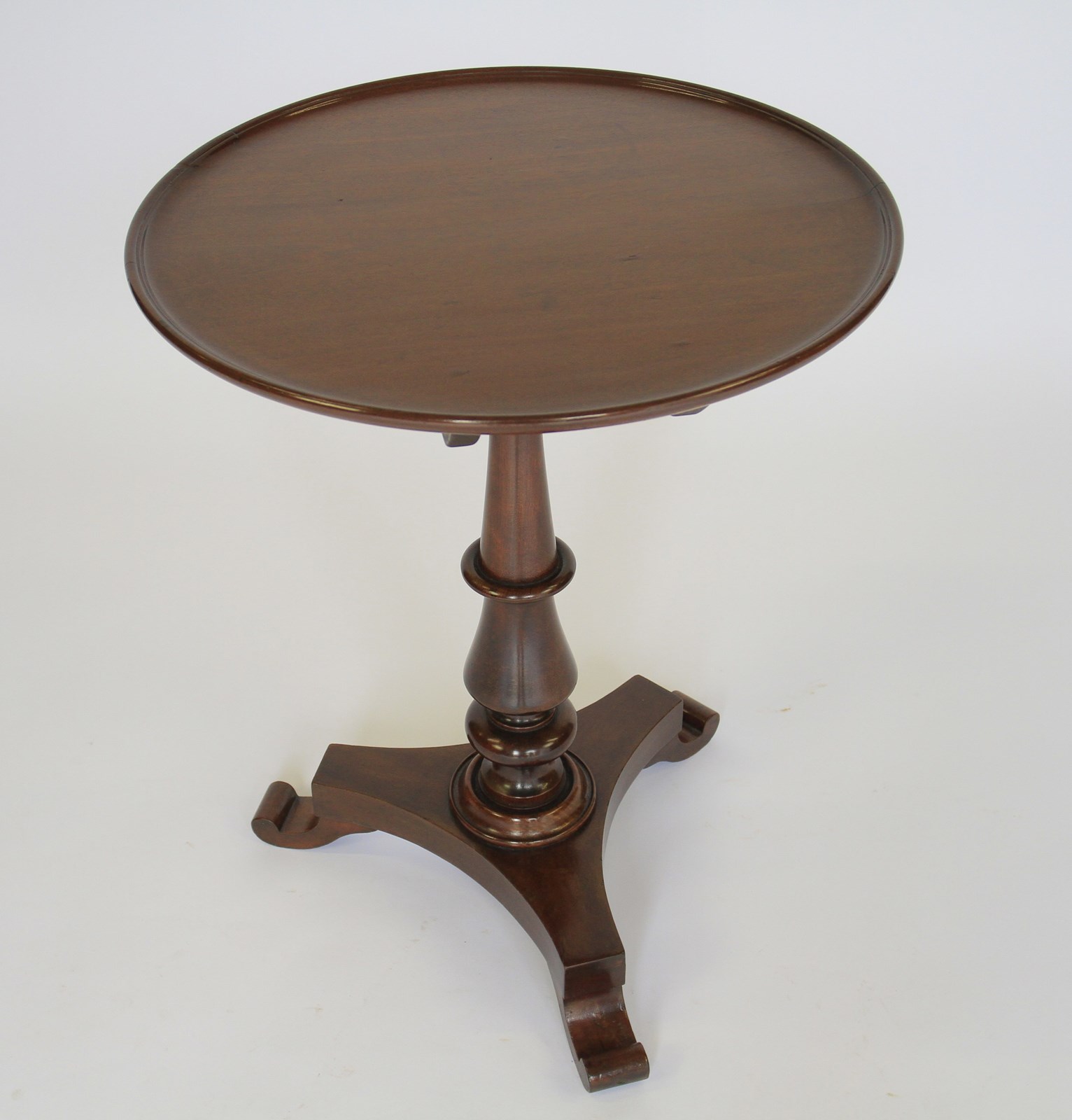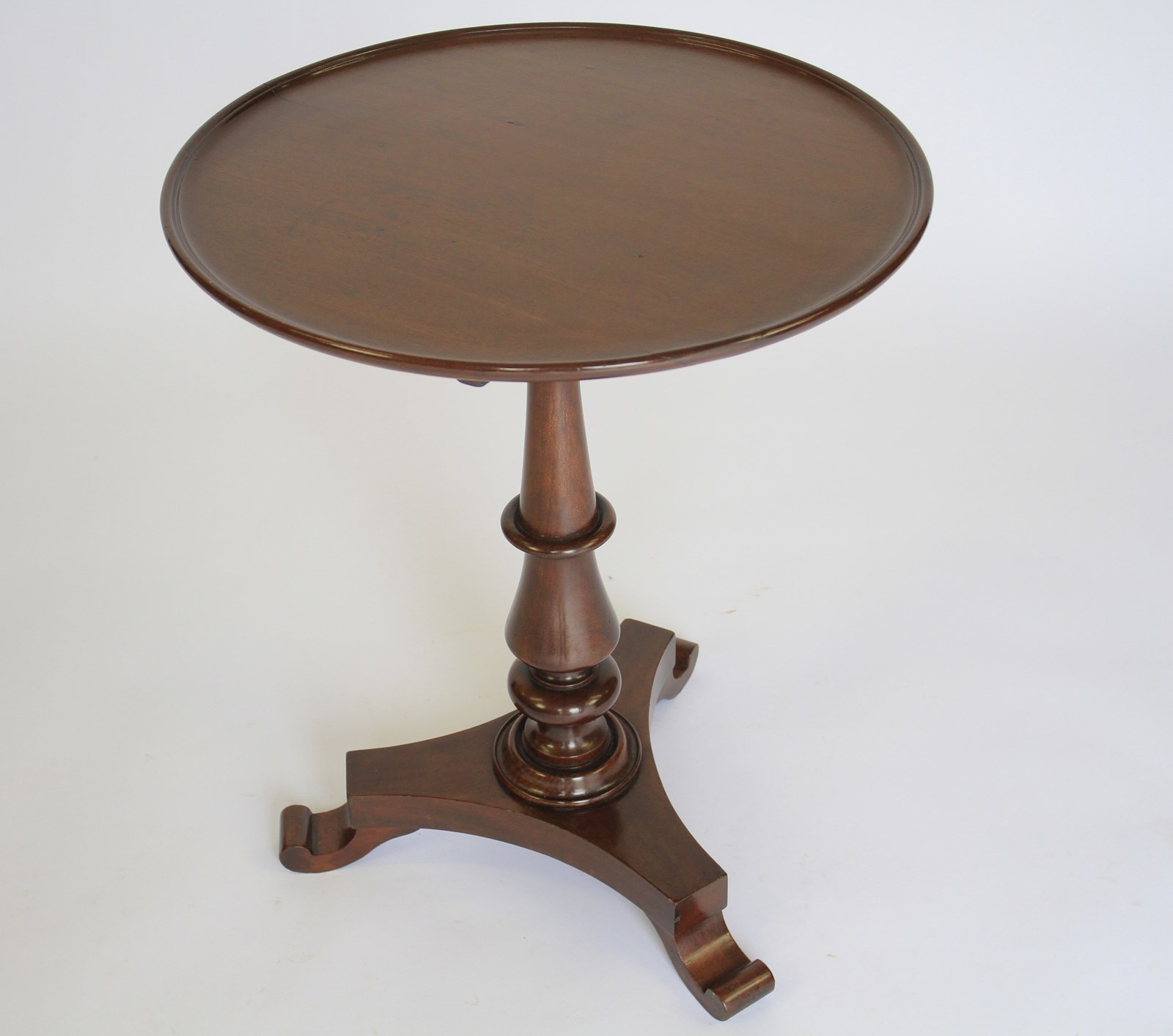 William 1V period Mahogany tip-up table circa 1830s. Circular dish top, 51 cm diameter. Brass catch under to release top, Turned Pedestal, Triform shaped Platform base, 3 curved splay feet. Good quality Mahogany. Recently Polished.