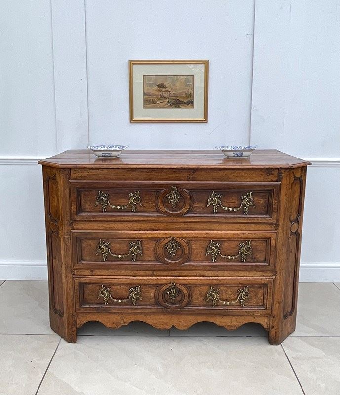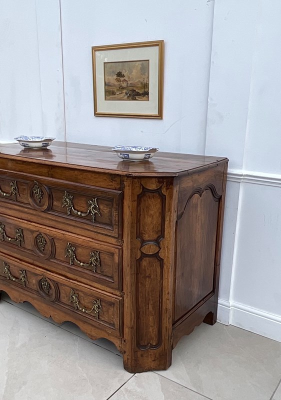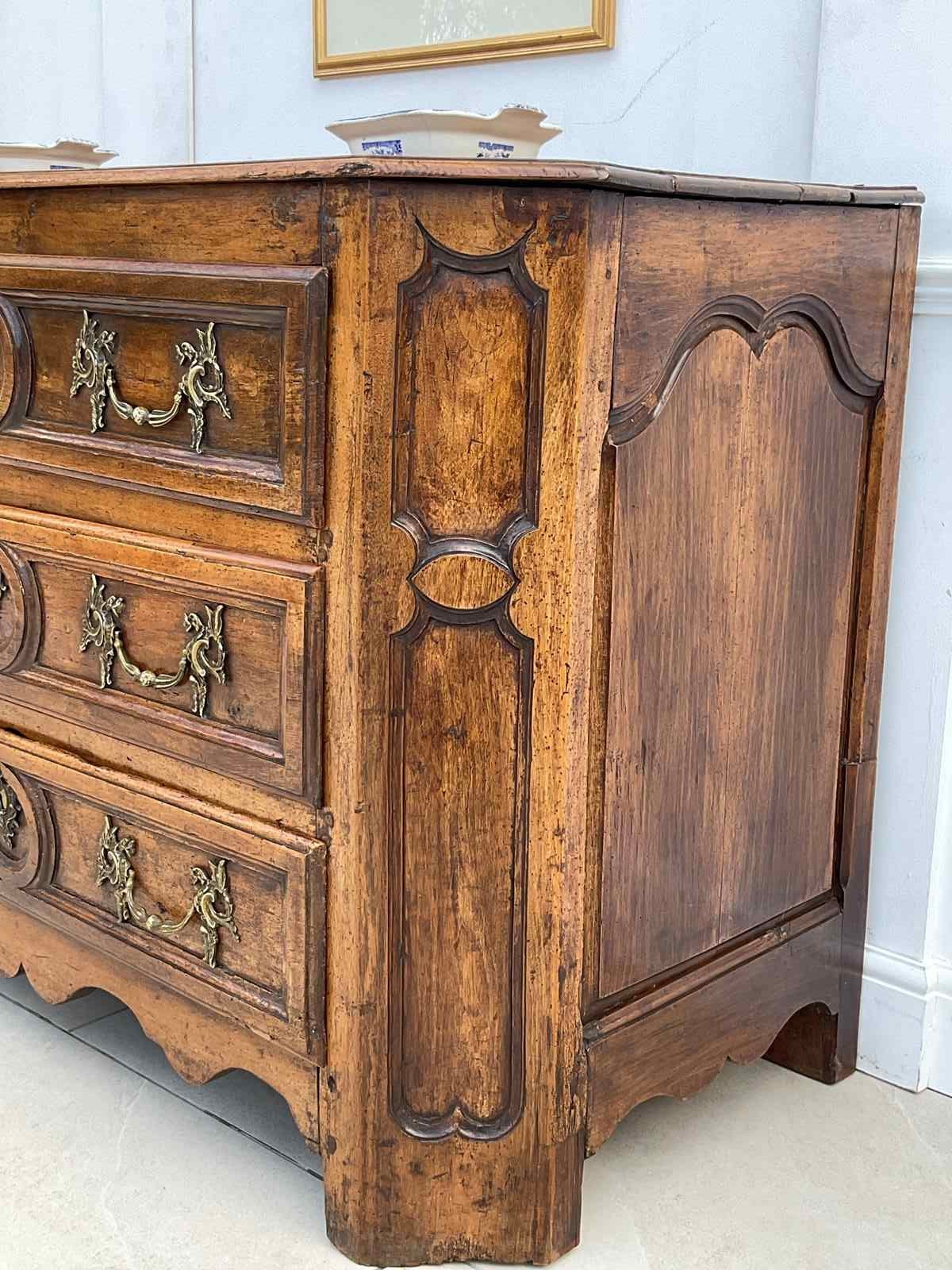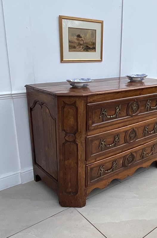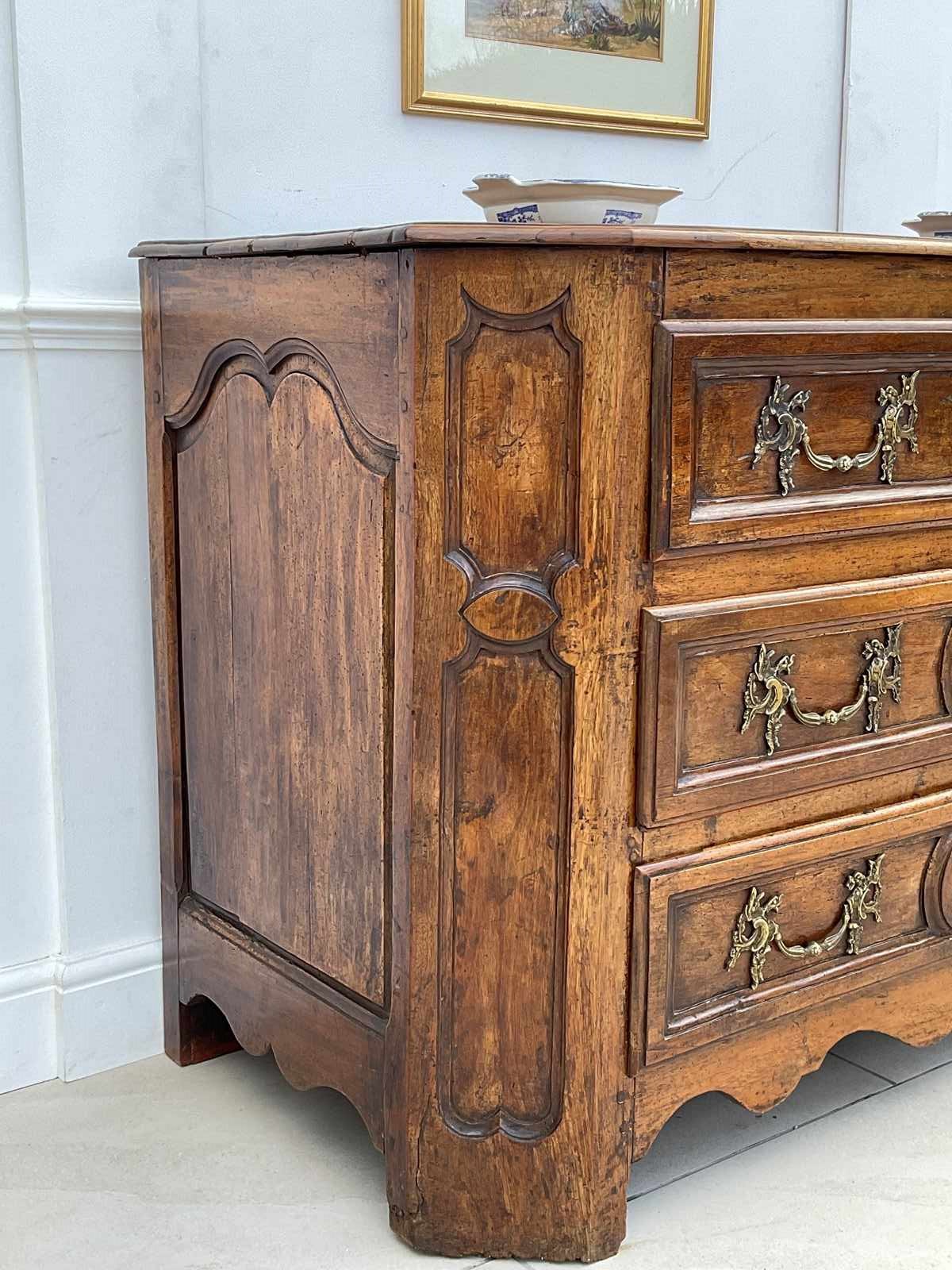 An impressive walnut commode of grand scale and excellent quality. Crafted in France in the late 18th century from wonderfully mellow walnut with quality rococo brass drop handles, it has acquired the most beautiful colour and patina.