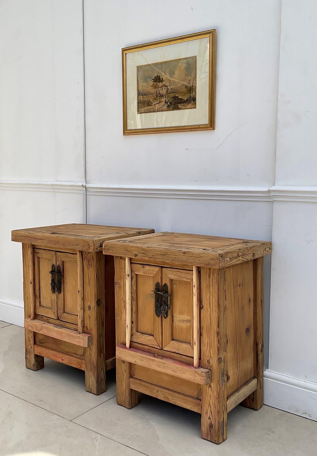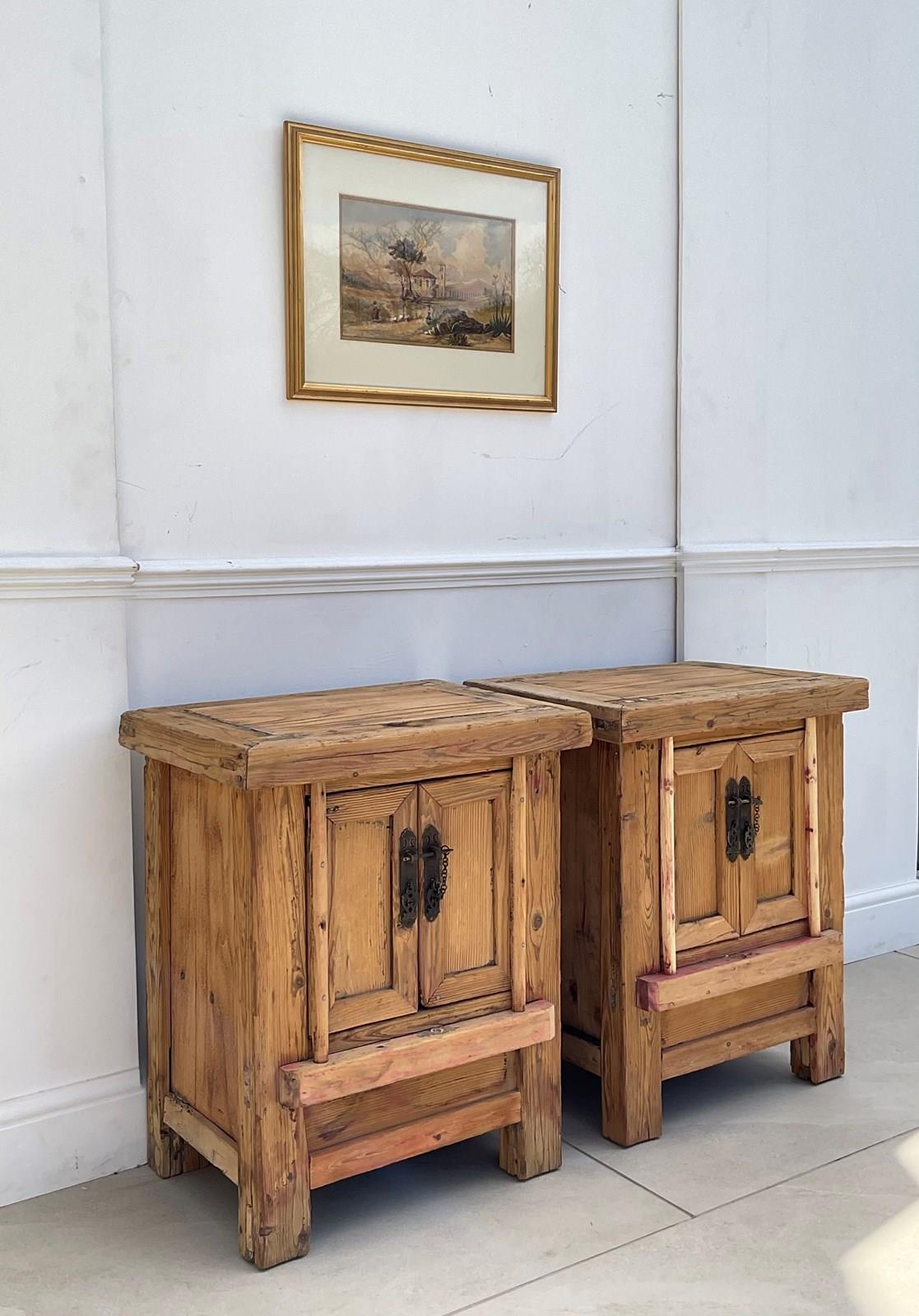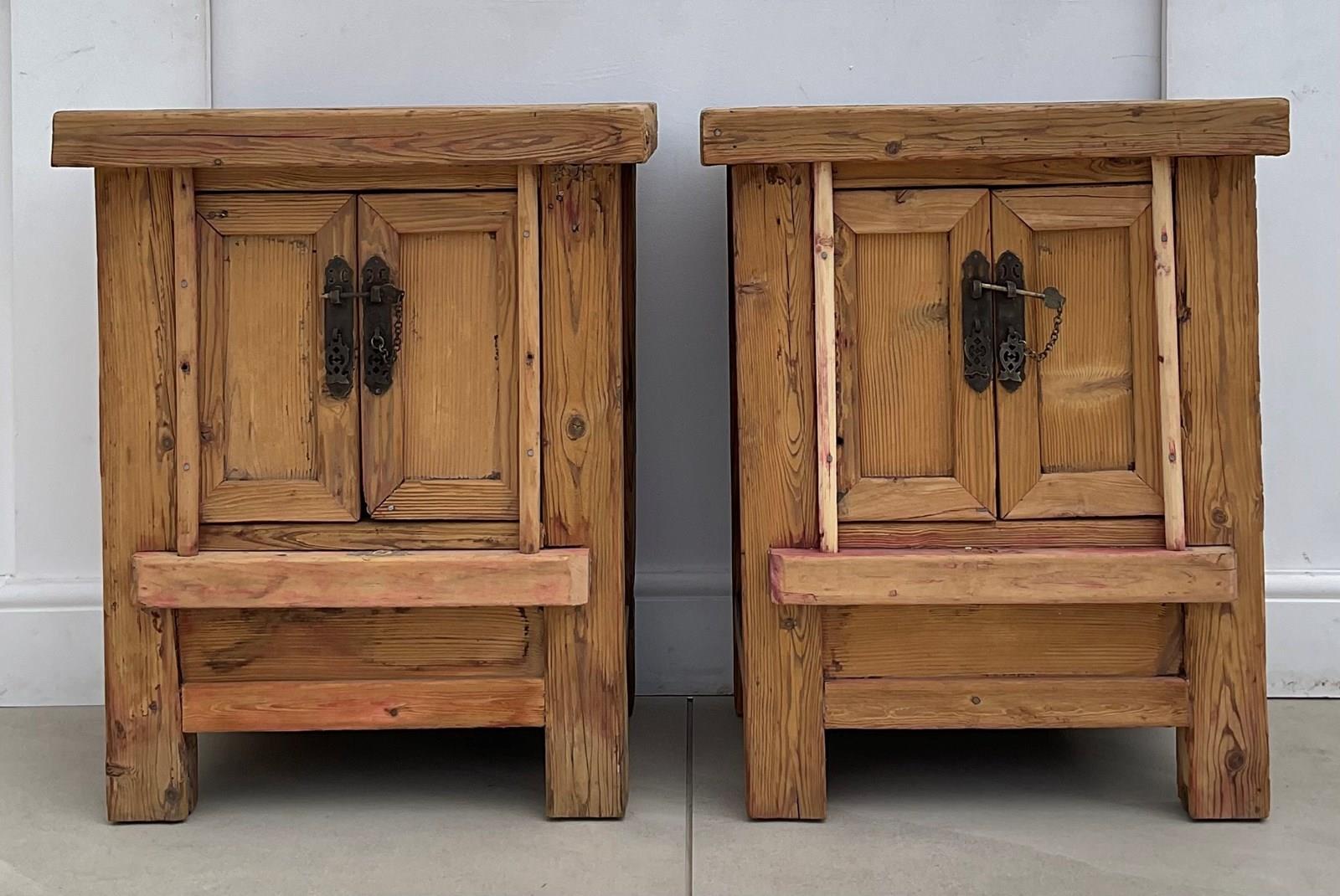 A pair of bedside cuoboards, constructed from elm and pine which , now with a bare driftwood surface.
