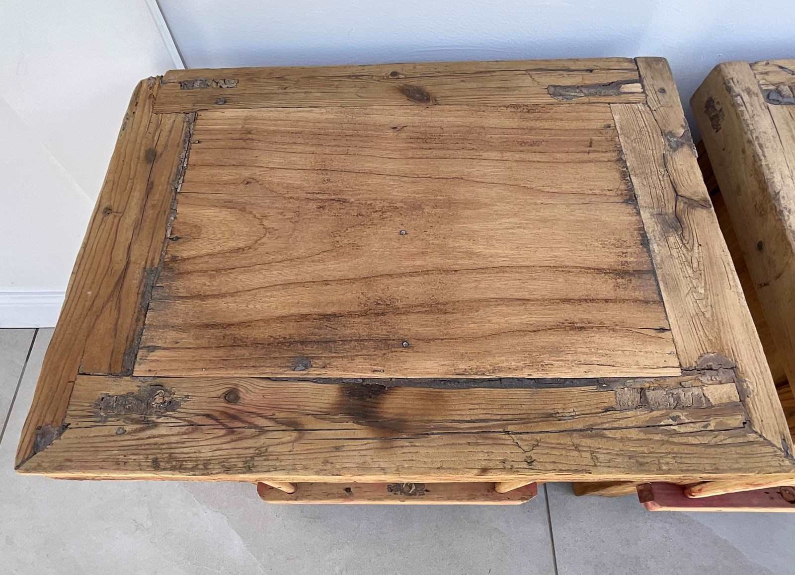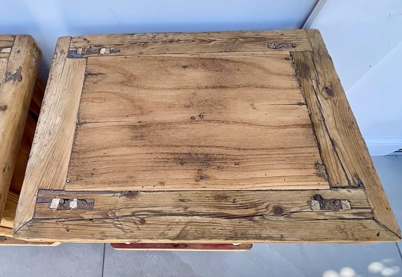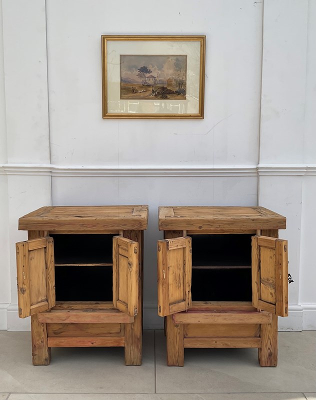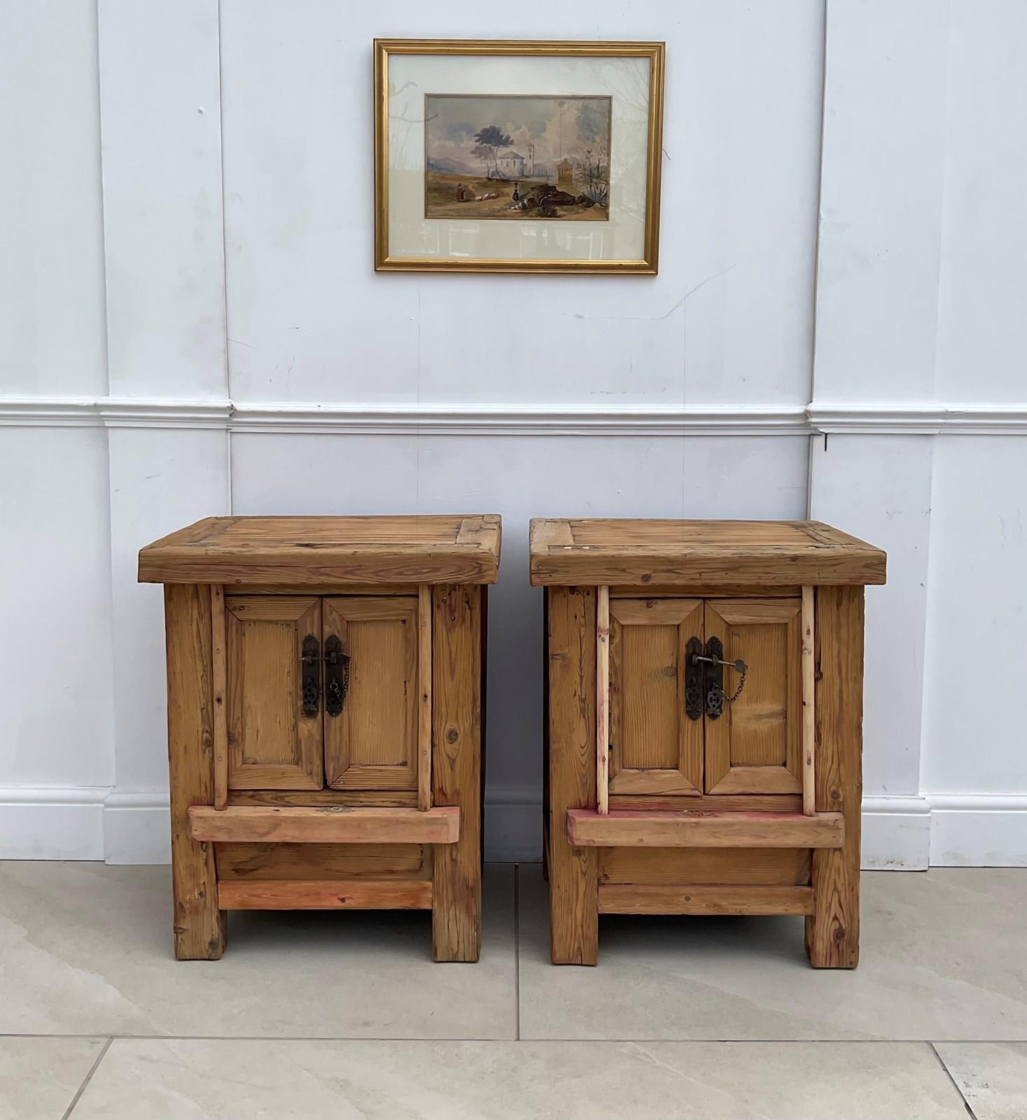 A pair of bedside cuoboards, constructed from elm and pine which , now with a bare driftwood surface.