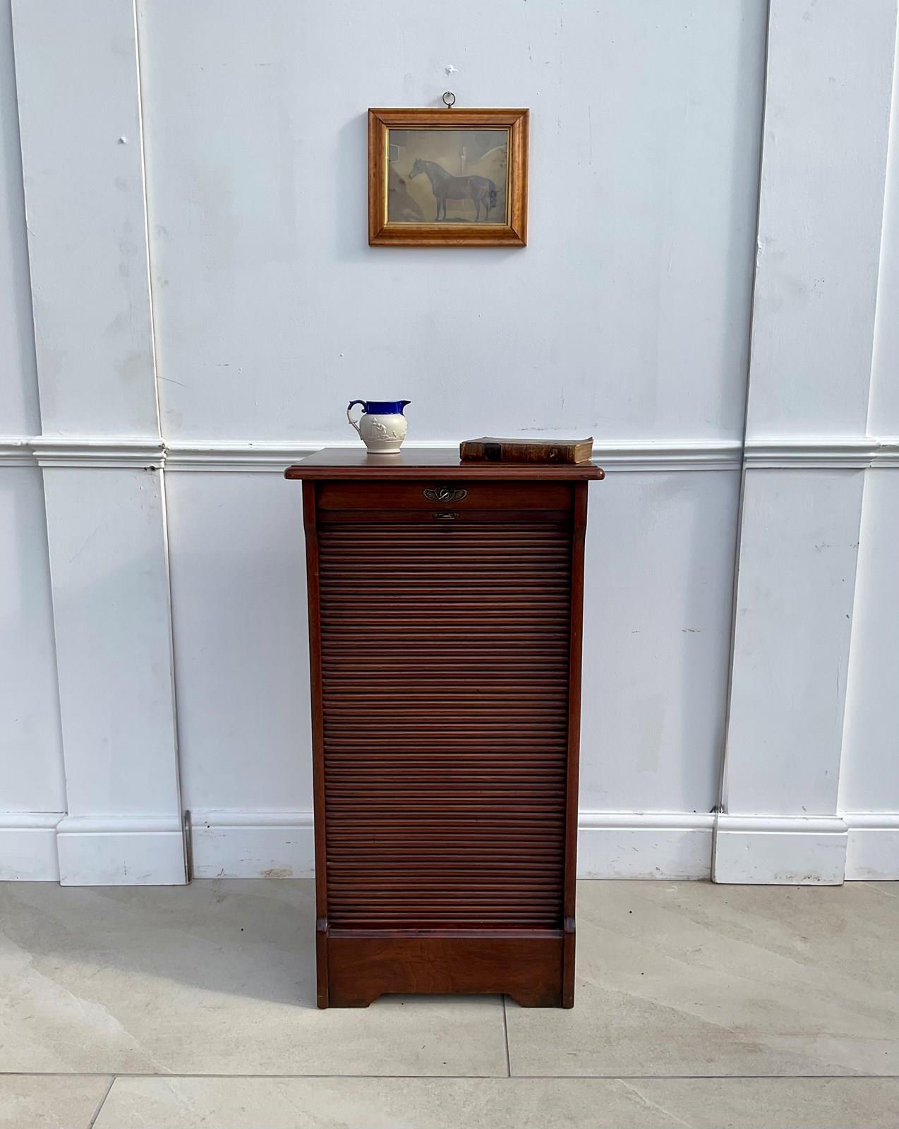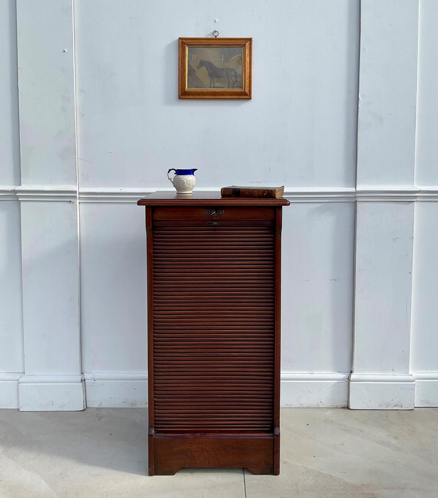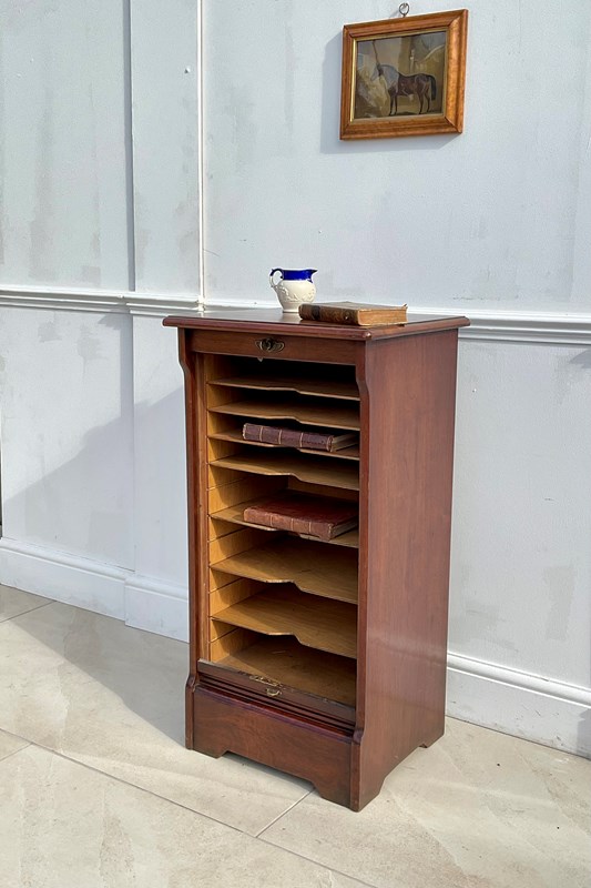 A cabinet for storing sheet music , possibly now more useful as a filing cabinet. An abundance of movable shelves and a lovely tambour door which runs very smoothly.