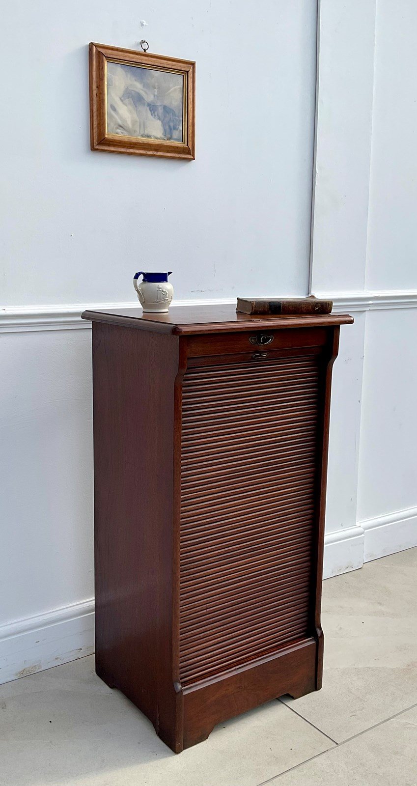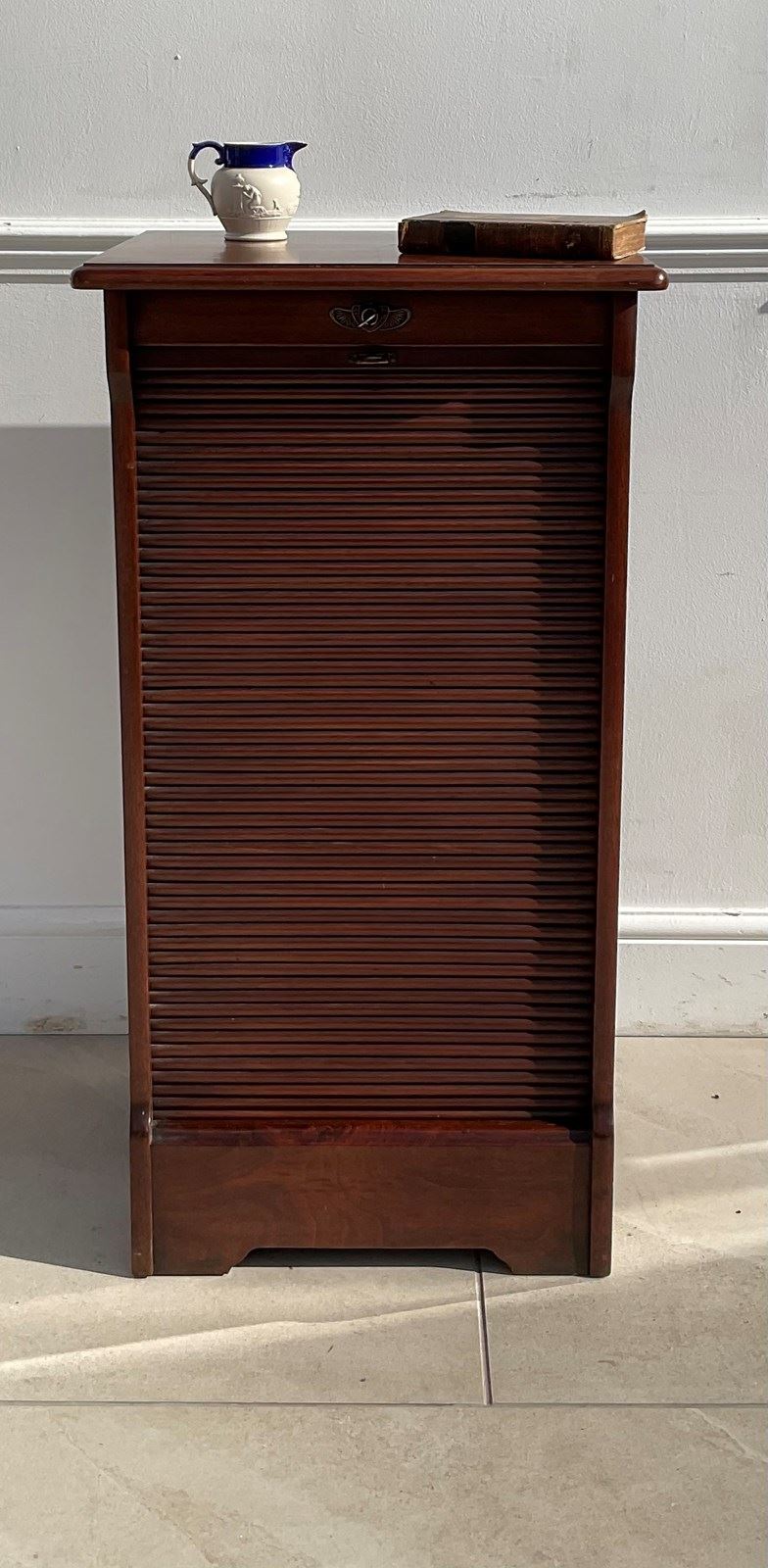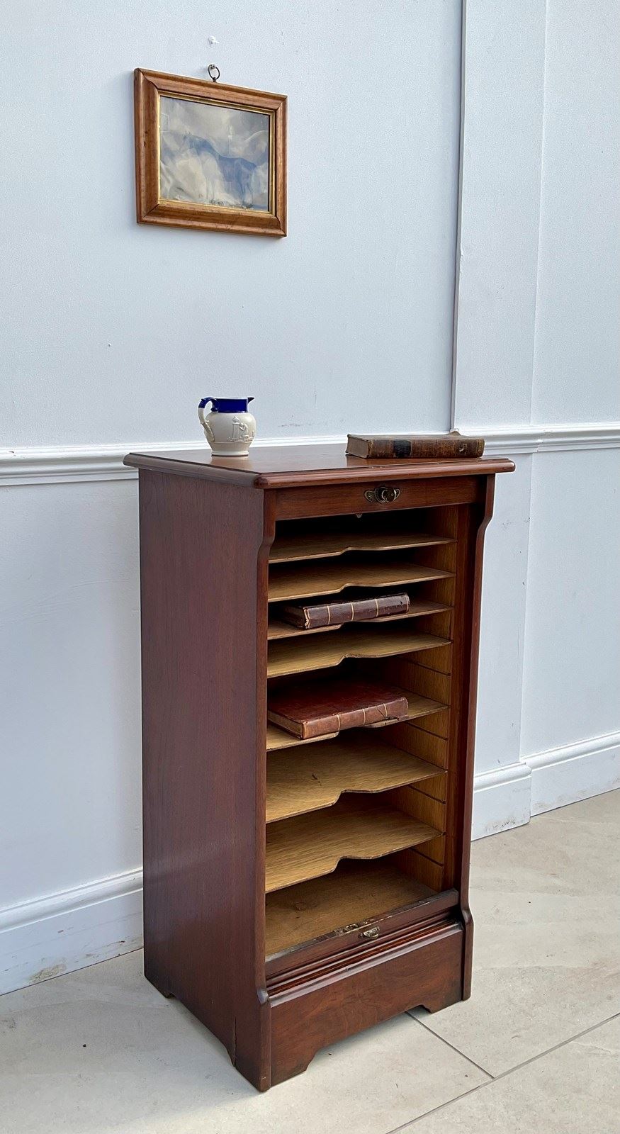 A cabinet for storing sheet music , possibly now more useful as a filing cabinet. An abundance of movable shelves and a lovely tambour door which runs very smoothly.