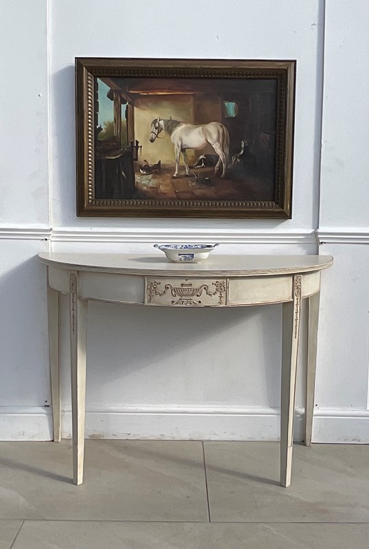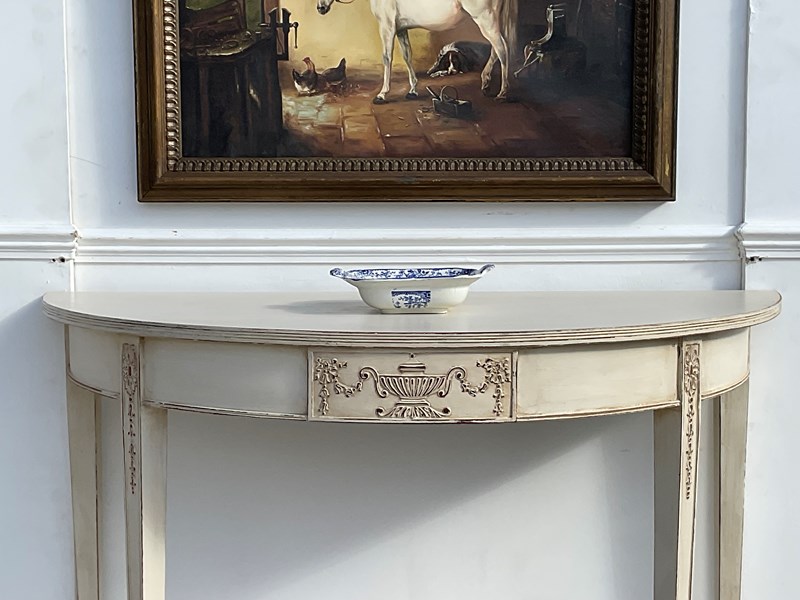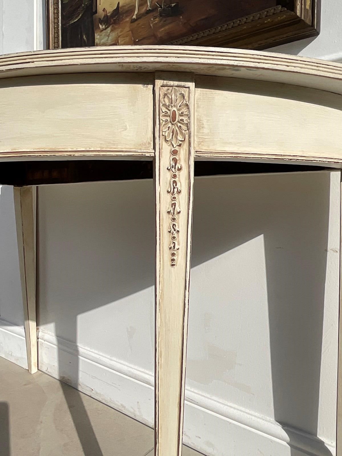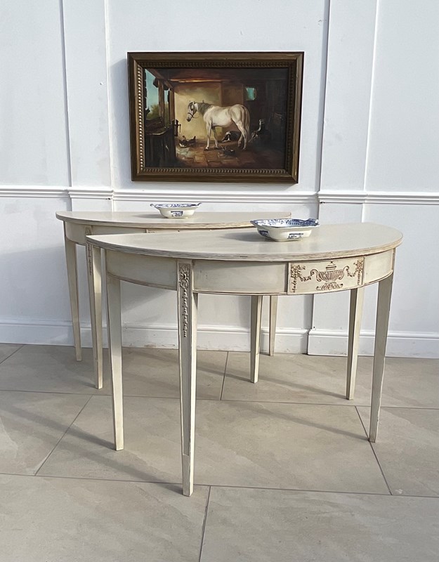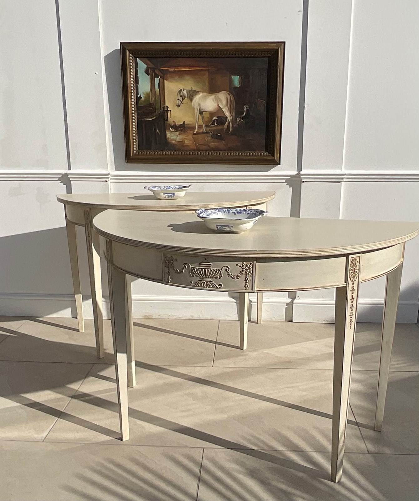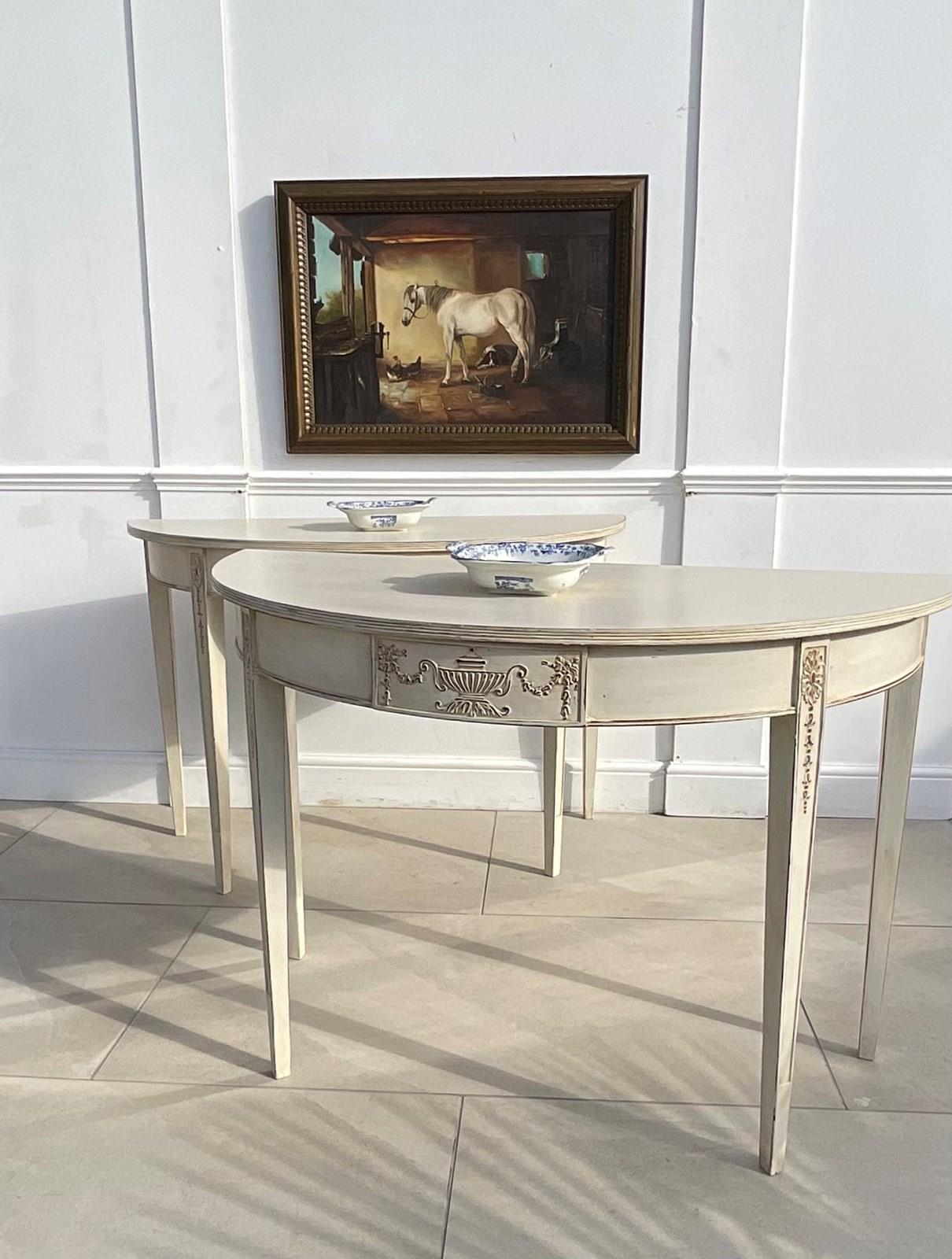 A lovely pair of console tables in the classical style with a well carved urn to the centre panel of the frieze and rosette and husk carving to the legs.