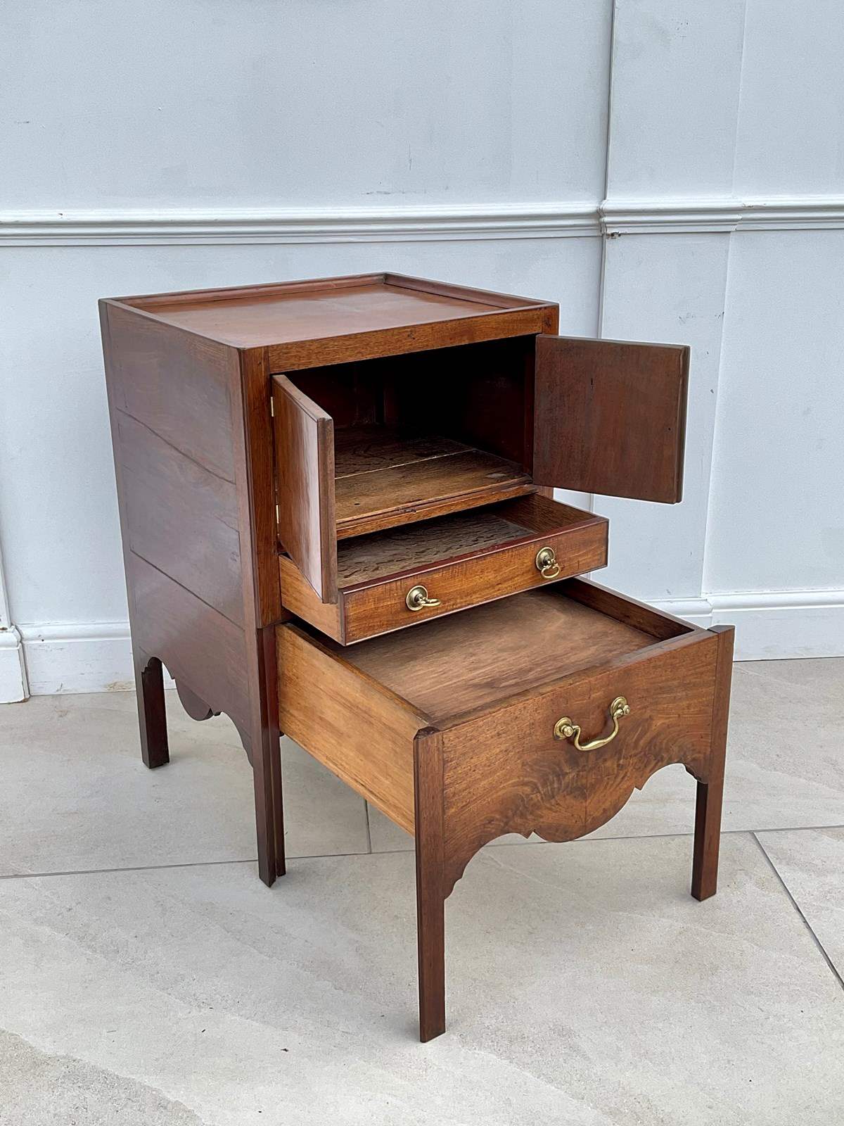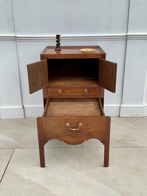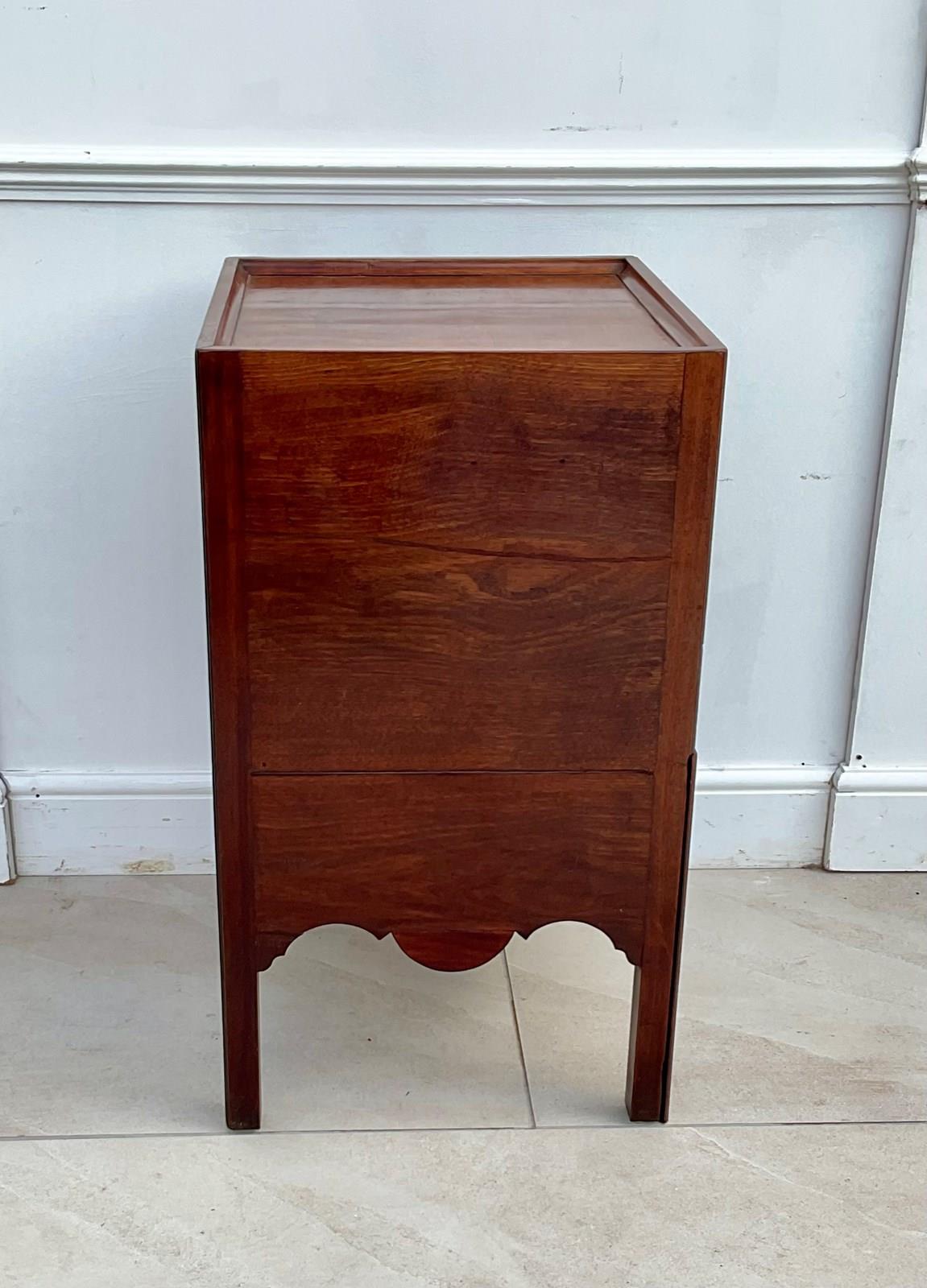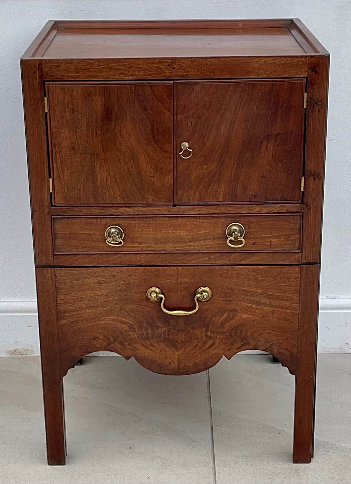 A mahogany night table with a spacious cupboard above an oak lined drawer and pull out step with a well shaped apron. It has acquired the most wonderful colour and patina over the last 250 years.