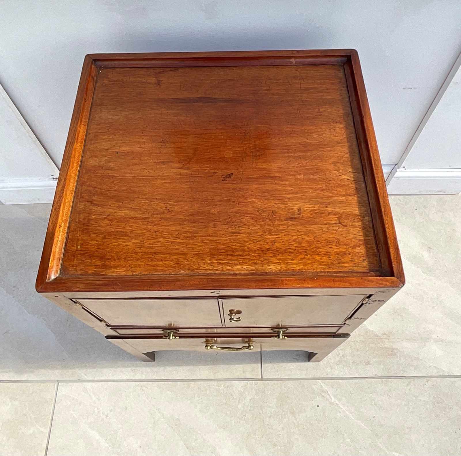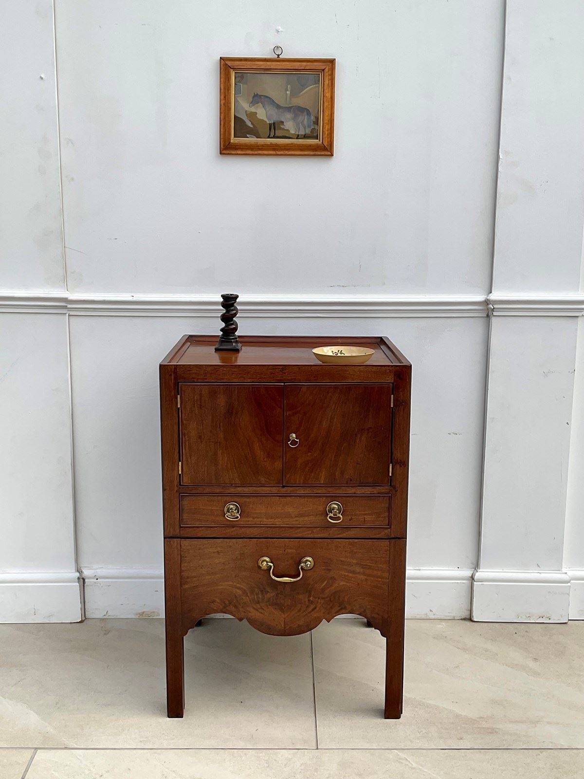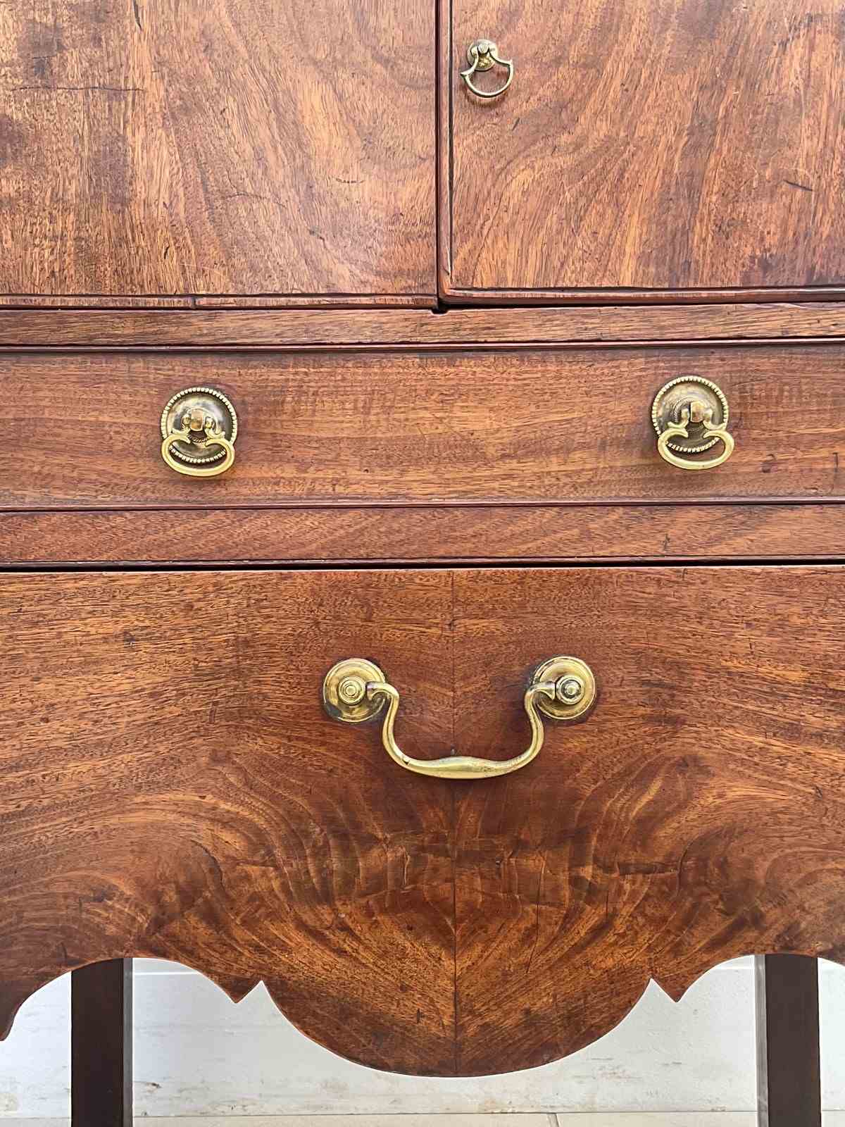 A mahogany night table with a spacious cupboard above an oak lined drawer and pull out step with a well shaped apron. It has acquired the most wonderful colour and patina over the last 250 years.