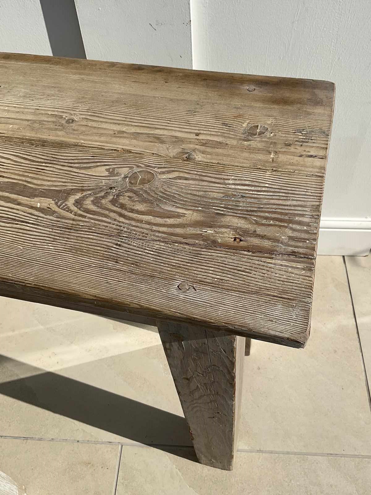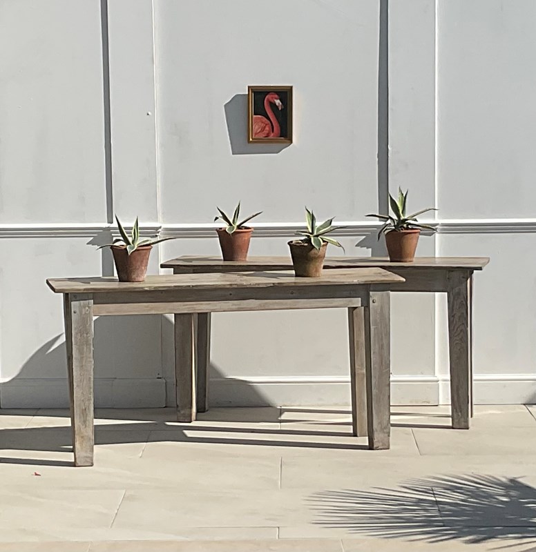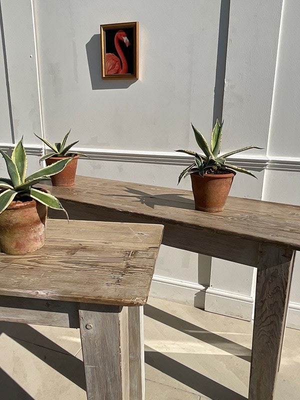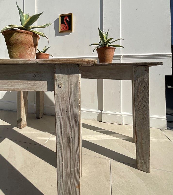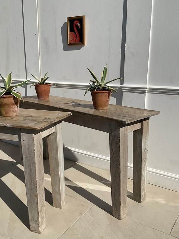 A pair of pine console tables with a worn grey paint to the bases and bleached scrub tops.