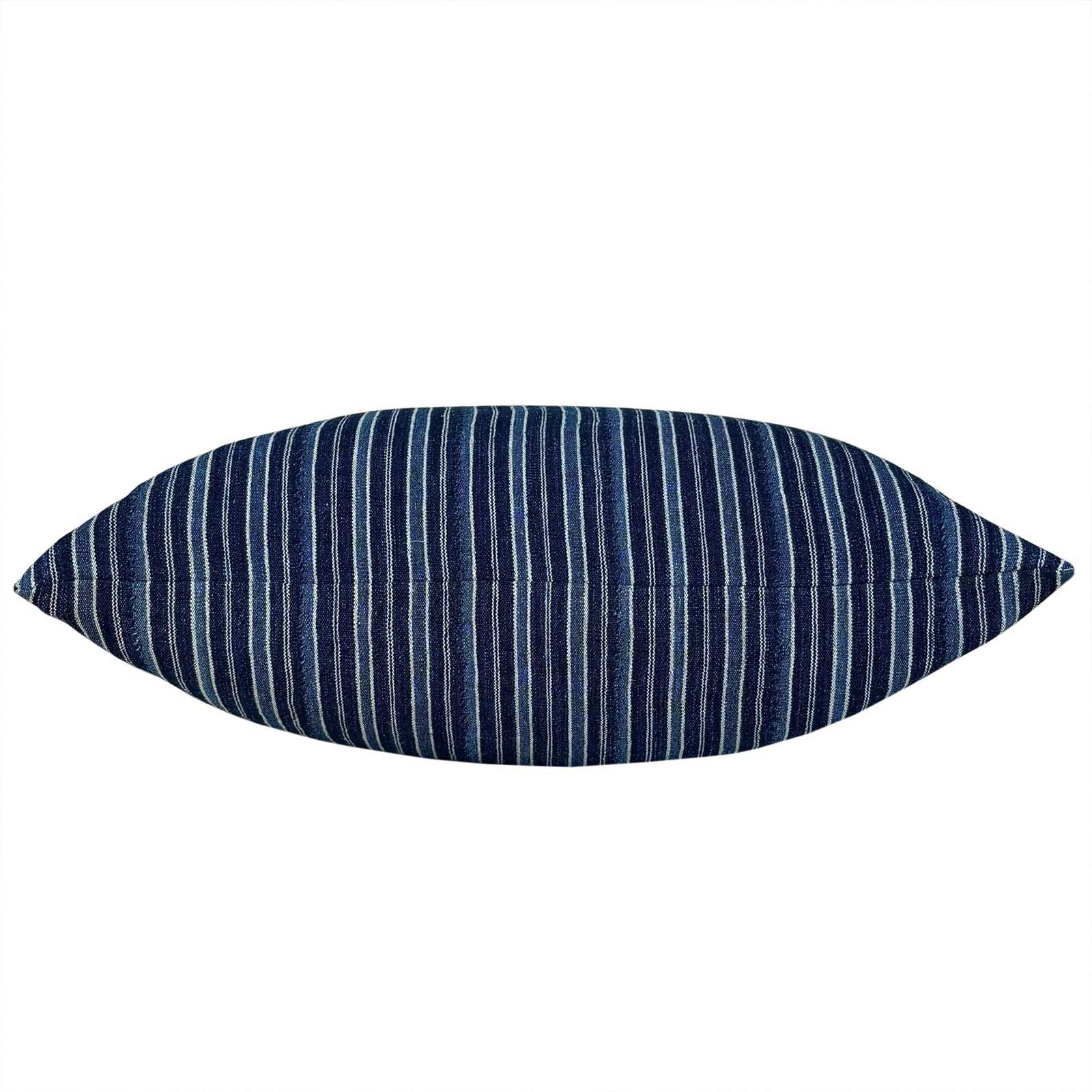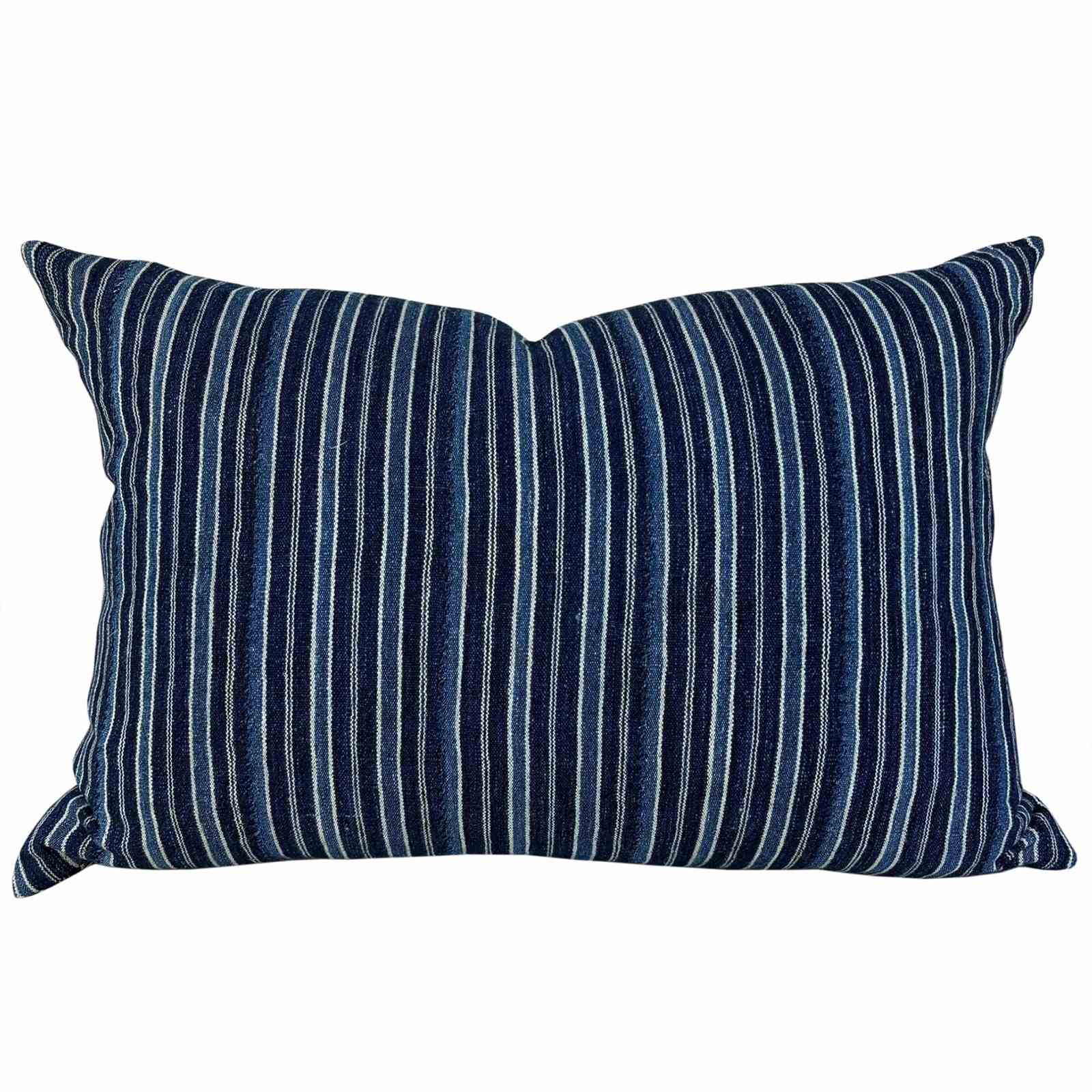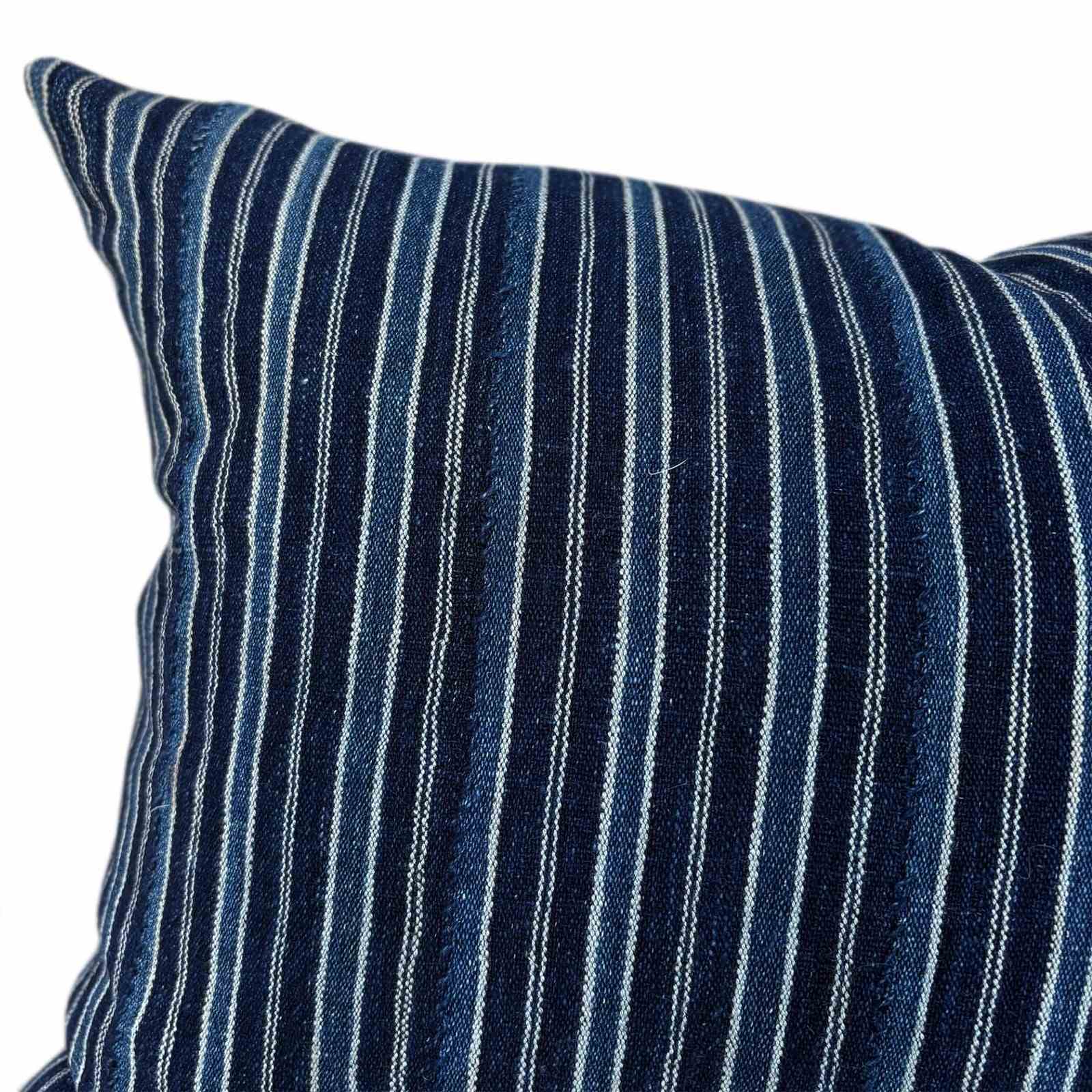This cushion is made from a vintage strip-weave from Benin, West Africa. The cloth was hand woven in soft cotton yarn in two tones of indigo and off white. I've used the cloth for both sides of the cushion, and there is a zip fastener and deluxe feather pad.