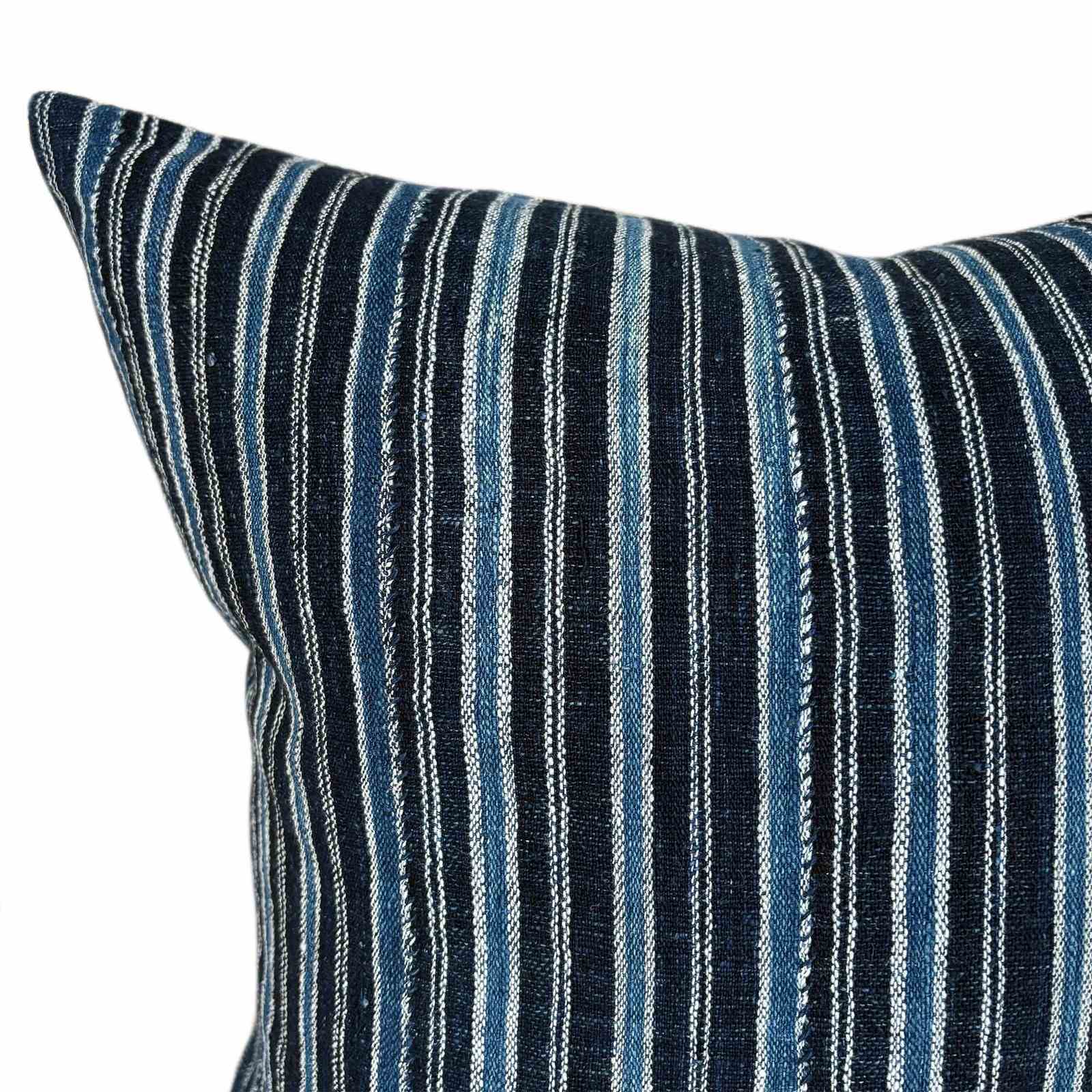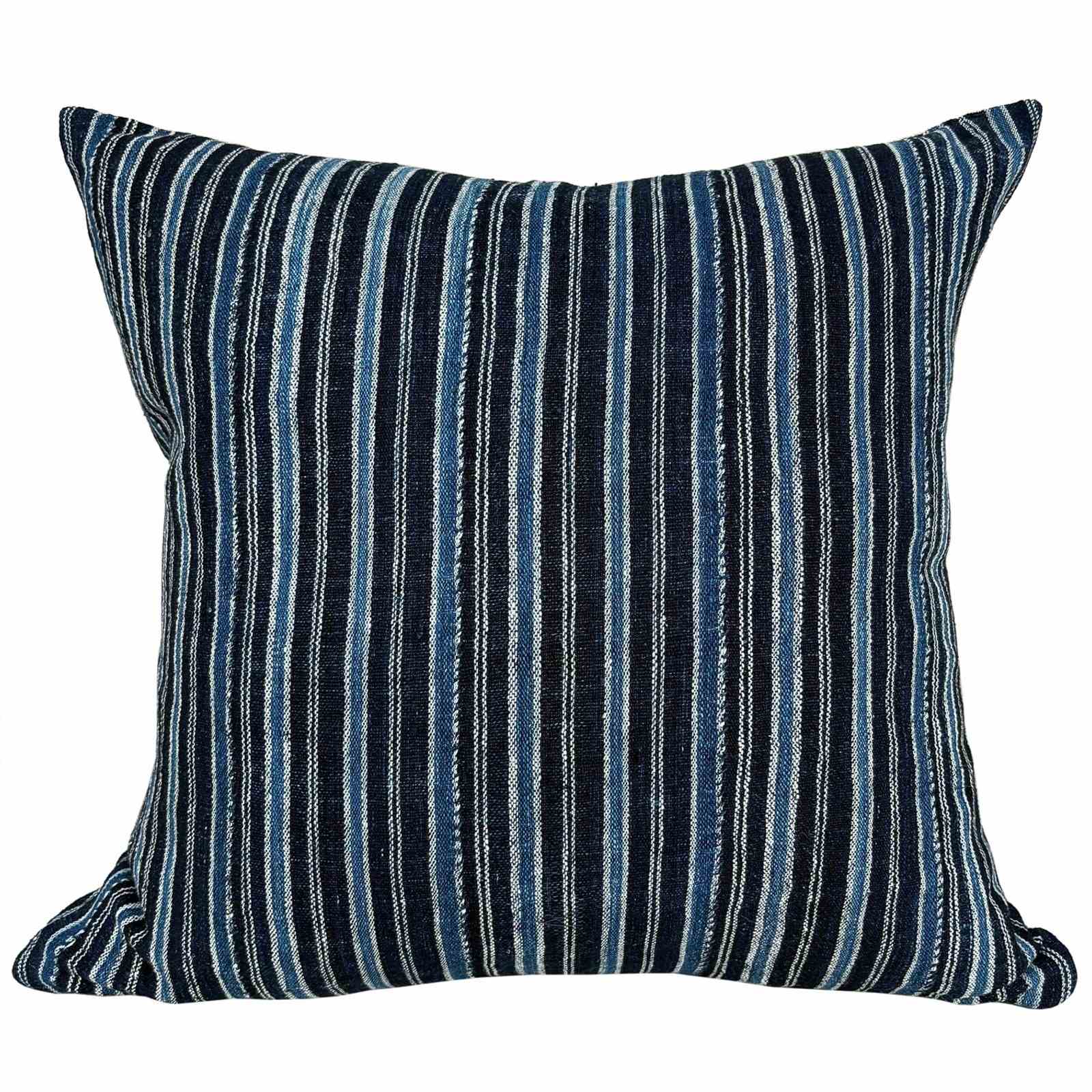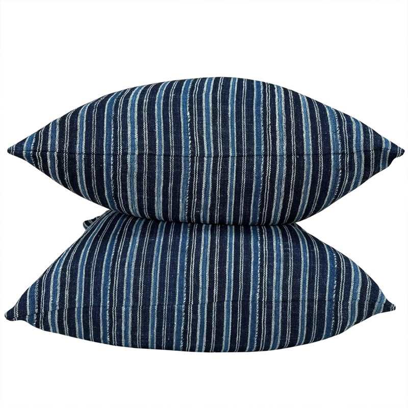 These cushions are made from a vintage strip-weave from Benin, West Africa. The cloth was hand woven in soft cotton yarn in two tones of indigo and off white. I've used the cloth for both sides of the cushion, and there are zip fasteners and deluxe feather pads.