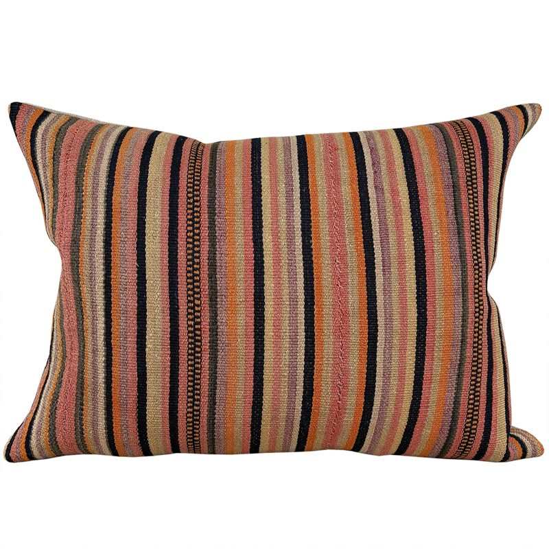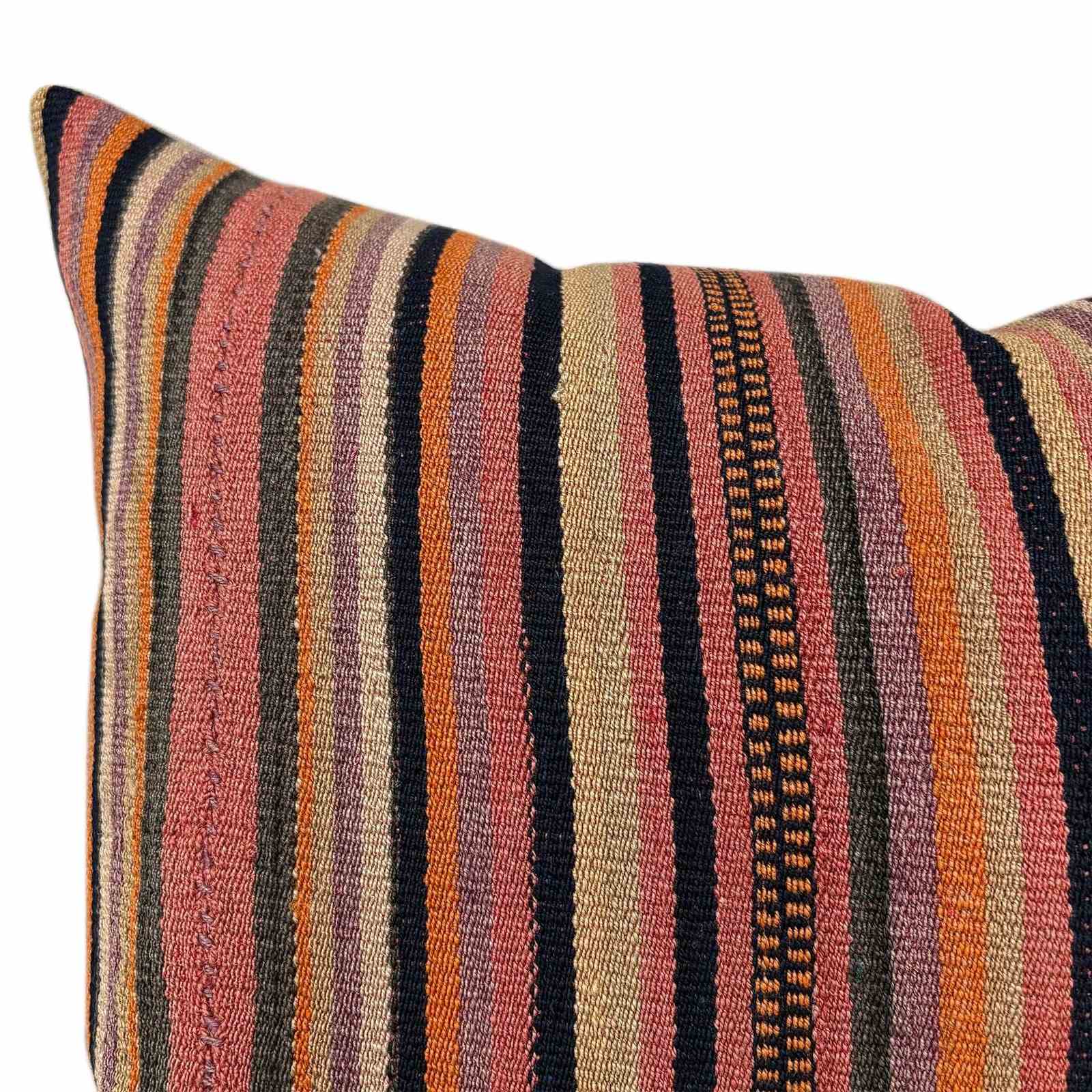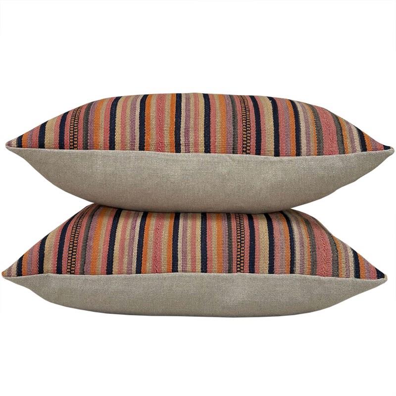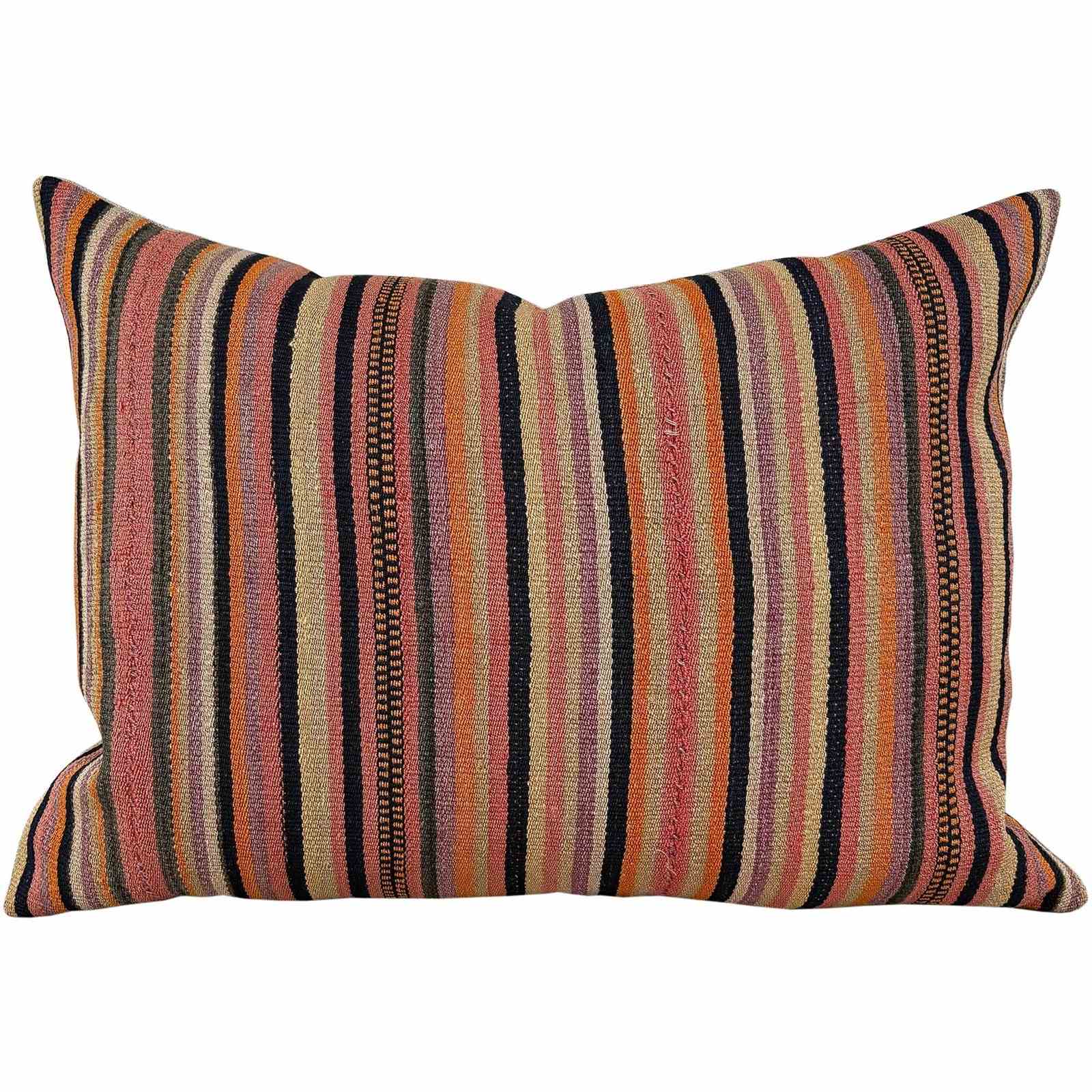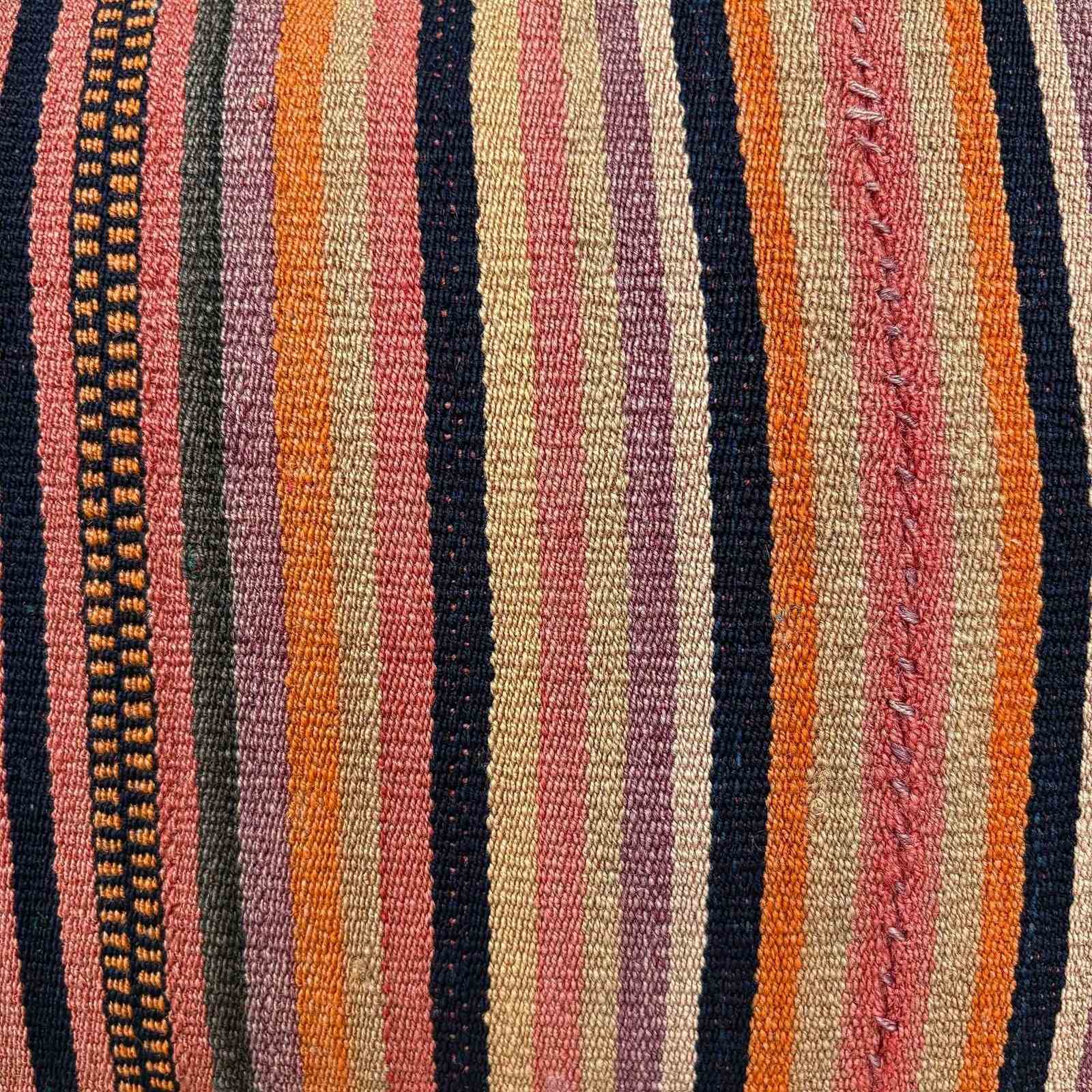 These cushions are made from a vintage Bidjar jajim from Persia. Jajims have a wonderful drape and were traditionally used in nomadic households to cover or store belongings. They were hand loomed on narrow looms and the panels sewn together to make a larger textile. This jajim is woven from wool with a really lovely faded palette of natural colours in pink beige and indigo, and makes beautiful and robust cushions. I've backed the cushions with a heavy natural coloured linen and there are zip fasteners and deluxe feather pads.