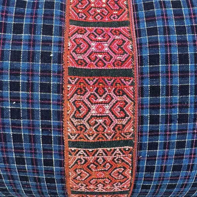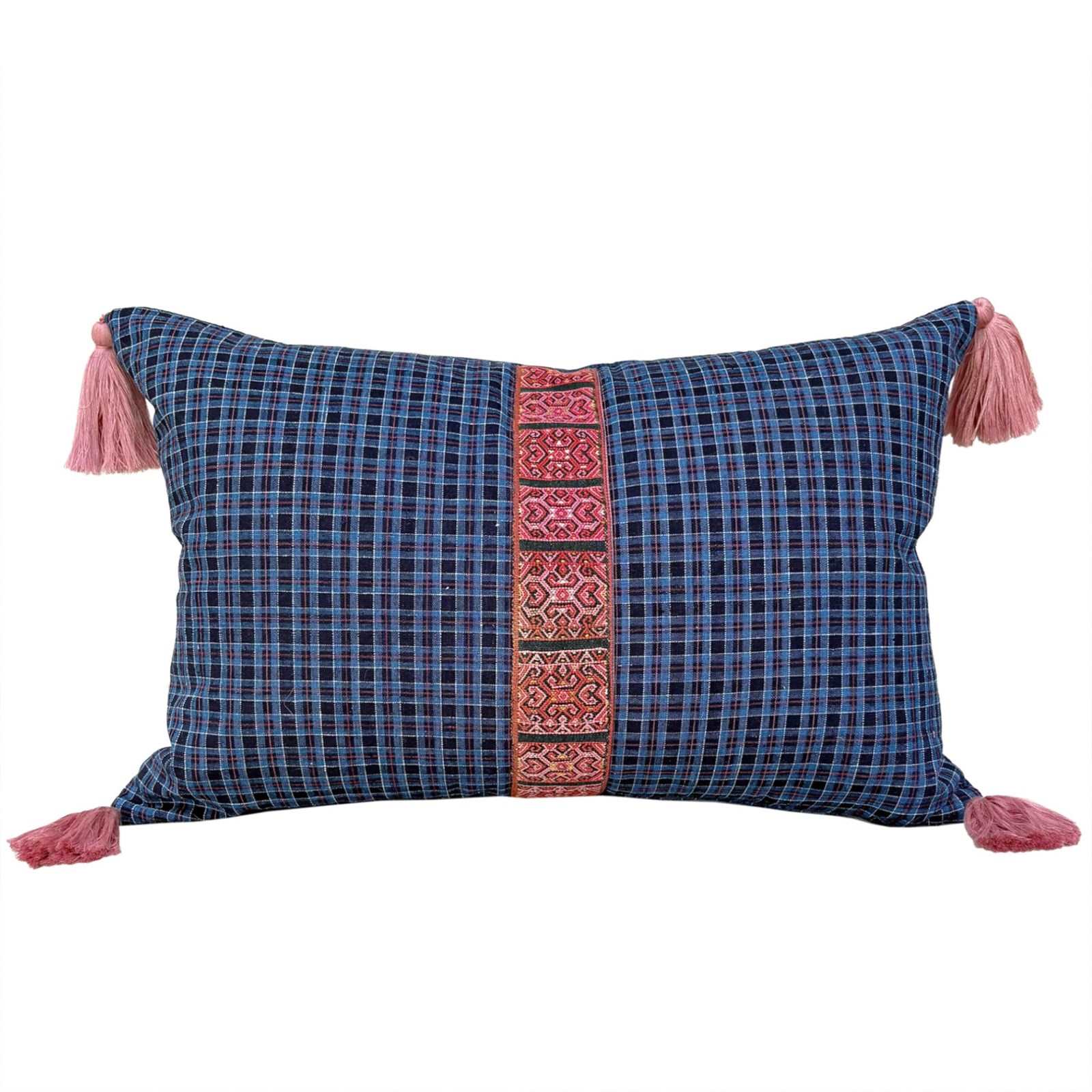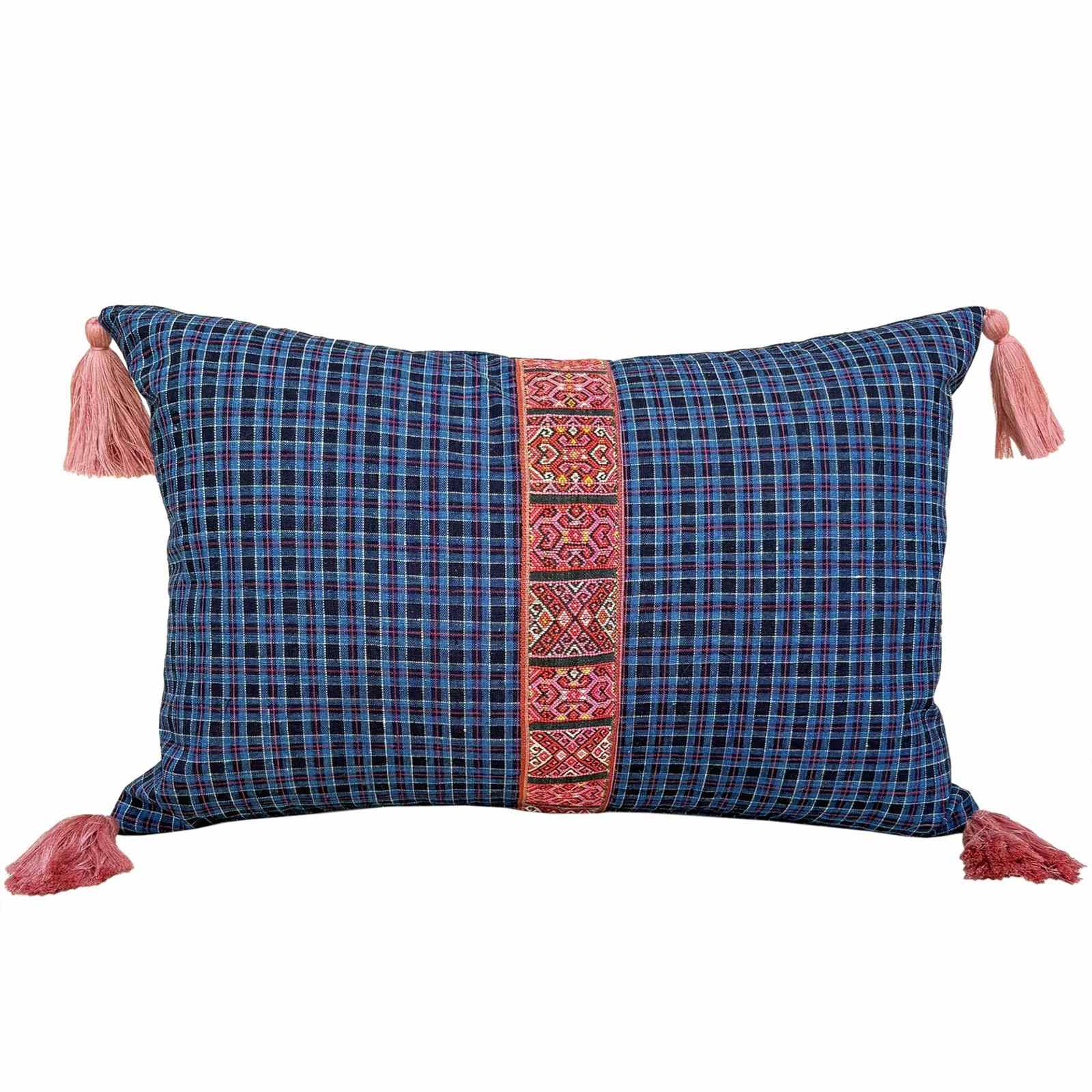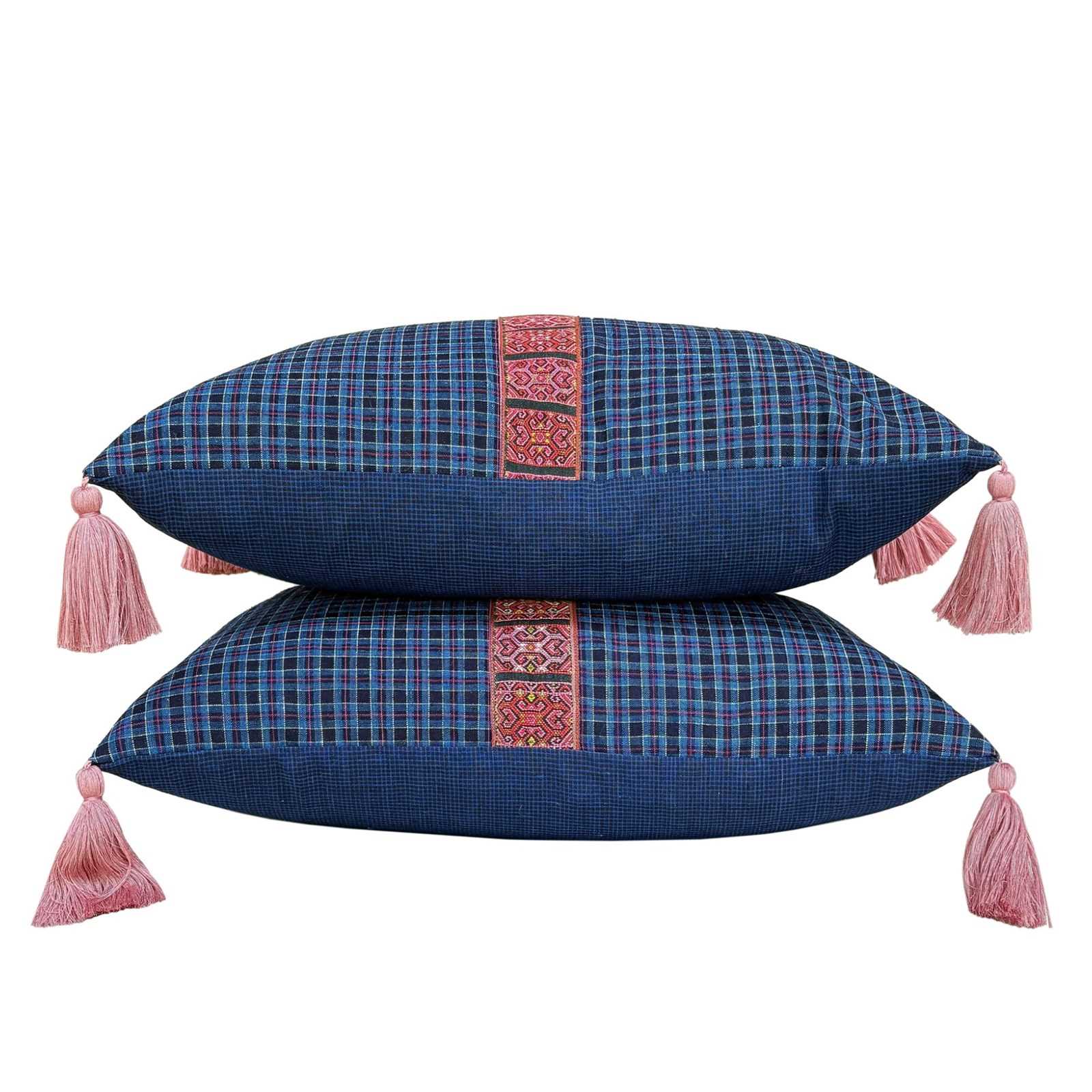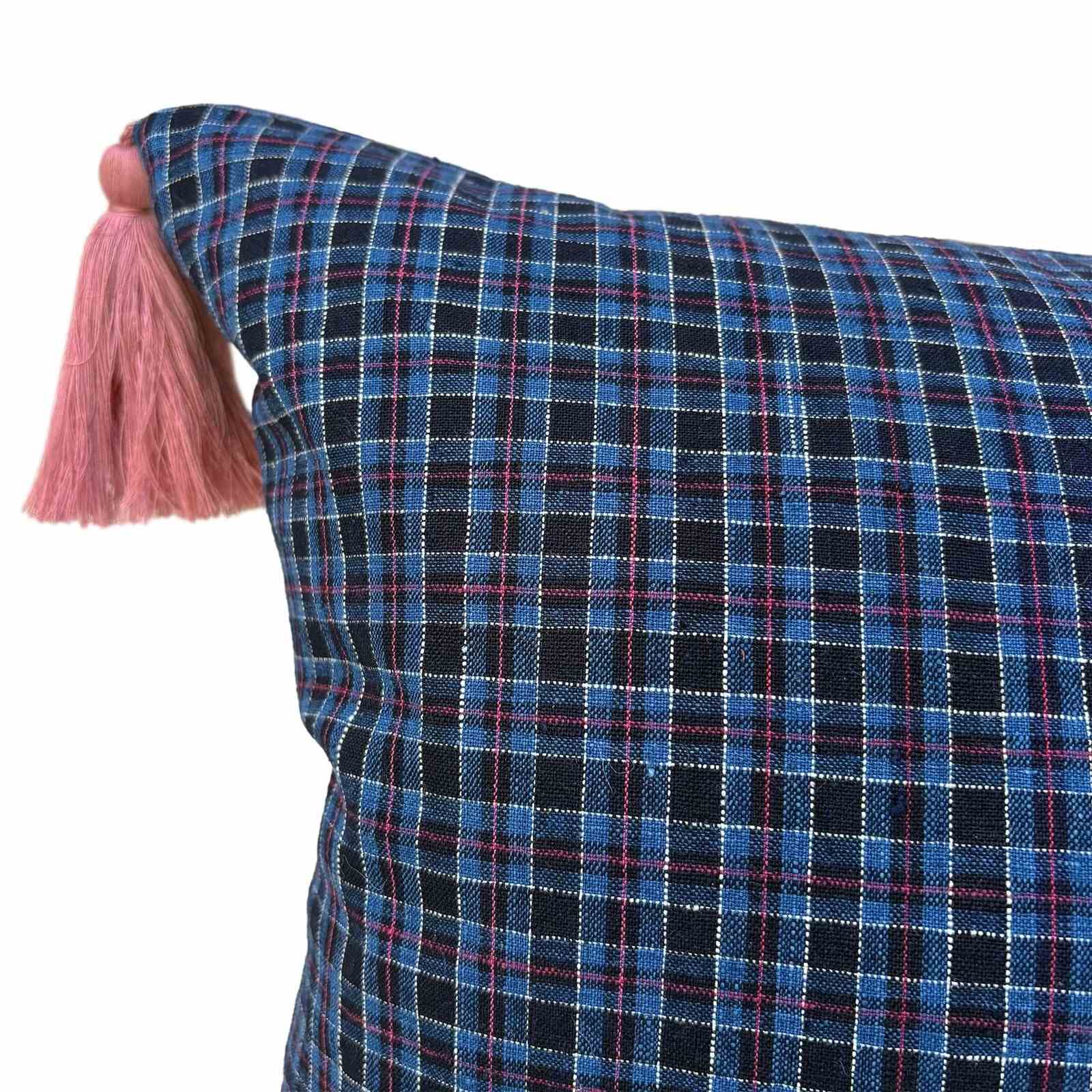 Blue Checked Cushions With Biboki Trim And Tassels