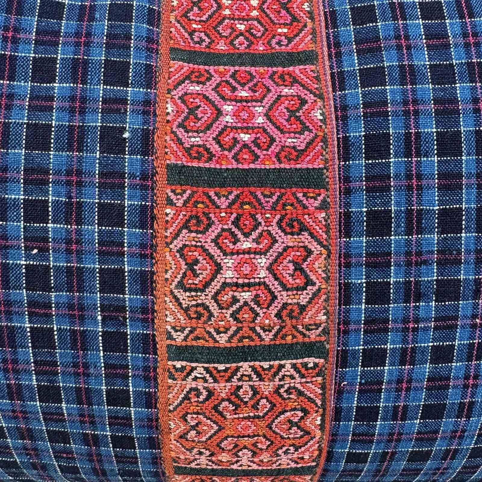 These cushions are made from a vintage hand loomed textile from the Songjiang weaving districts of Shanghai. The cloth was woven on a narrow loom, only 11" wide, so I've joined two widths using the Biboki Timor braid. I've backed the cushions with another vintage hand loomed textile that is coloured with indigo and there are zip fasteners and deluxe feather inserts.