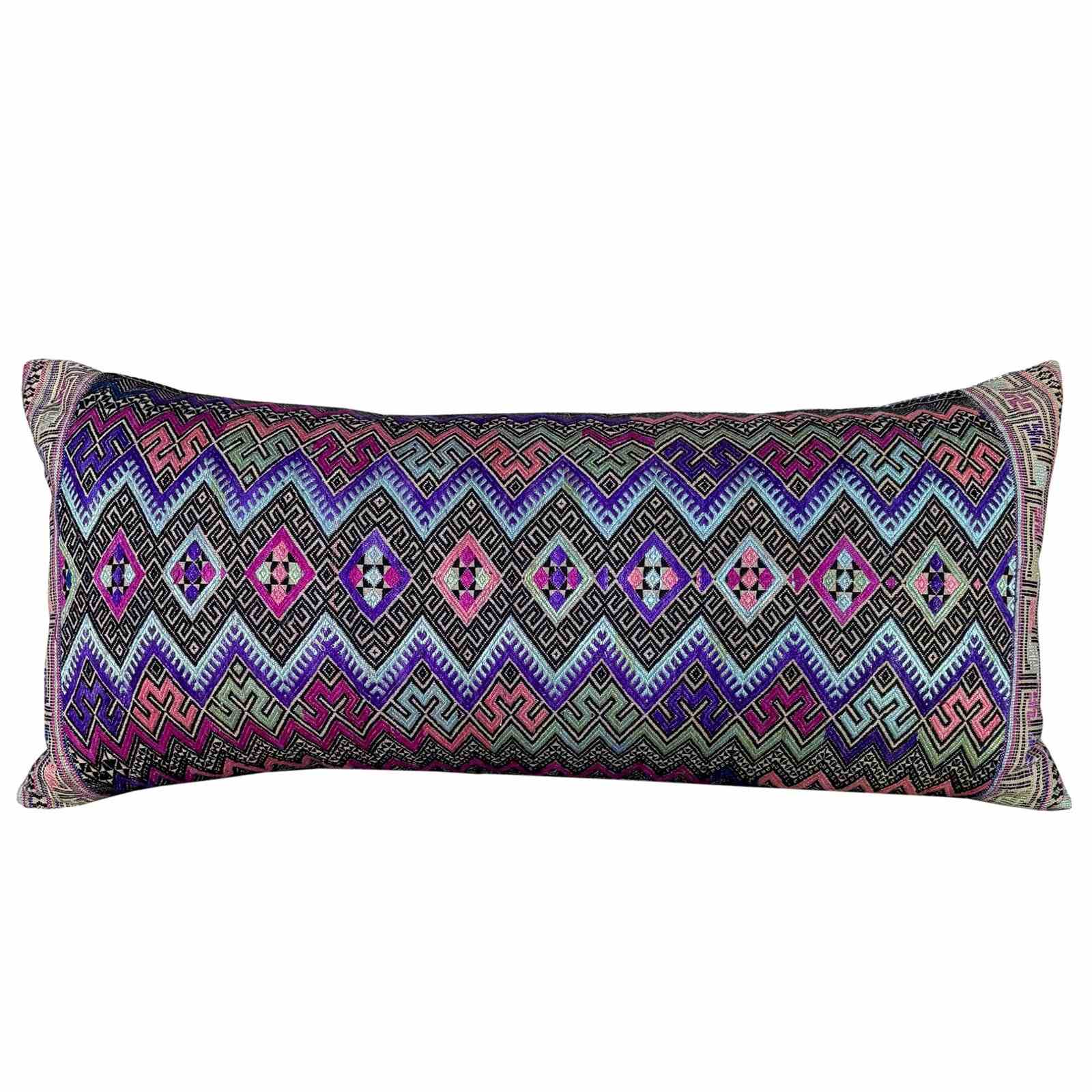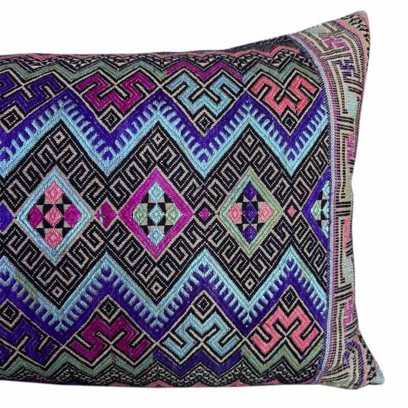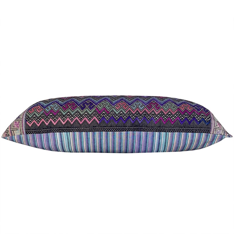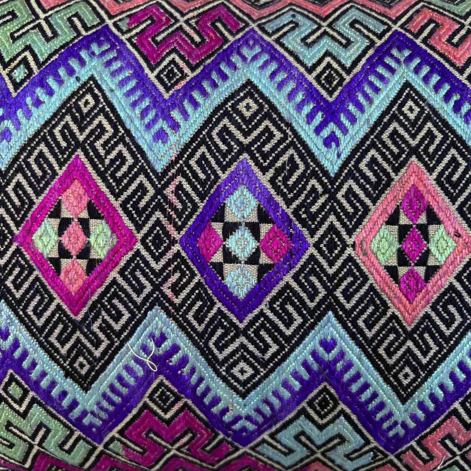 This striking cushion is made from a vintage Buyi minority wedding blanket. The blanket was hand woven in cotton and silk in a wonderful palette of mauves, pinks and black. I've backed the cushion with another vintage hand loomed cotton textile from East China which reflects some of the colours on the front. There is a zip fastener and deluxe feather pad.